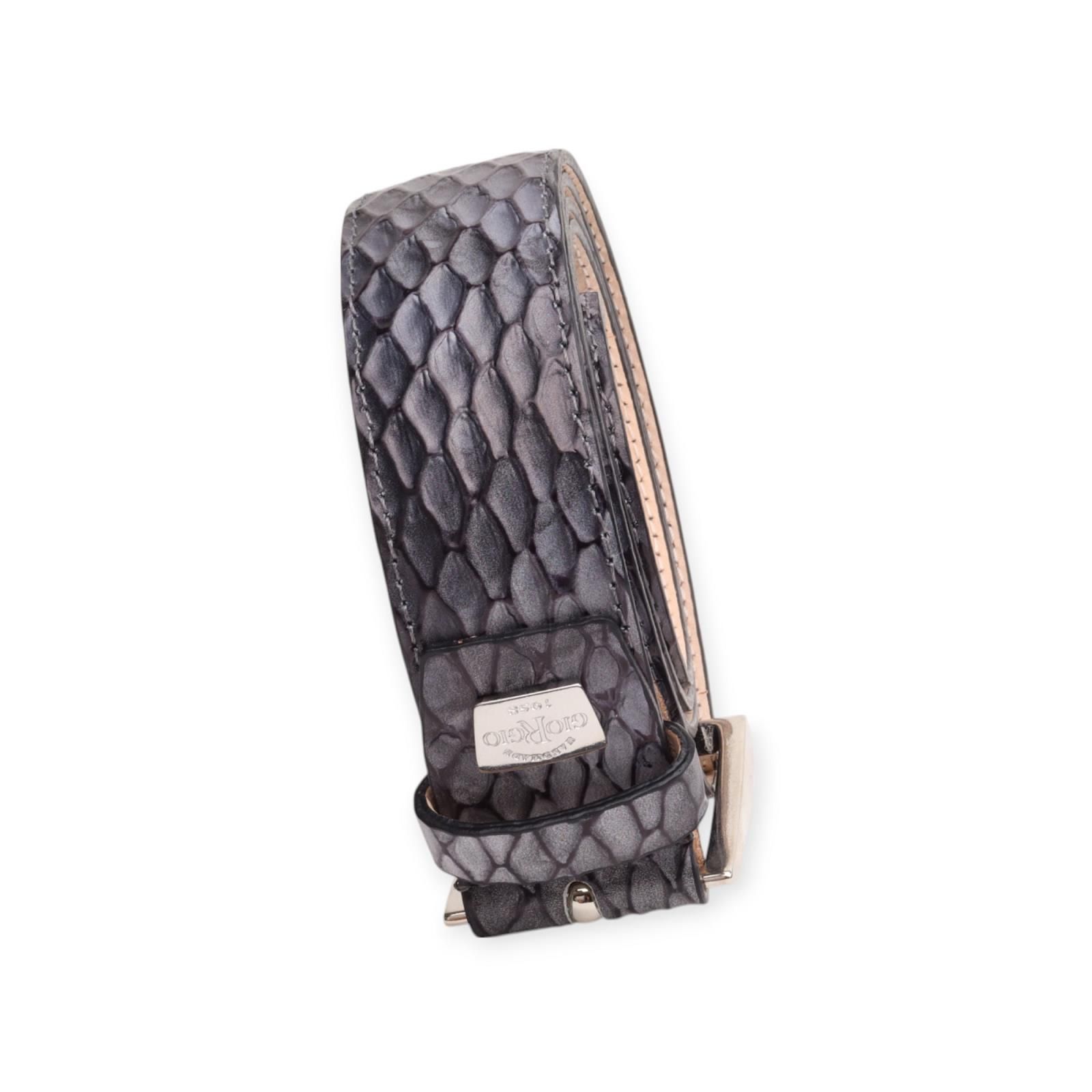 Riem van Giorgio voor heren. Deze riem is in prachtig geschubt blauw/grijs leder. Bijpassend met de schoenen ref nr: 19608. Wij kopen steeds de grootste riem en passen deze mooi op maat van de klant aan.