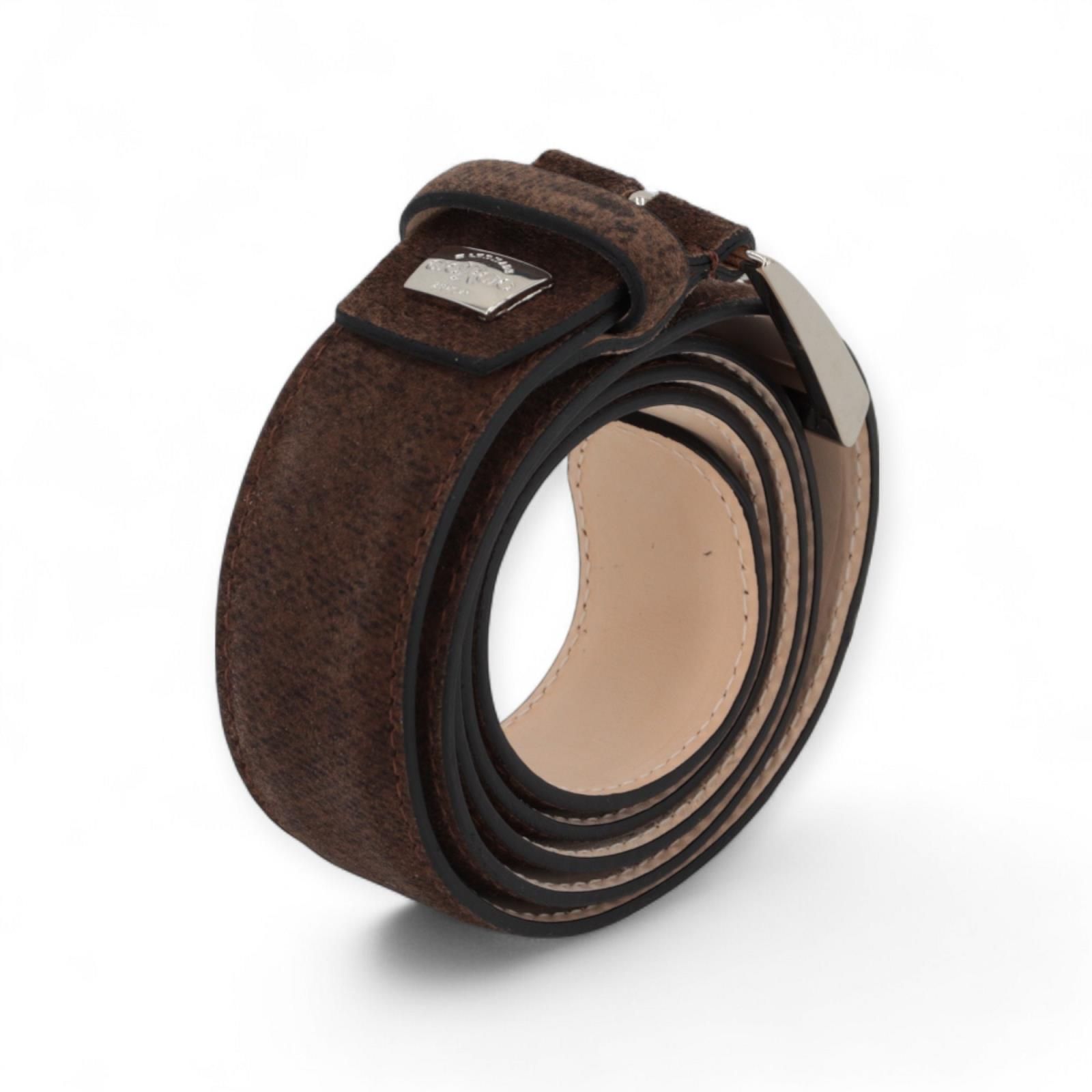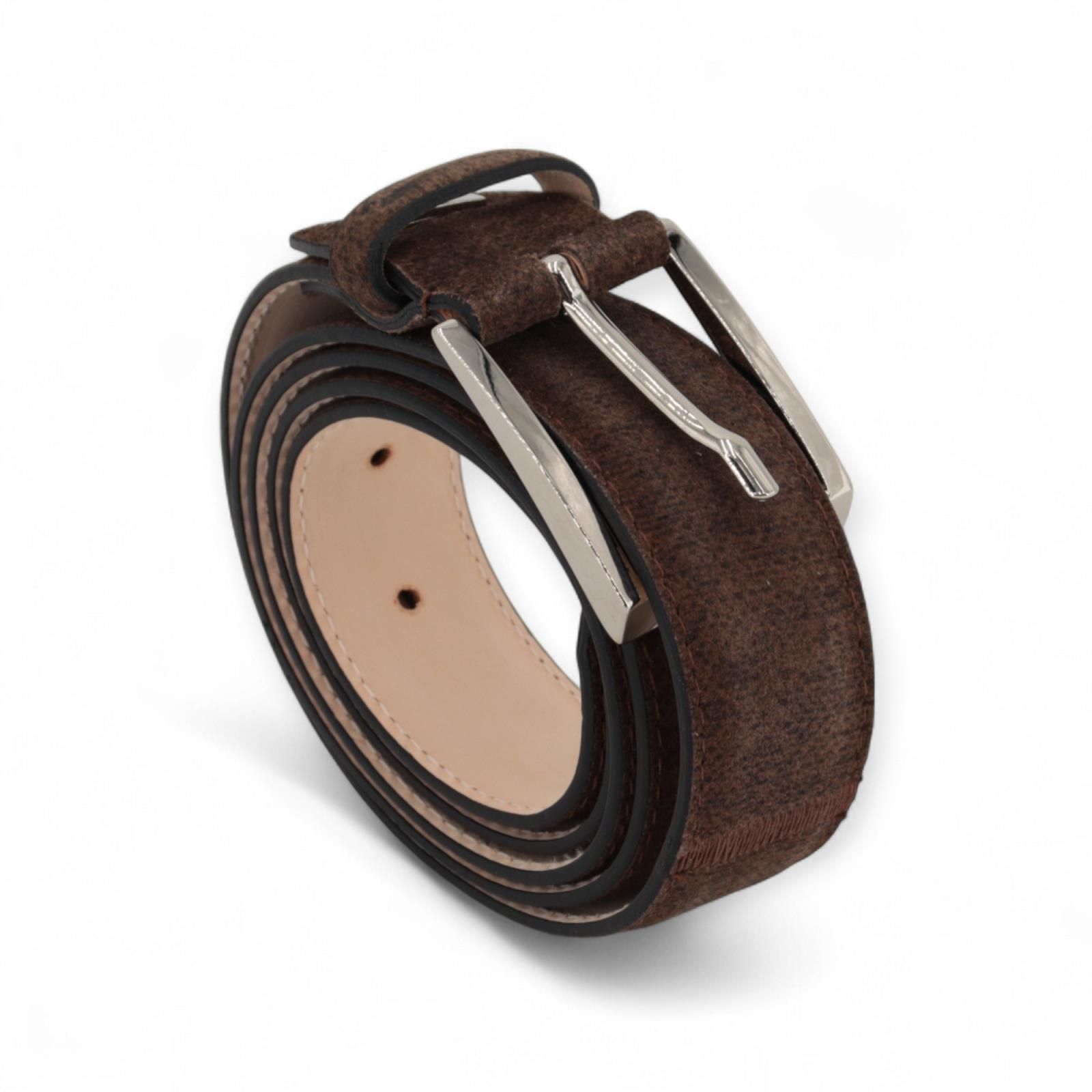Riem van Giorgio voor heren. Deze riem is in donkerbruin geprint suède leer. Combineer deze met bijpassende schoenen. Deze riem is 115cm, indien nodig passen we deze mooi aan op maat van de klant.