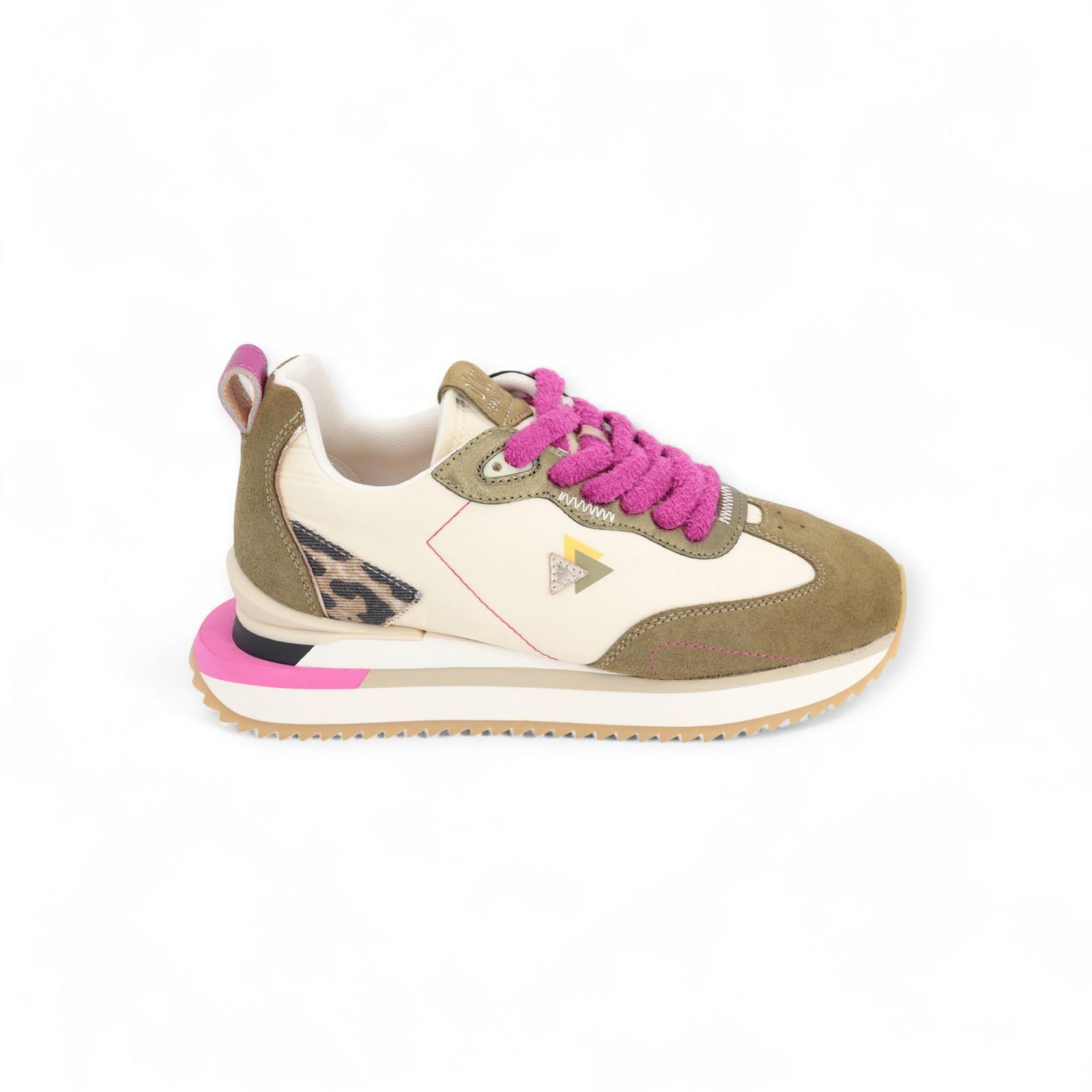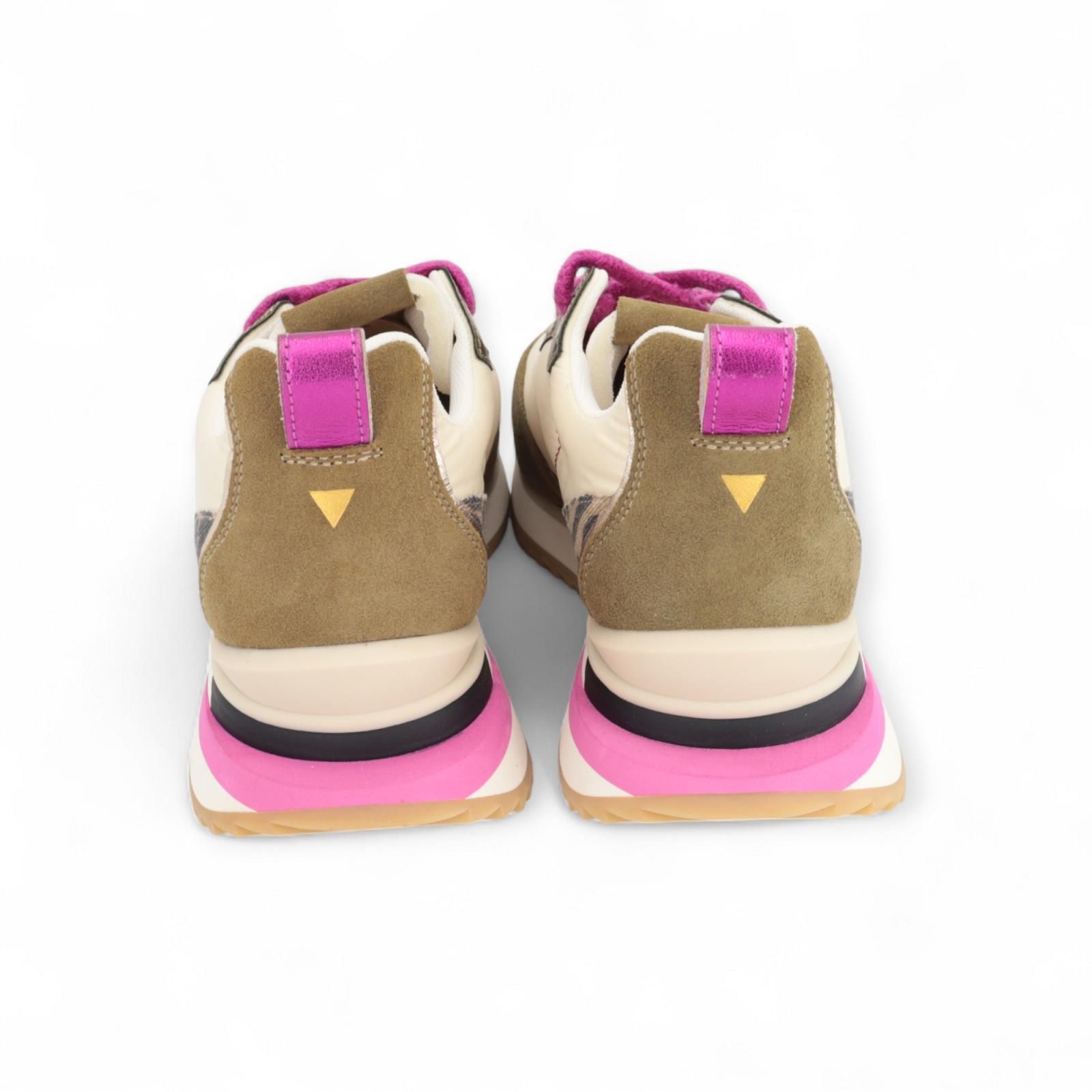 Sneaker Lenox Iris van 0’105 voor dames. Dit runnermodel met een creme kleurige nylon als basis biedt een elegante lichtheid, versterkt door inzetstukken van kaki en metallic kaki suède. Fuchsia accenten verlichten het silhouet en voegen een levendige en gedurfde noot toe. De binnenzool is uitneembaar. Heeft nog een extra paar goud/beige veters.