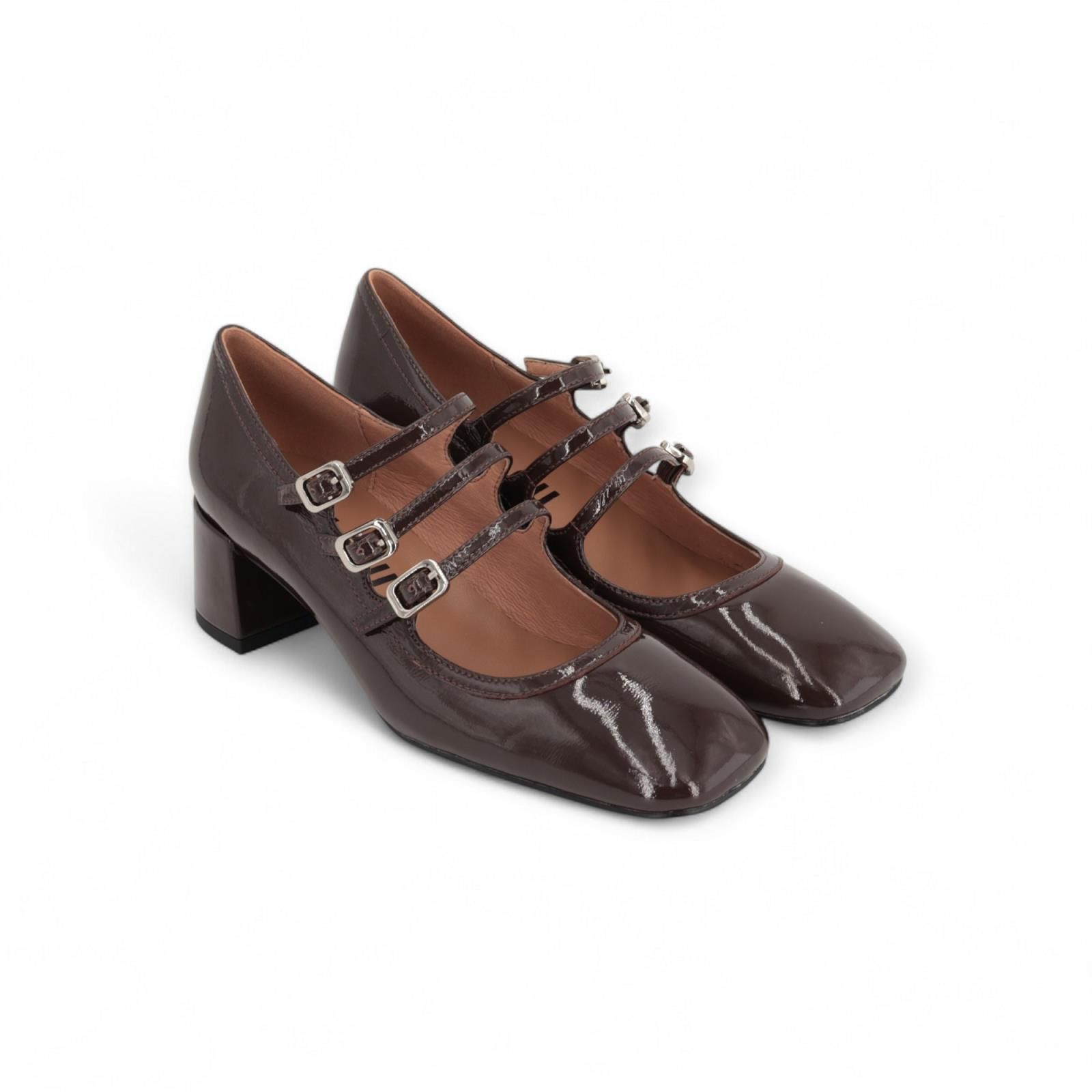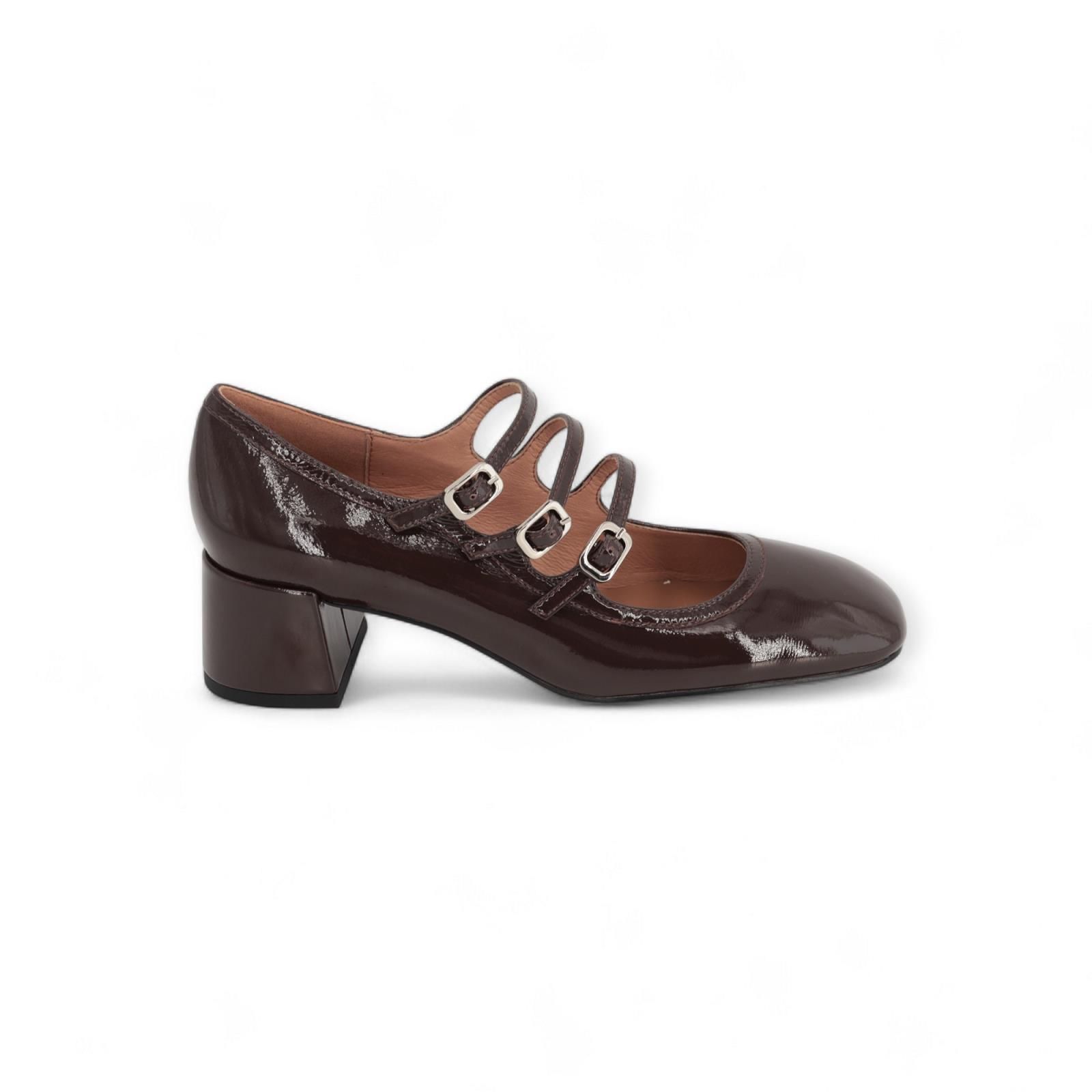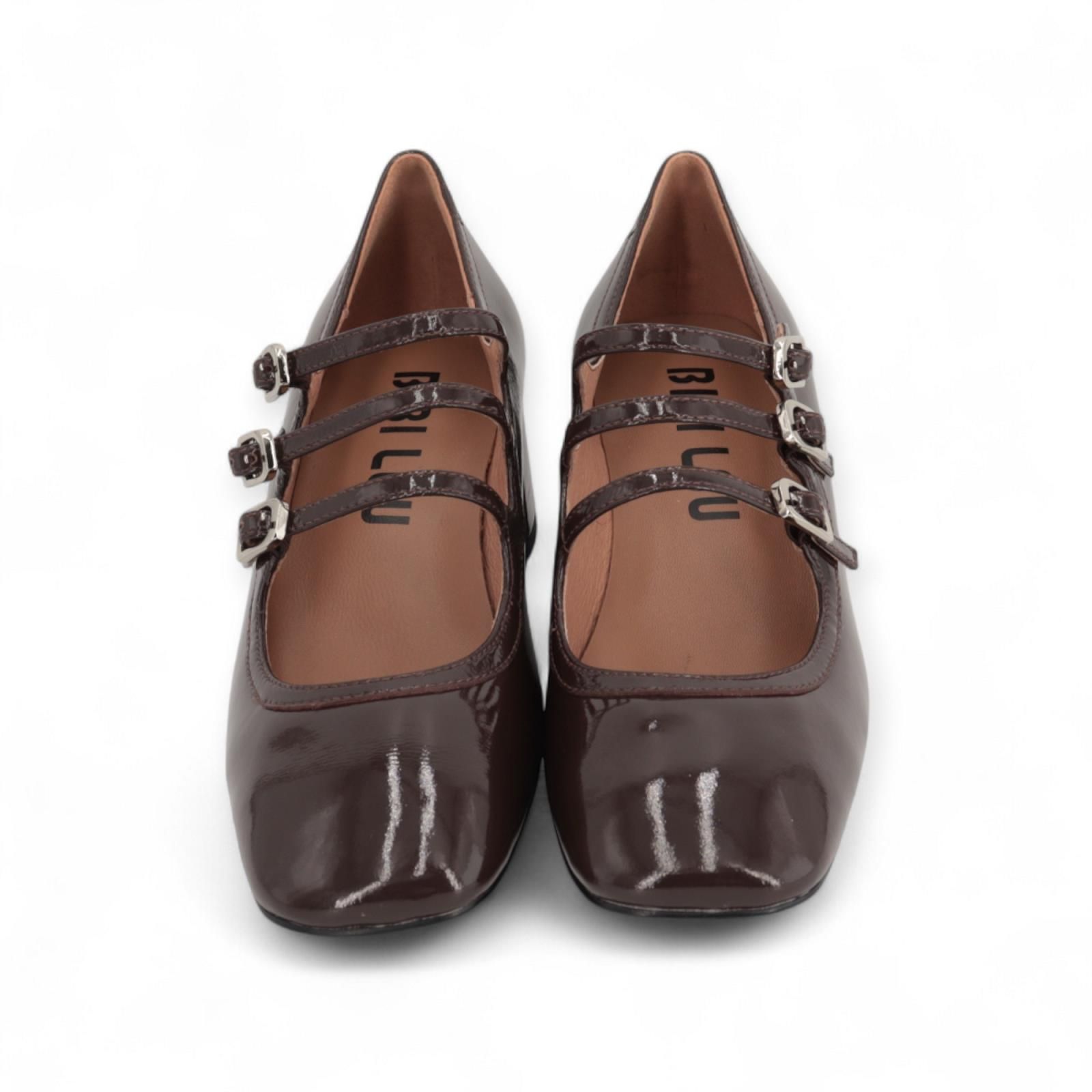Pump van Bibi Lou voor dames. Deze pump is in bruin lakleer met een ver uitgesneden carré neus. Heeft 3 bandjes over de wreef met een gouden gespsluiting. Is op een blokhakje van 5-5.5cm hoog met een antislipzool.