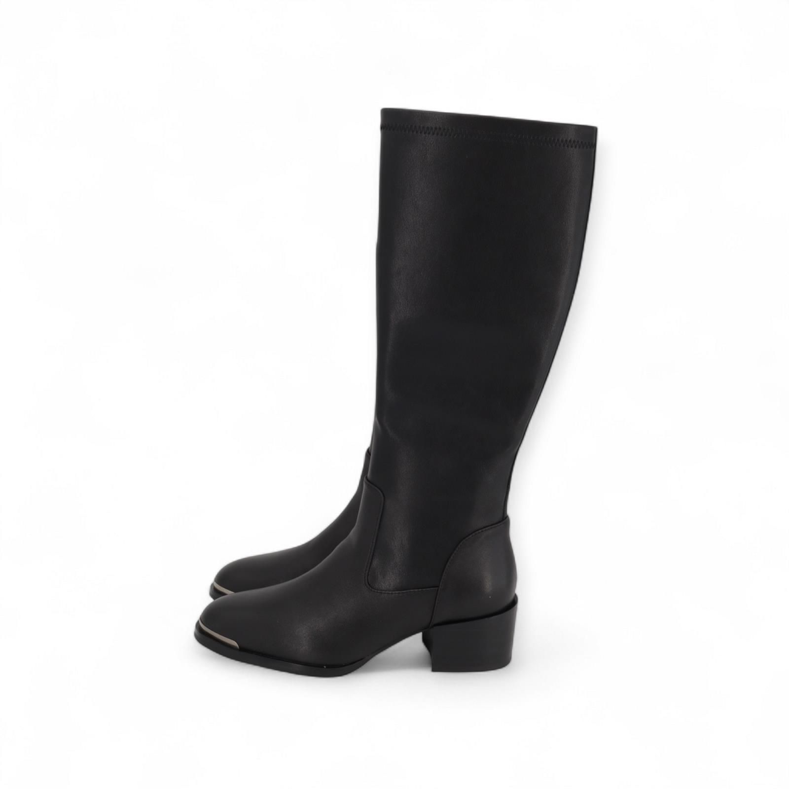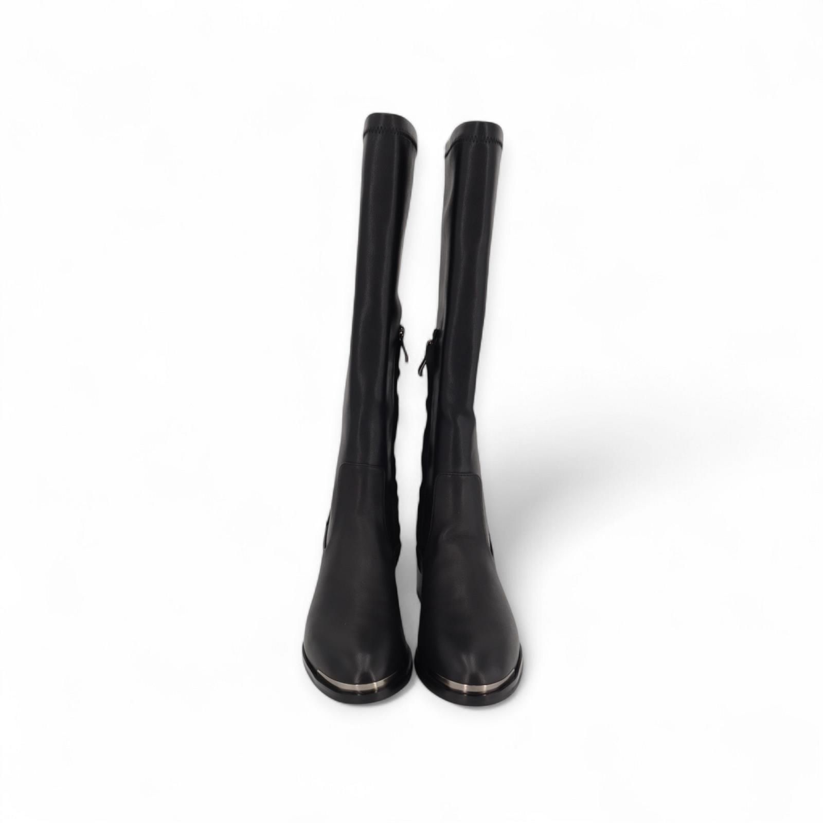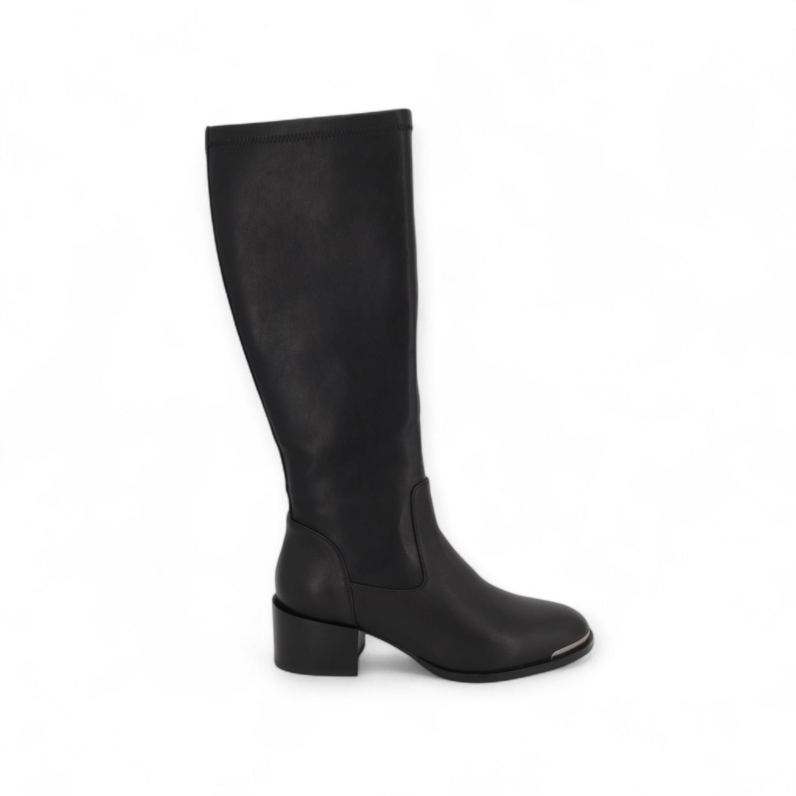 Laars BM5302X van Bruno Premi voor dames. Deze lange laars is in zwart leer. Mooi afgewerkt met een ronde neus met zilver detail rond de zool vooraan. Is met een halve ritssluiting aan de zijkant en heeft een blokhakje van 5cm hoog.