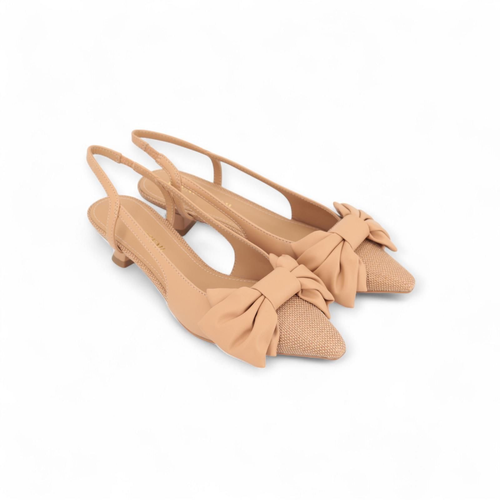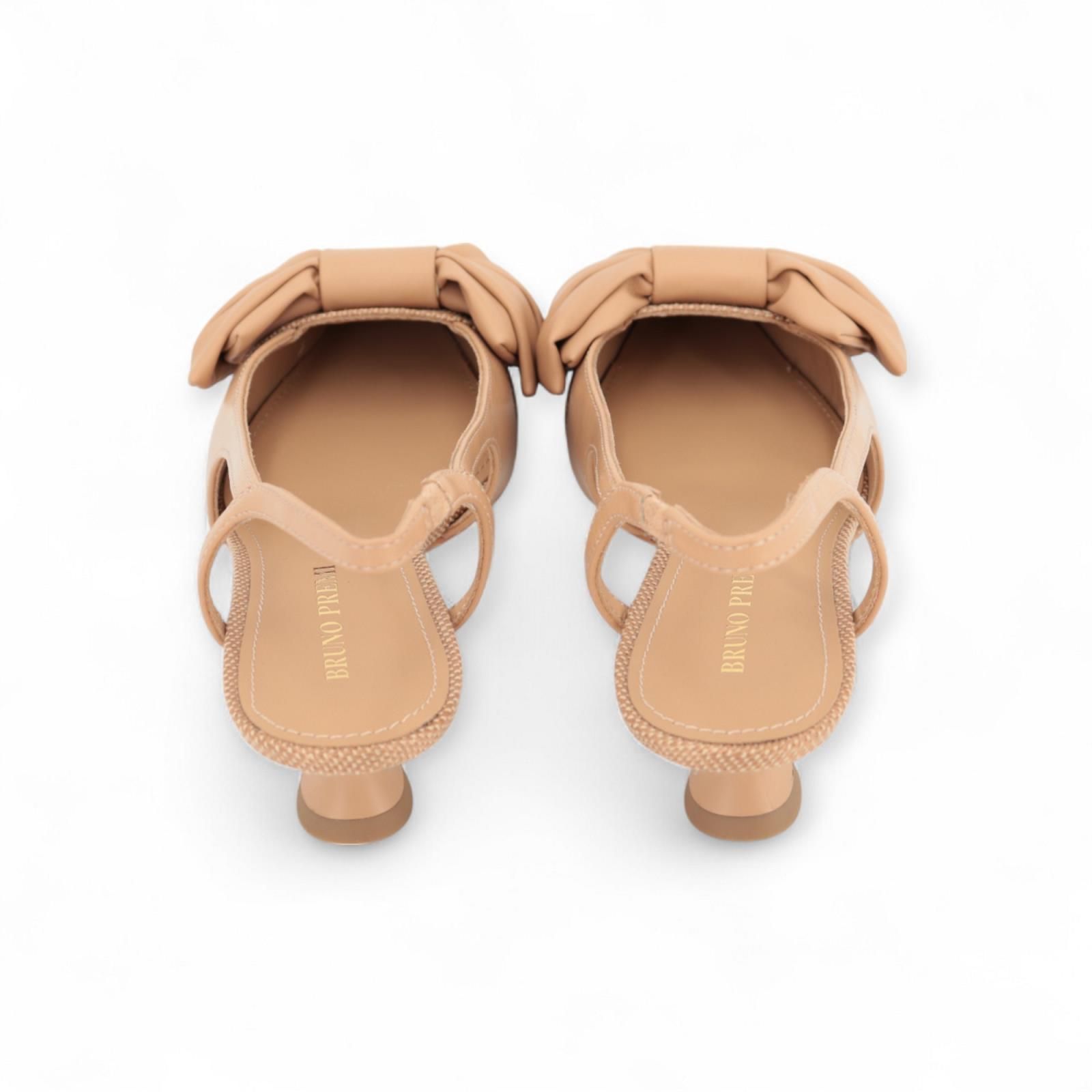 Pump Gao Coa van Bruno Premi voor dames. Dit slingback model staat voor elegantie en stijl! Is met een open hieltje en een scherpe top. Is gemaakt van beige leder en canvas met een opvallend two-tone effect. De leren strik voegt nog een extra klasse toe. Heeft een bandje rond de hiel met een rekkertje. Is op een klein hakje van 3-3.5cm hoog.