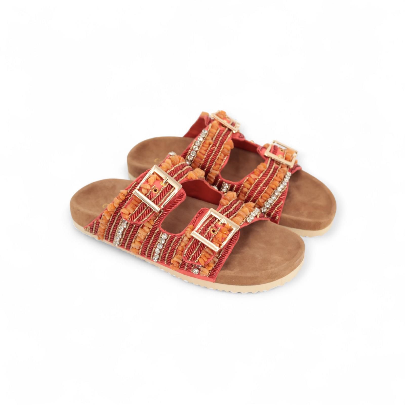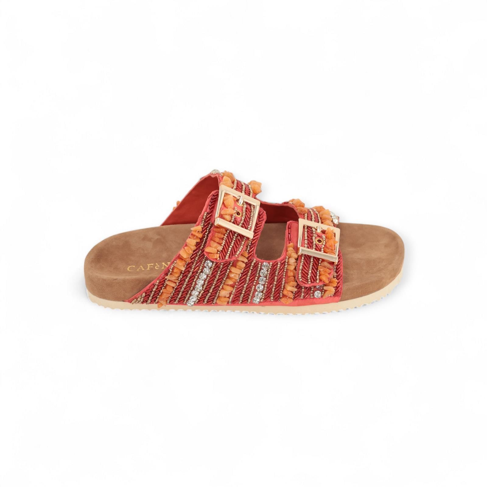 Slipper van Cafè Noir voor dames. Deze sandaal is in oranje/coral met verschillende details en steentjes afgewerkt. Heeft 2 verstelbare gespsluitingen om aan te passen naar breedte. Is op een suède voetbed.