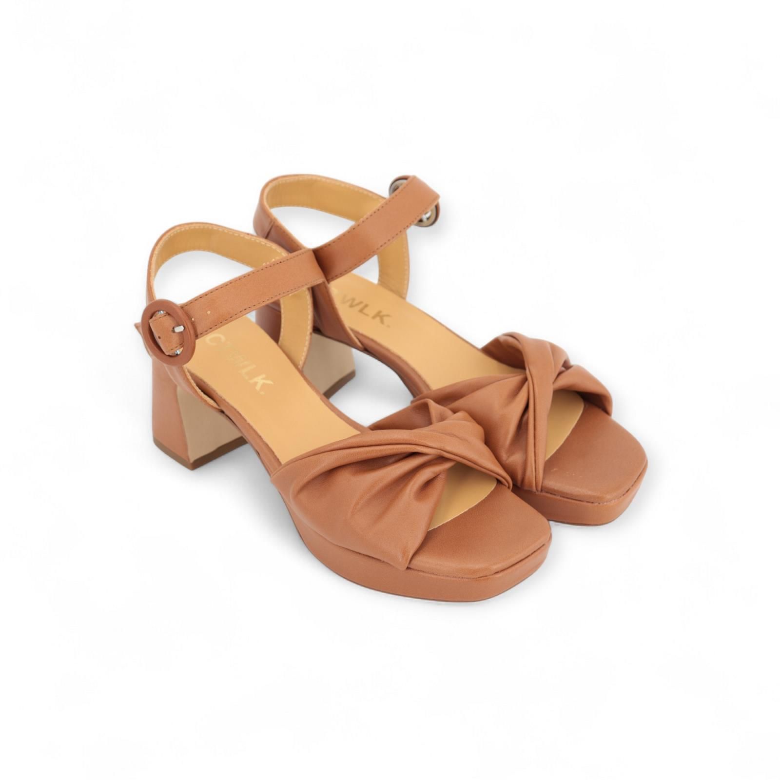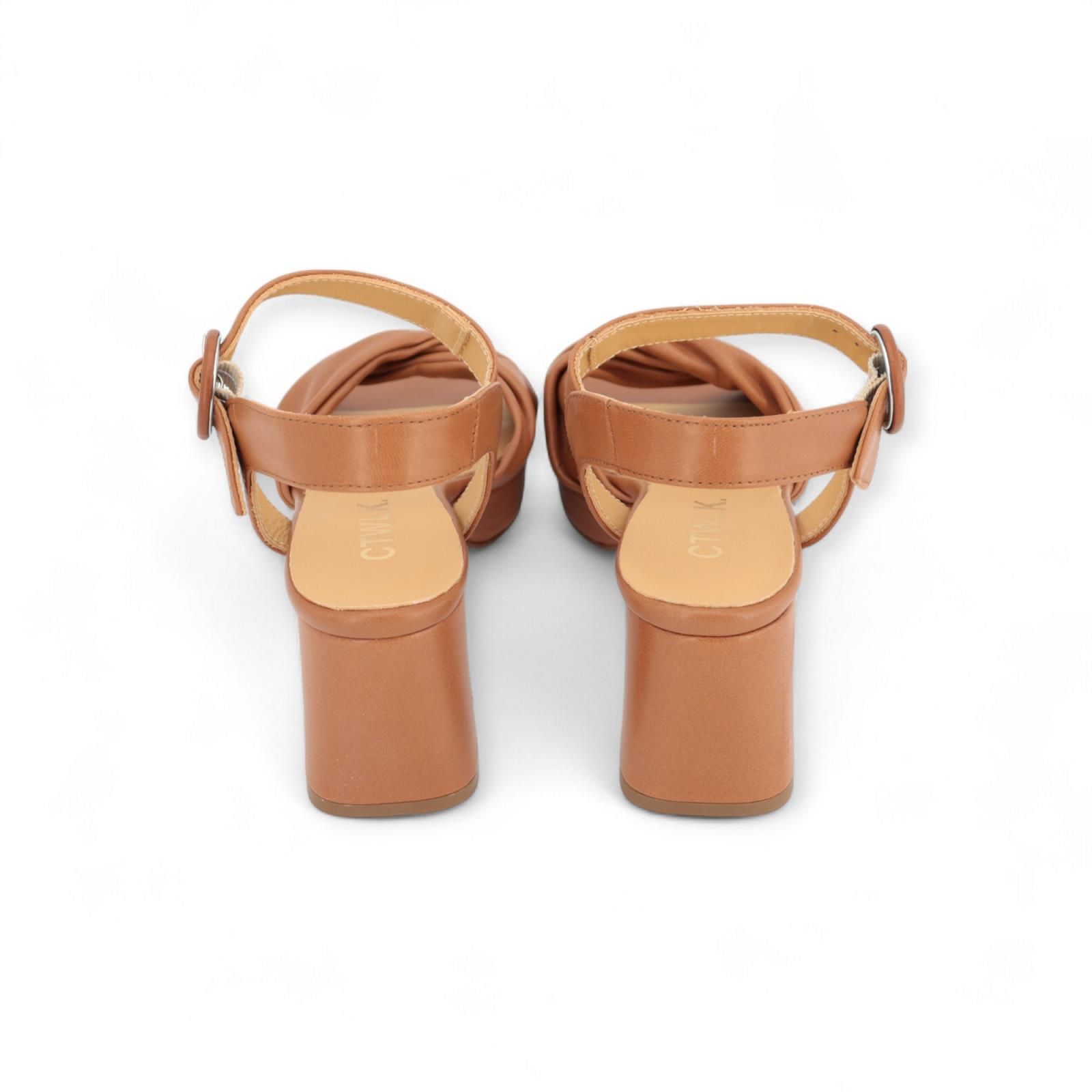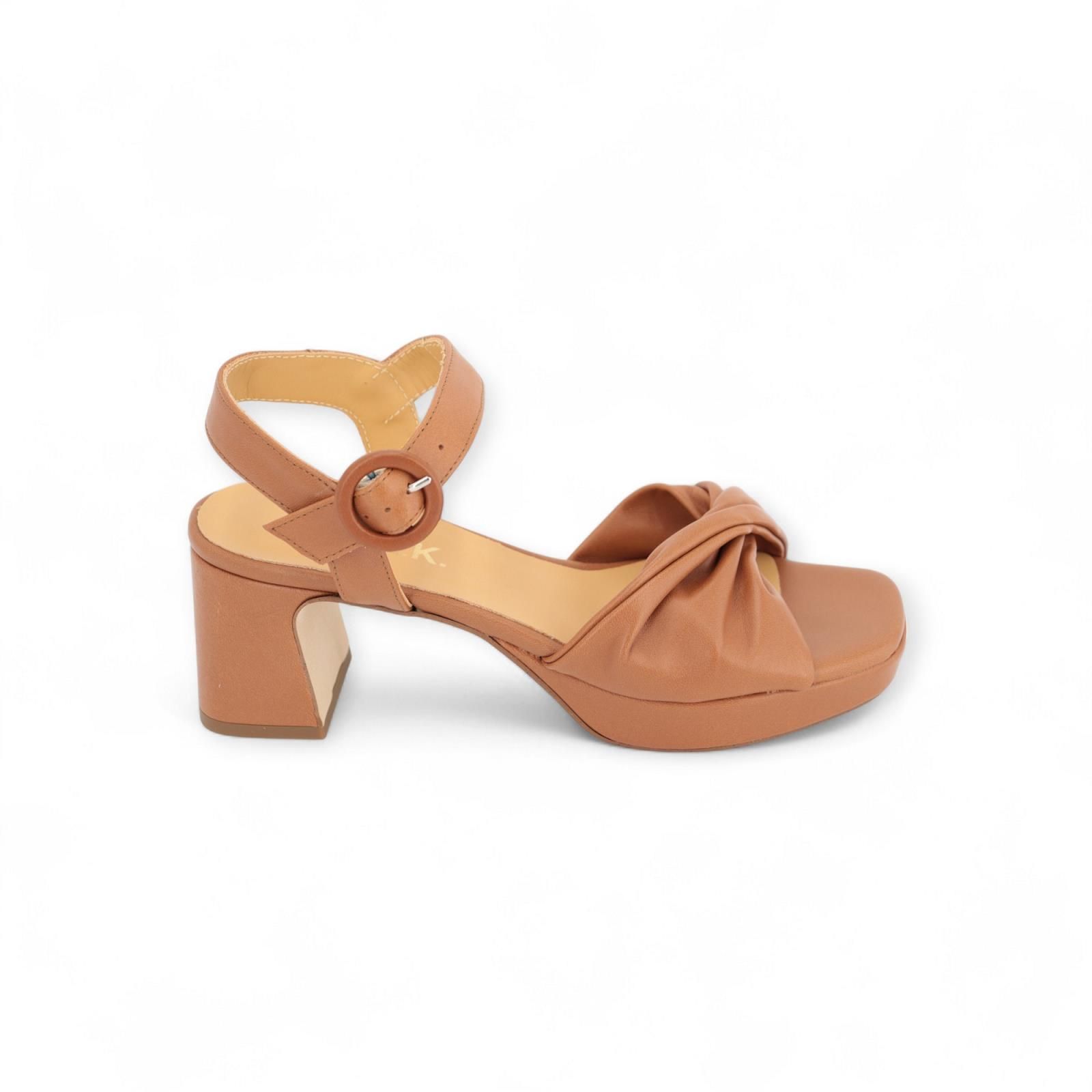 Ankara Catwalk sandaal voor dames. Dit elegant sandaaltje in volledig cognac leder is mooi afgewerkt met een lus vooraan. Achteraan aan de hiel vast met een gespsluiting rond de enkel. Deze hak is +/- 5cm hoog.