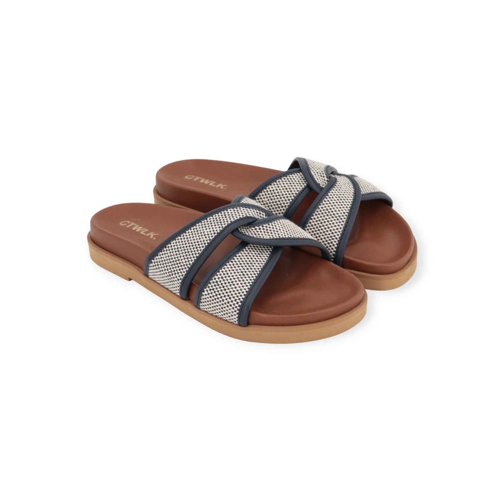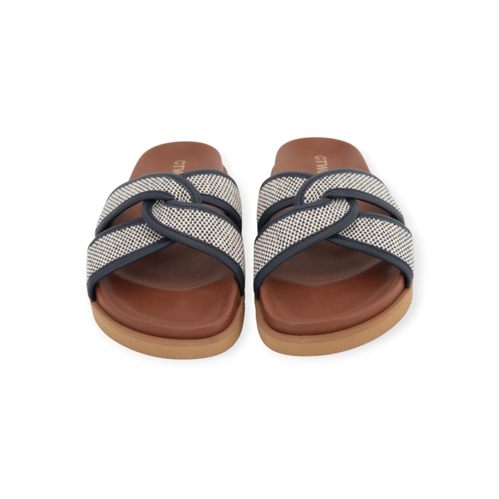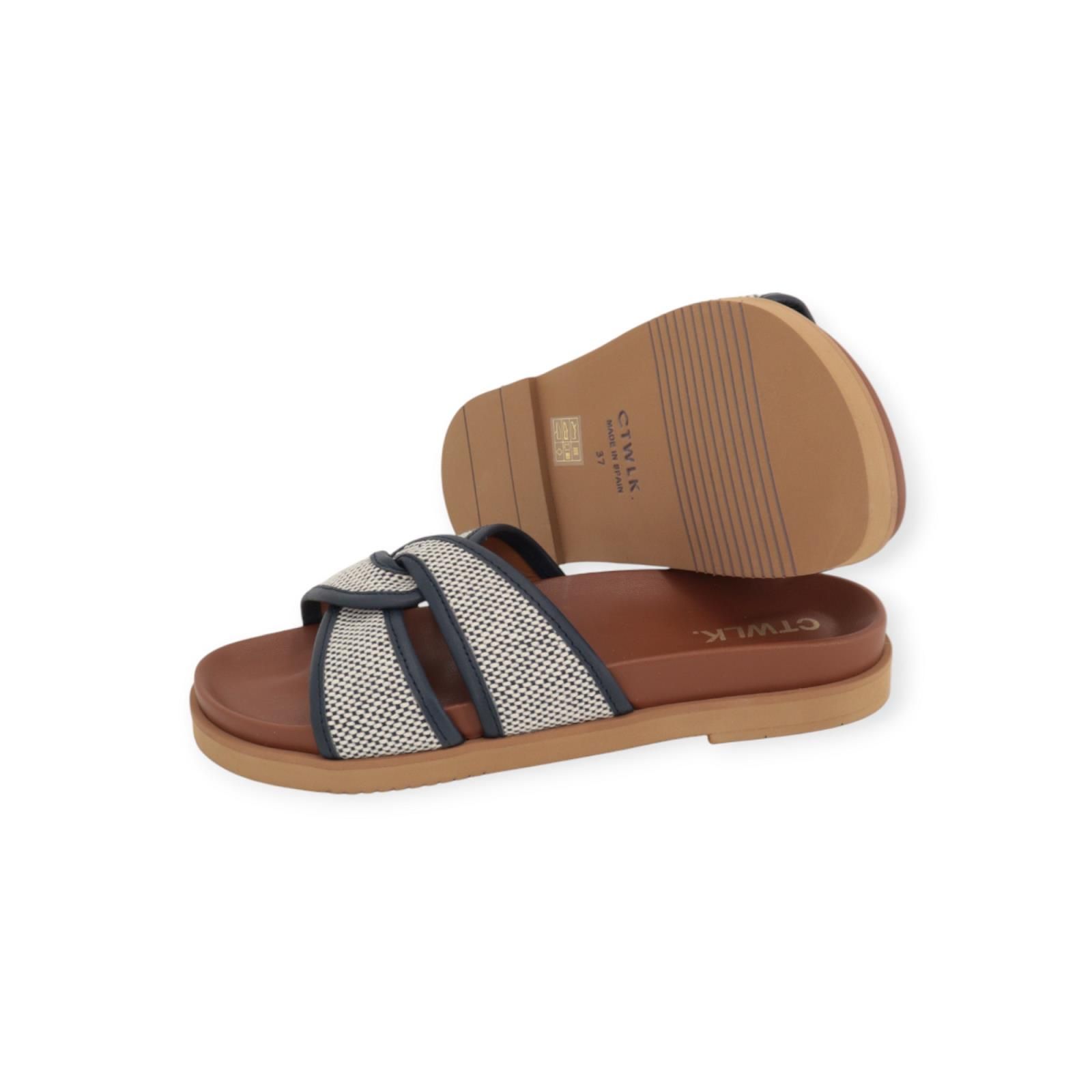 Slipper Gabon van CTWLK voor dames. Deze slipper is in blauw leer met raffia. Is met 2 banden over de wreef die mooi gekruist zijn. Heeft een aangenaam voetbed met een lichte microzool.