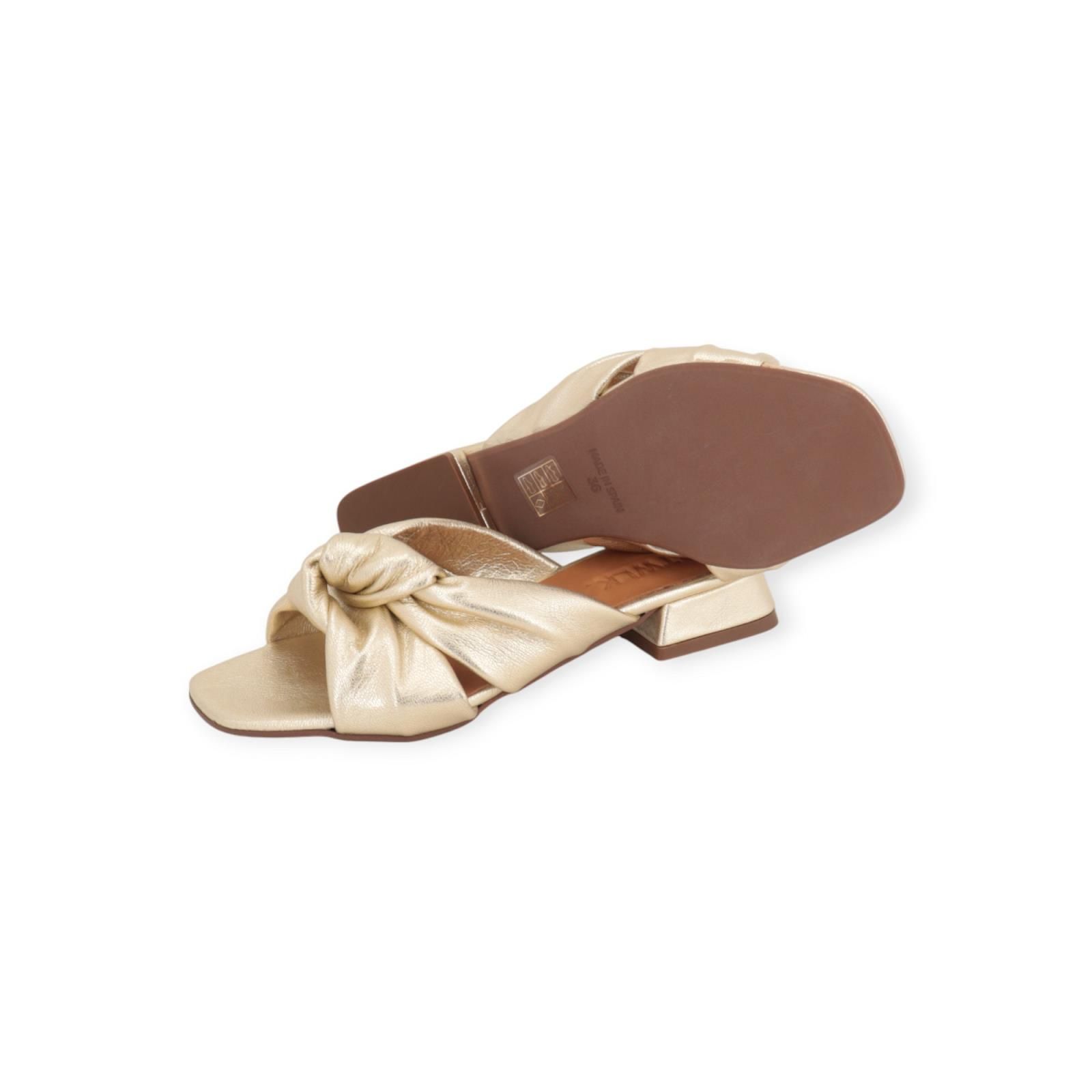 Slipper Gipsy van CTWLK voor dames. Dit elegant muiltje is in goud shining leer. Heeft een gekruiste band over de wreef die mooi samenkomt in het midden met een knoop. Dit muiltje is op een fijn hakje van 3cm hoog. De buitenzool is in leer.