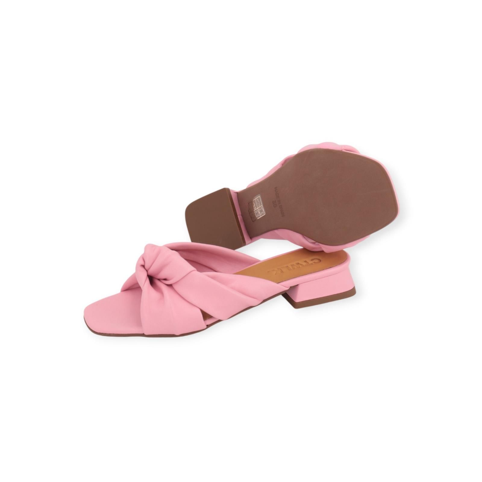 Slipper Gipsy van CTWLK voor dames. Dit elegant muiltje is in roze leer. Heeft een gekruiste band over de wreef die mooi samenkomt in het midden met een knoop. Dit muiltje is op een fijn hakje van 3cm hoog. De buitenzool is in leer.