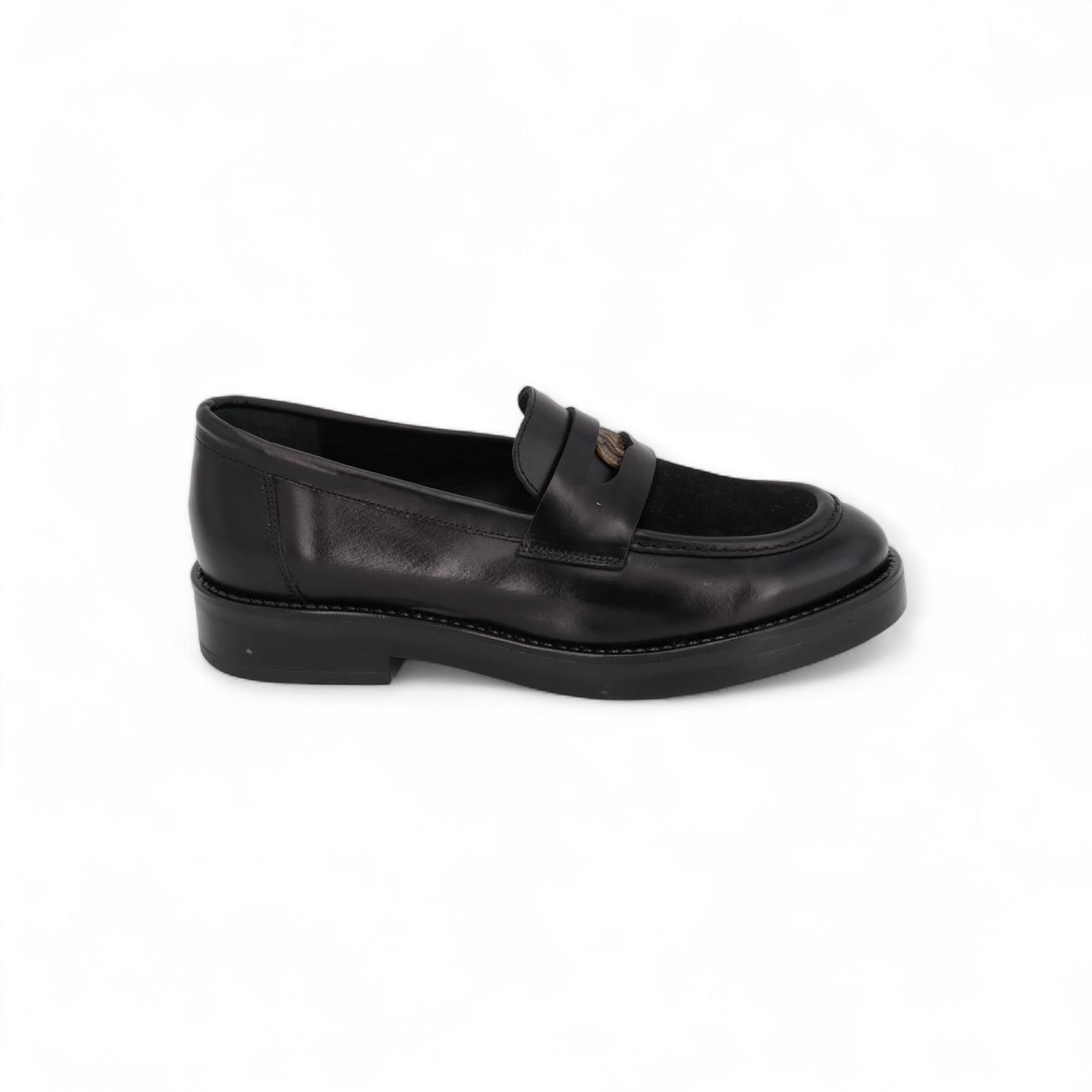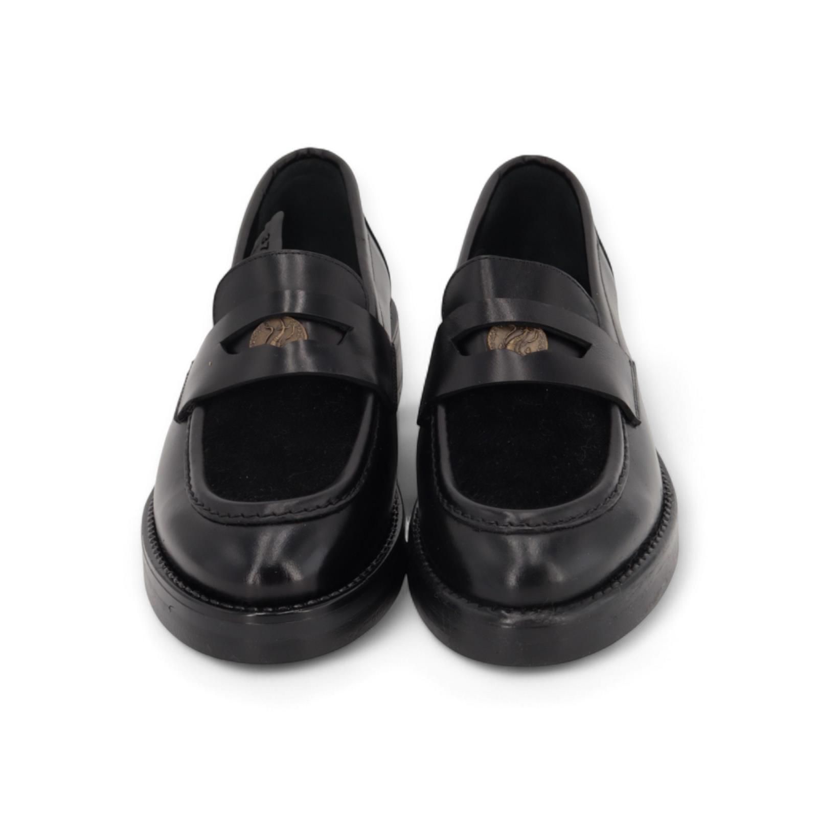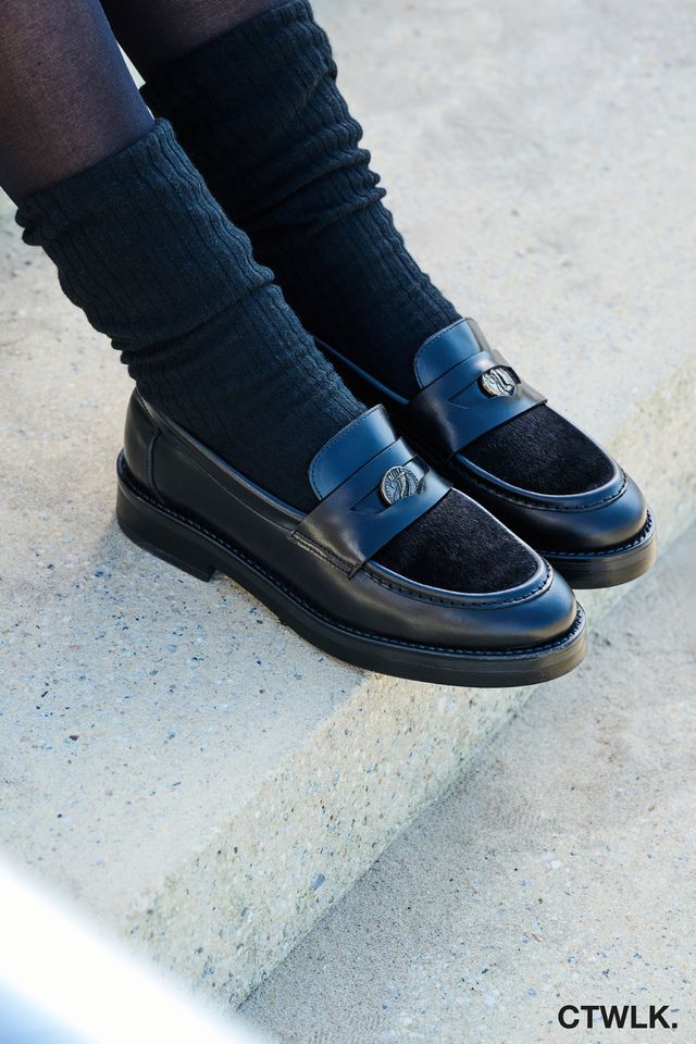 Mocassin Steph van CTWLK voor dames. Deze mocassin is in zwart leer met pels op de voorvoet. Afgewerkt met een band en gouden detail over de wreef. Heeft een geklede antislipzool.