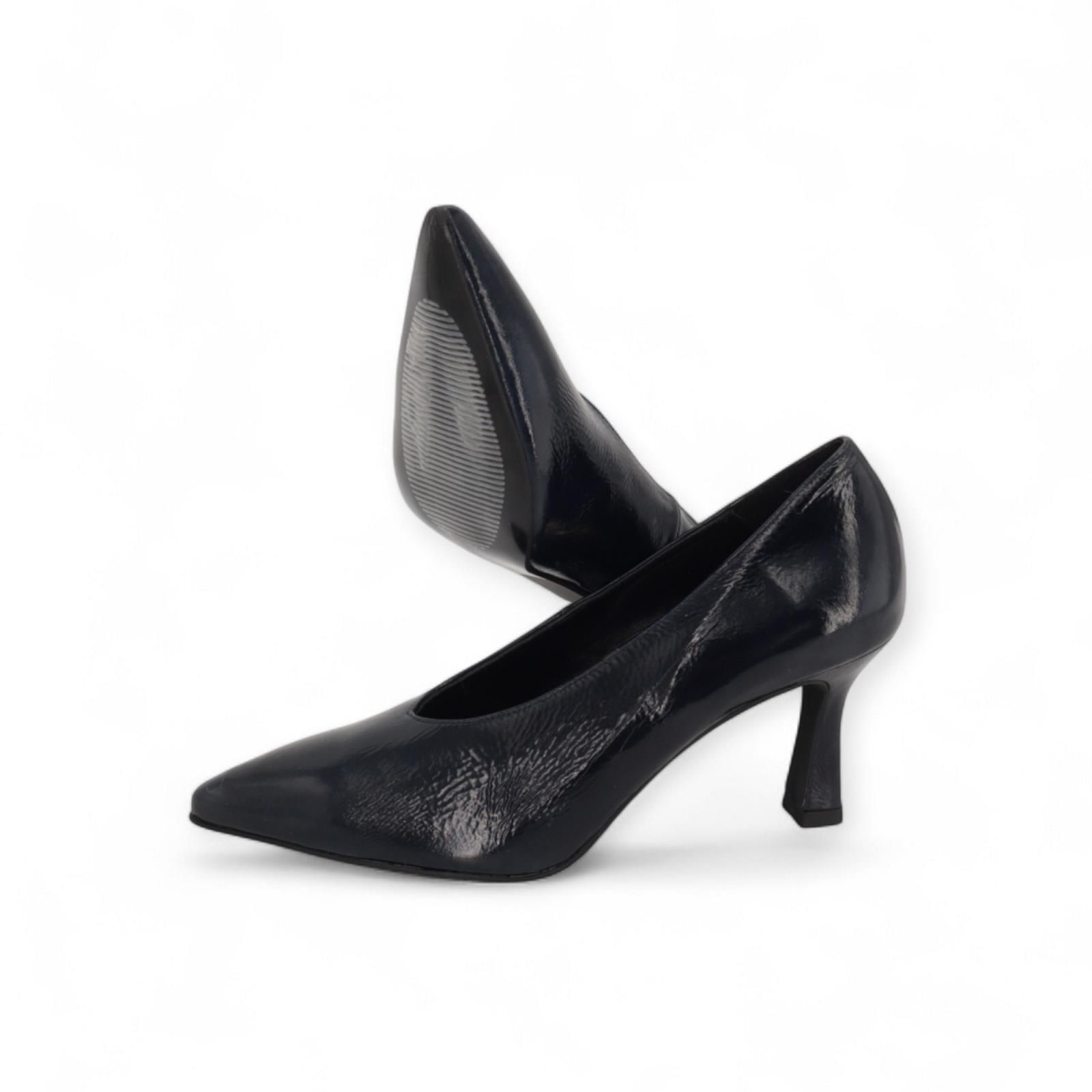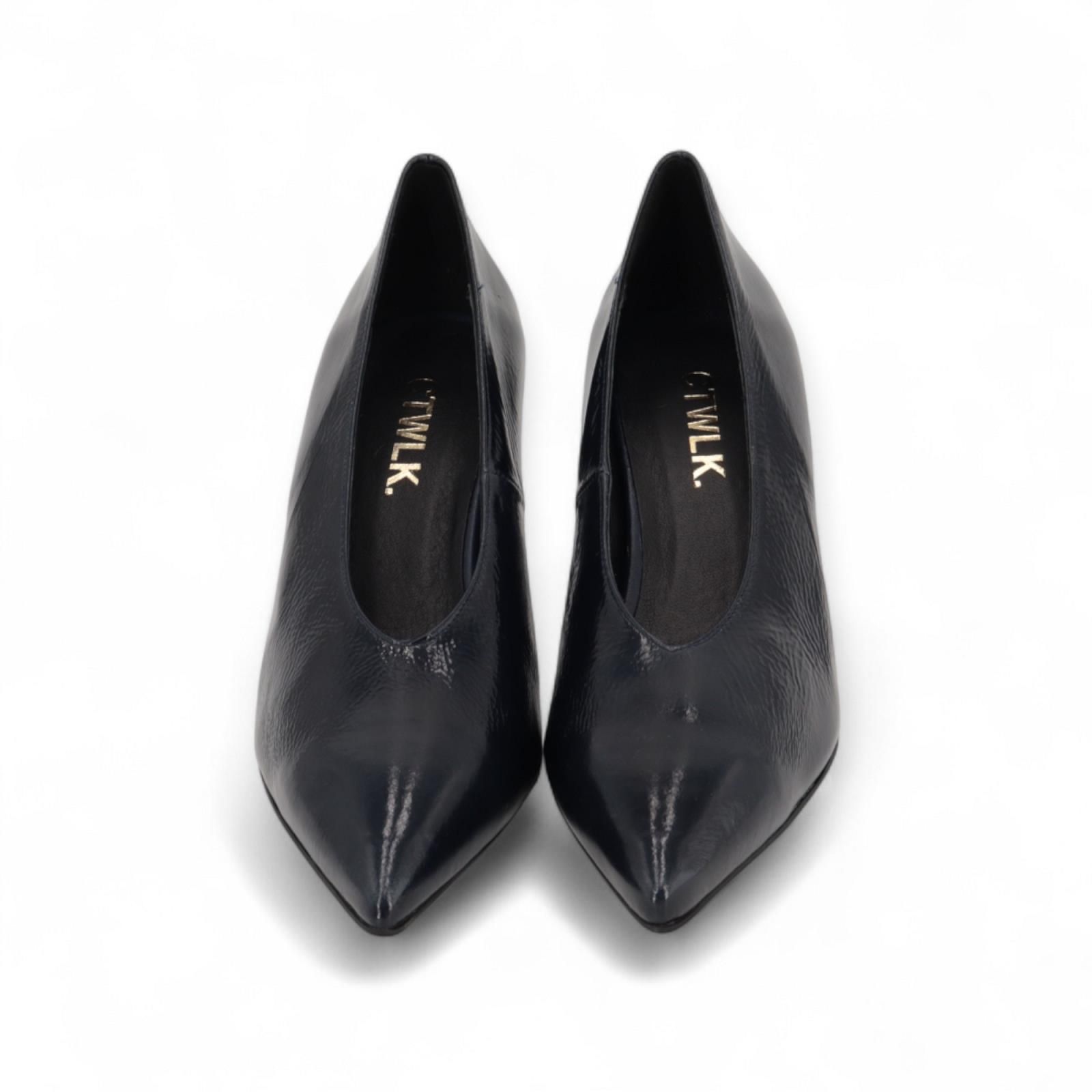 Pump Viktor van CTWLK voor dames. Deze pump is in blauw lakleer. Is ver uitgesneden aan de wreef en is met een scherpe top. Heeft een naaldhakje van 7-7,5cm hoog.