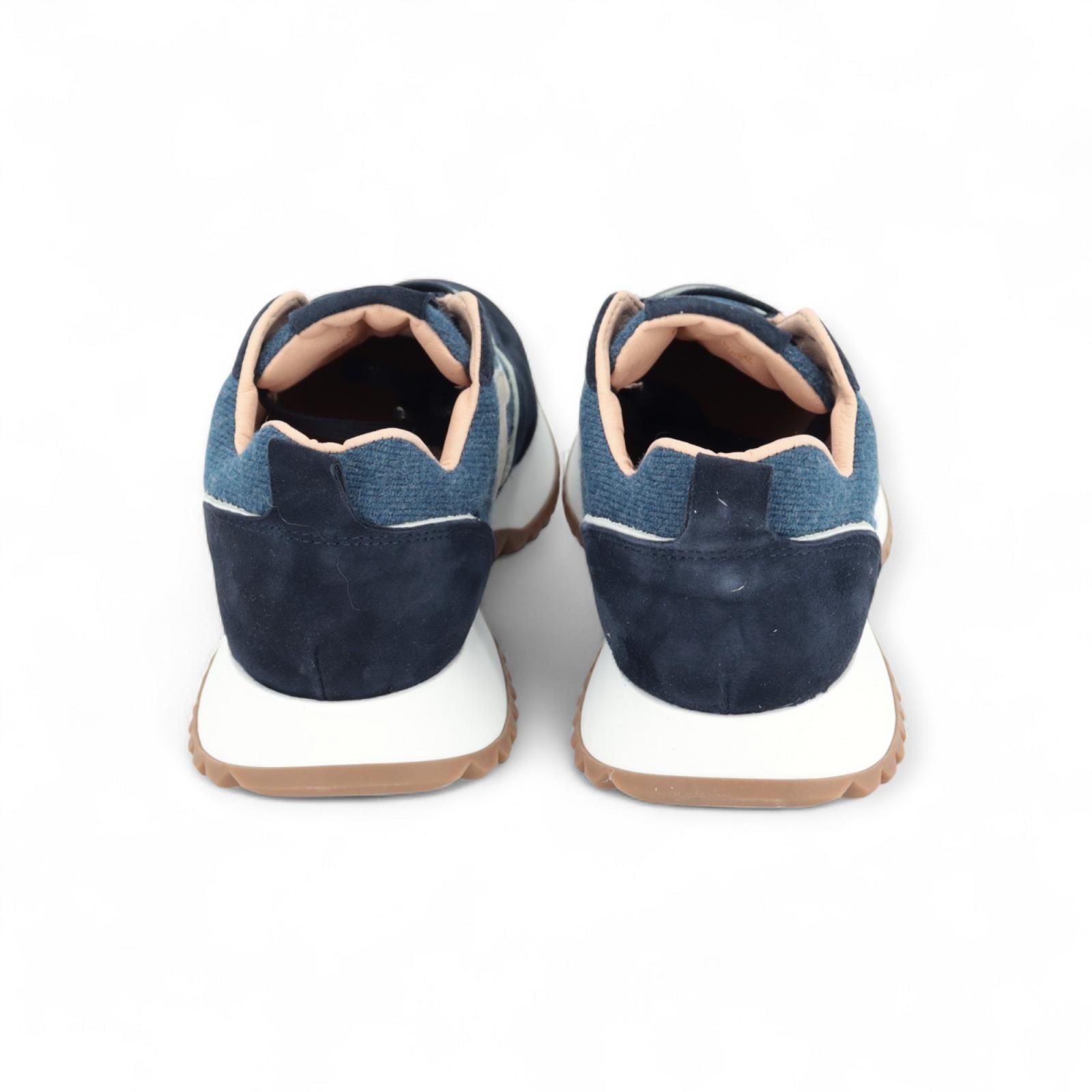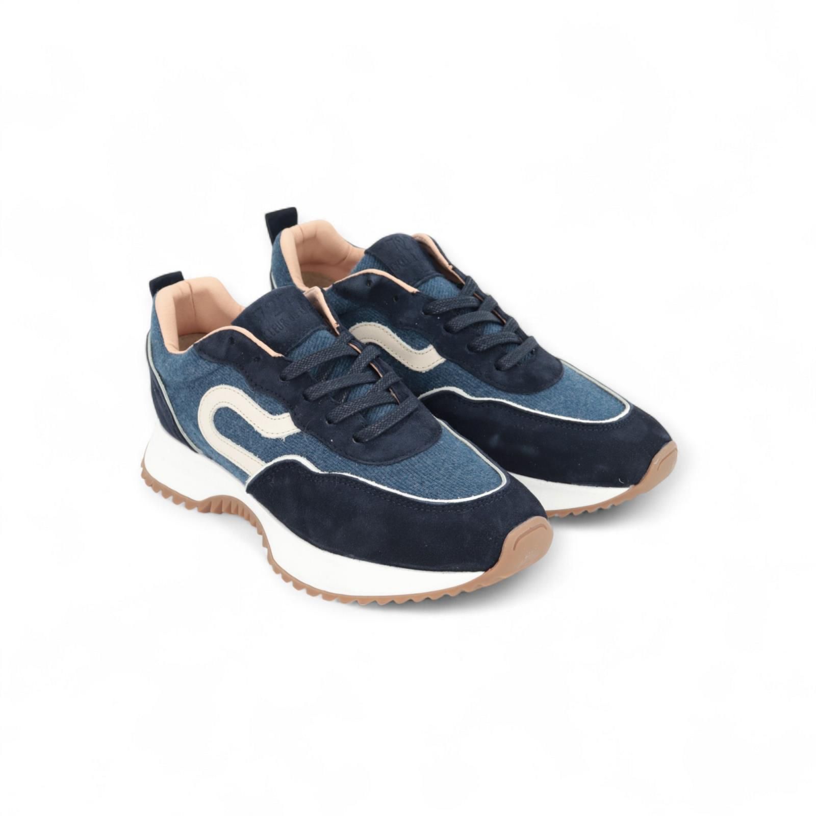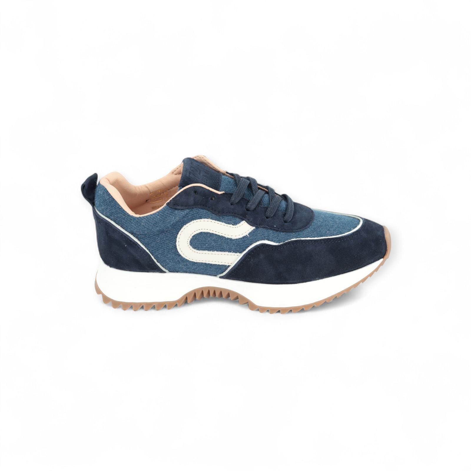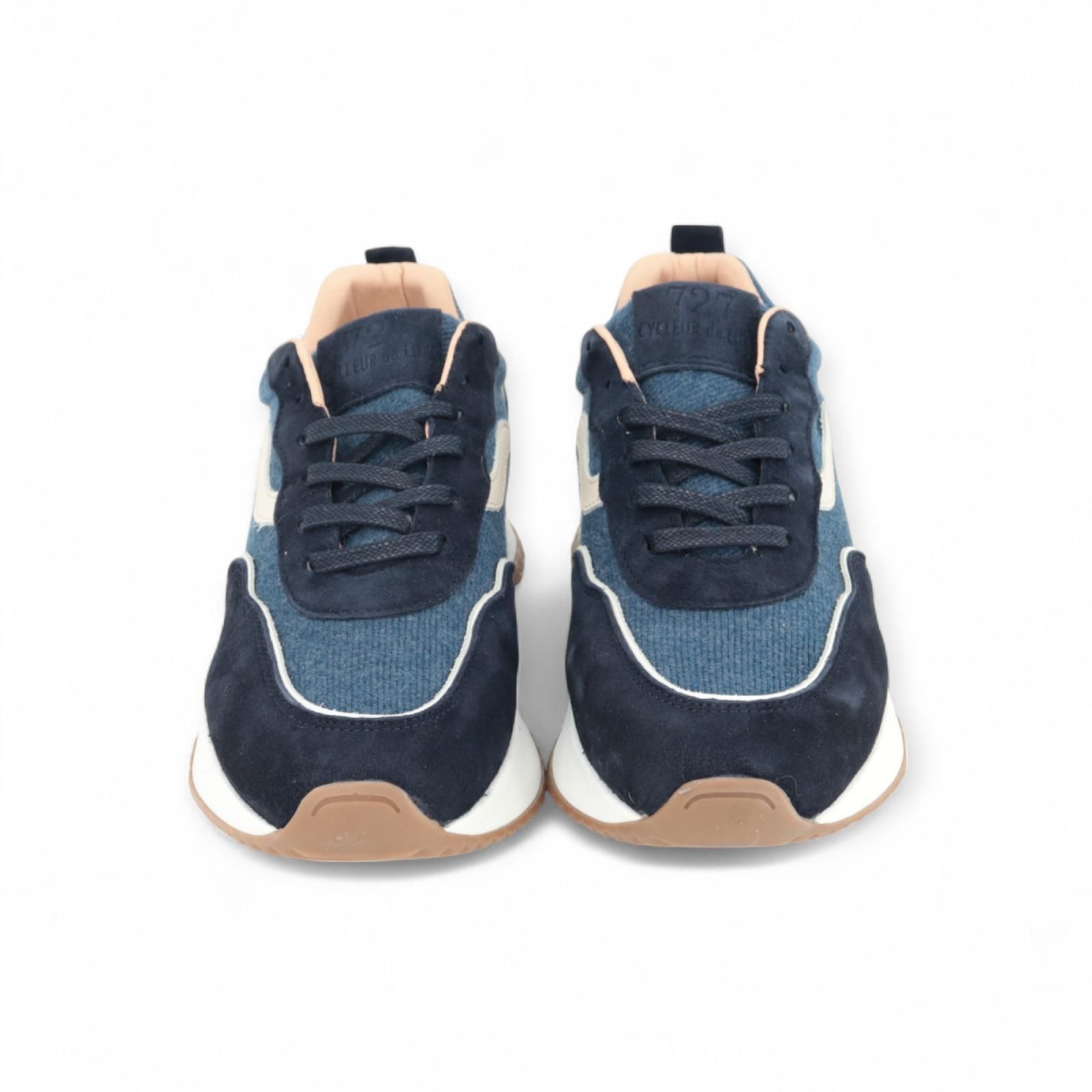 Sneaker Craster van Cycleur de LUXE voor dames. Dit runner model is in blauw suède met blauw jeans en witte stiksels. Heeft een dikke witte antislipzool en de binnenzool is uitneembaar.