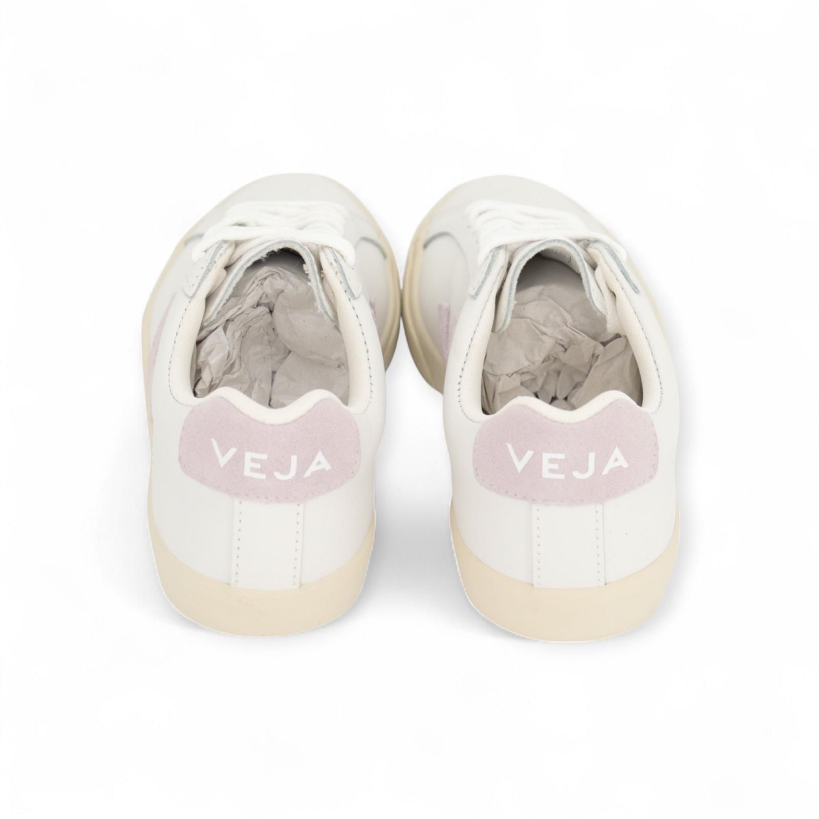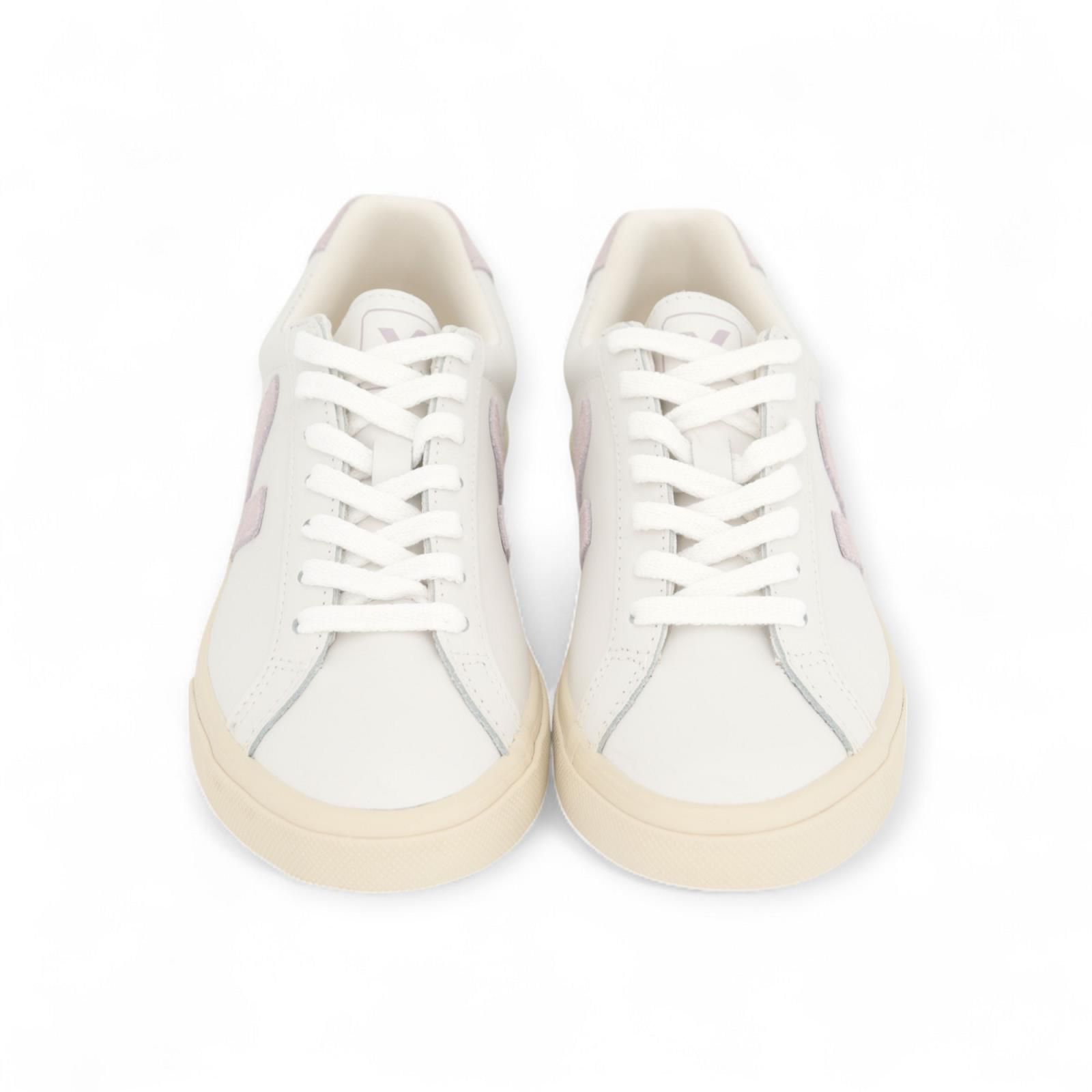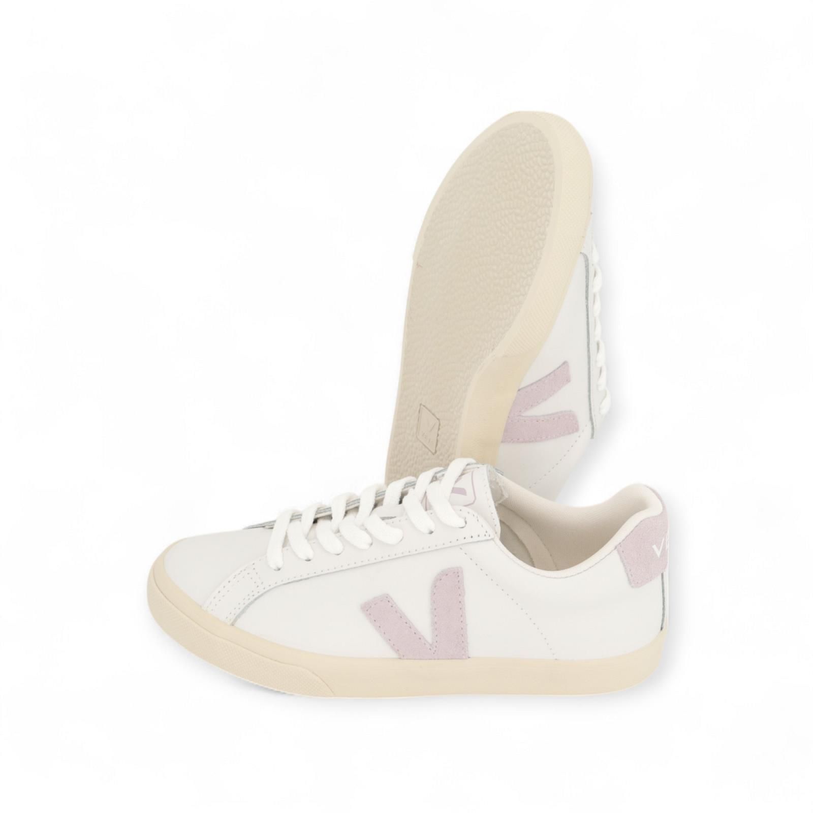 Deze witte sneaker van Veja model ESPLAR met de V in paars ; hetzelfde kleur als de achterkant van de schoen. Dit model is vervaardigt uit leer en werkt met een plooibare zool. Is minder vast of het model URCA van VEJA. Dit model heeft een uitneembare zool.