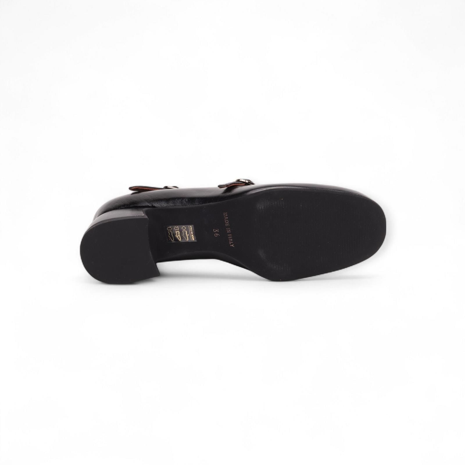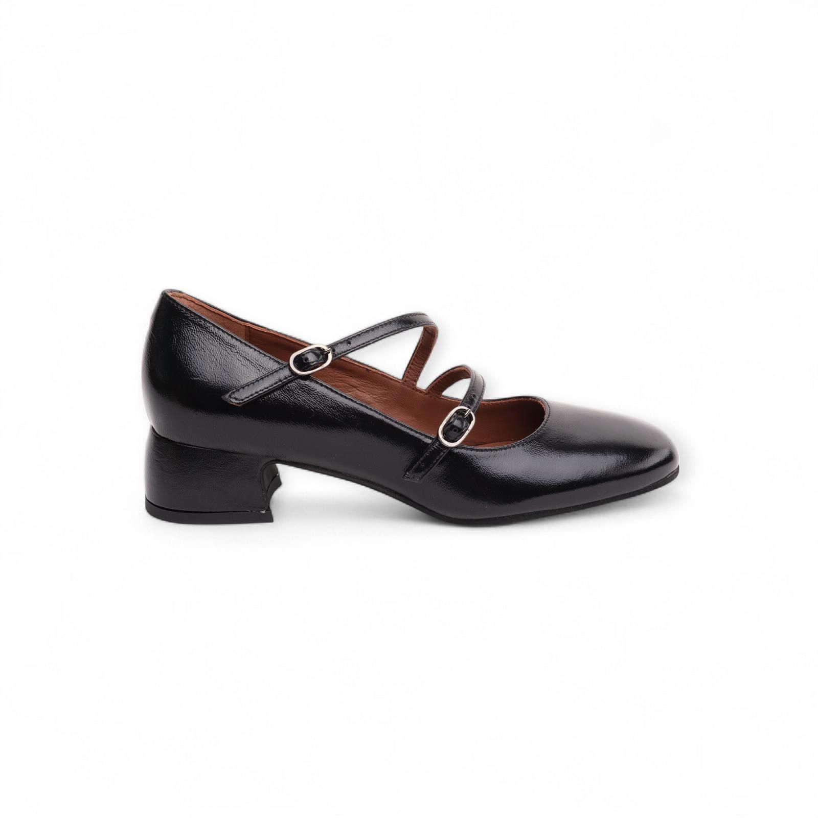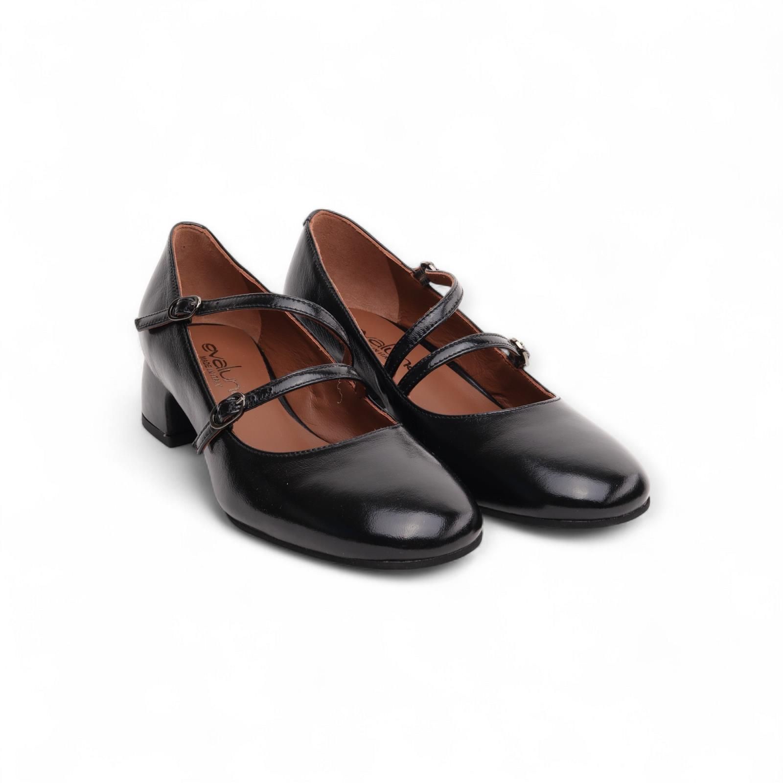 Pump Nila van Evaluna voor dames. Deze pump is in zwart lakleder. Heeft 2 fijne bandjes over de wreef met gespsluiting. Is met een ronde neus en een blokhakje van 3-3.5cm hoog.