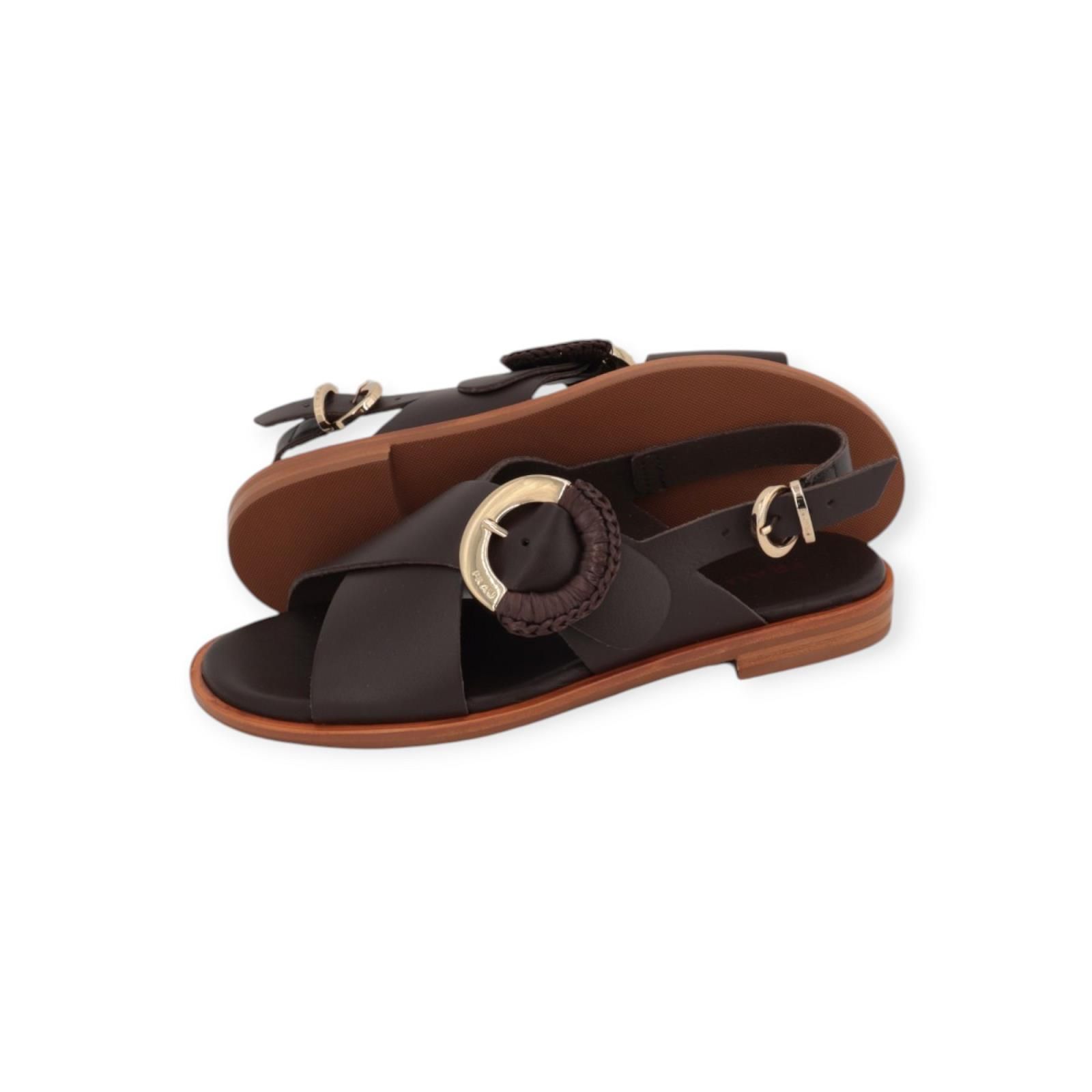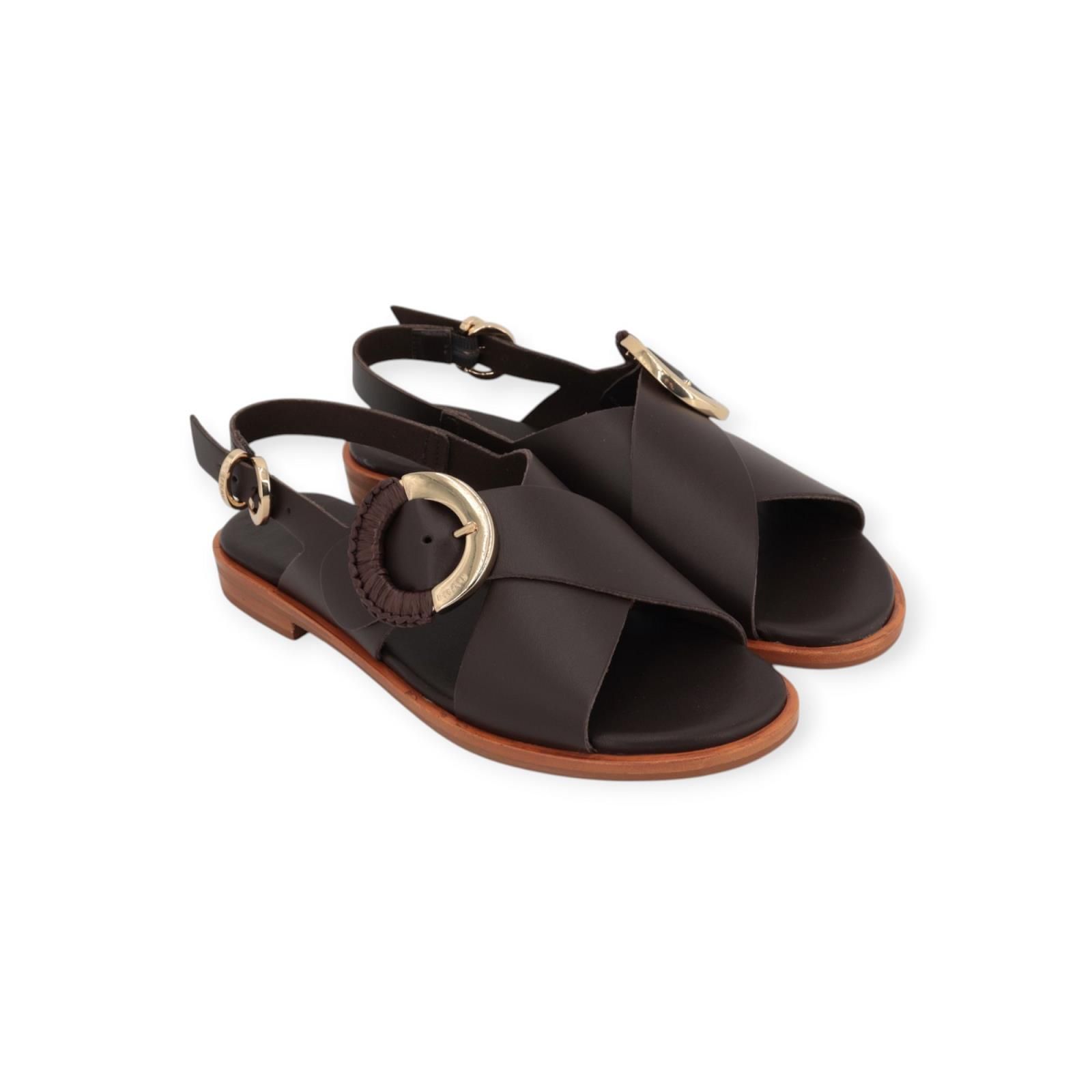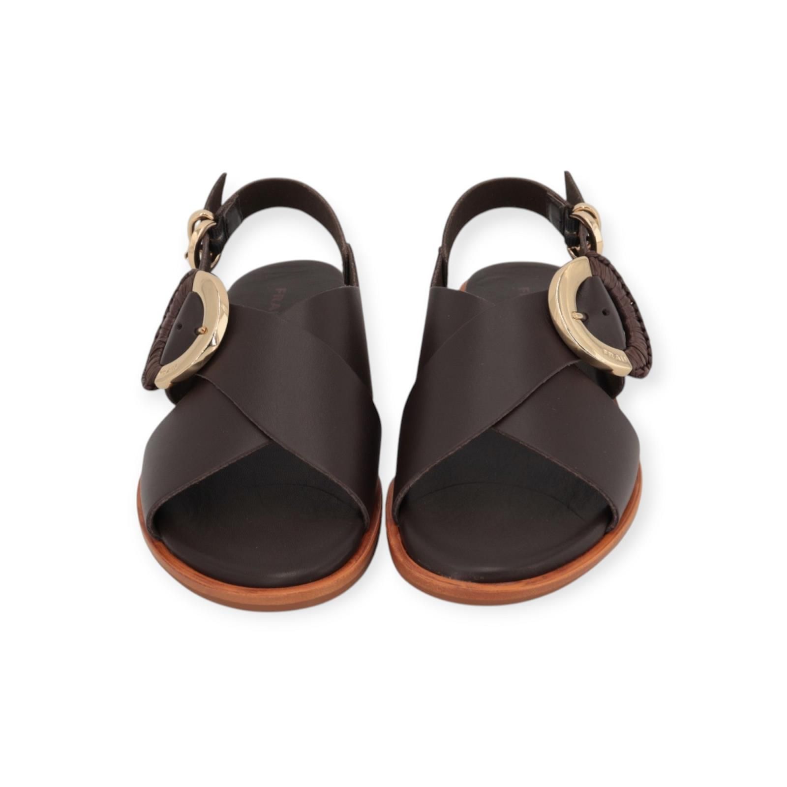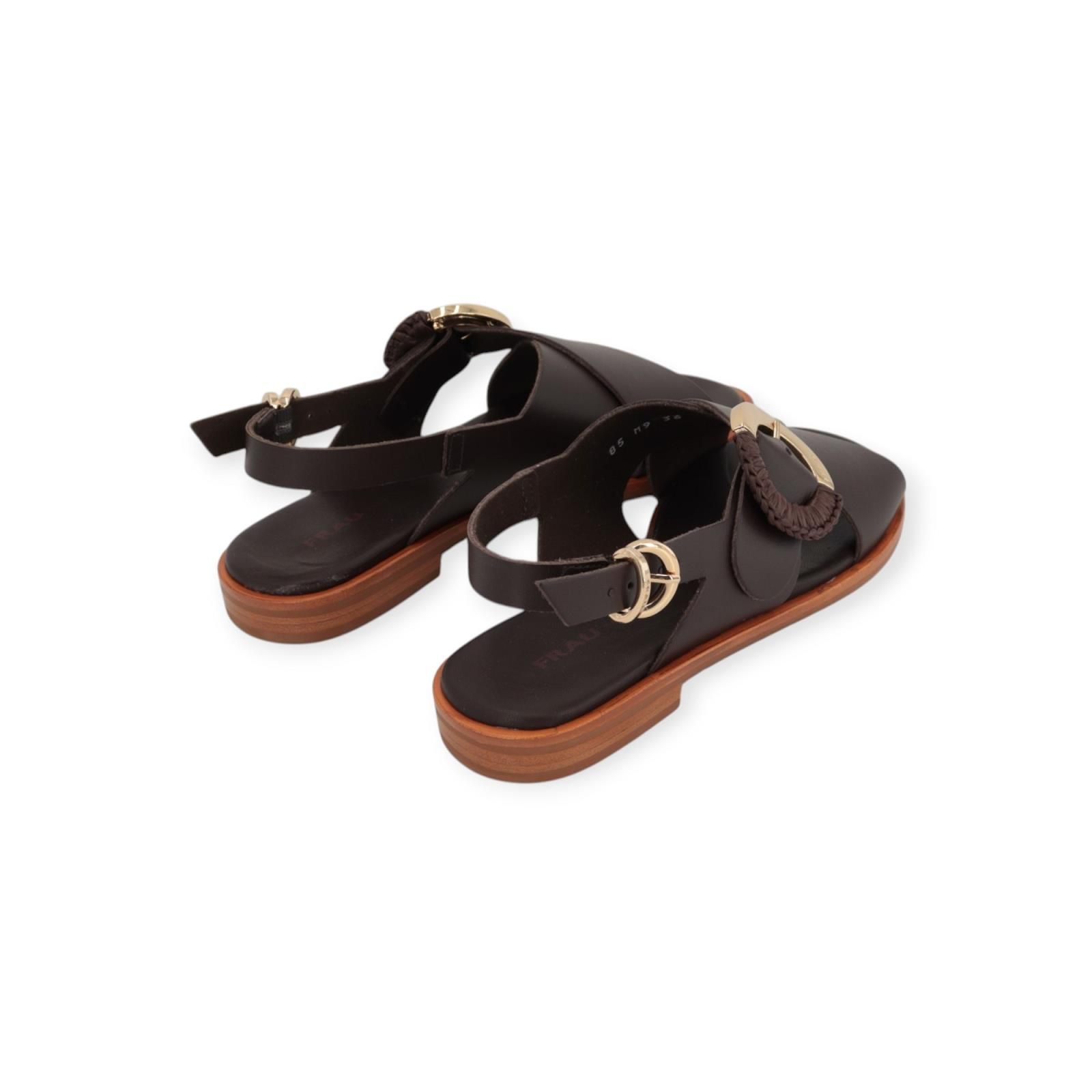 Sandaal 85M9 van Frau voor dames. Dit elegant sandaaltje is in bruin leer. Is met 2 gekruiste banden over de wreef, afgewerkt met een gouden/raffia gespsluiting. Heeft achteraan ook nog een bandje met gespsluiting zodat het model mooi aan de voet vastblijft. Is op een antislip buitenzool.