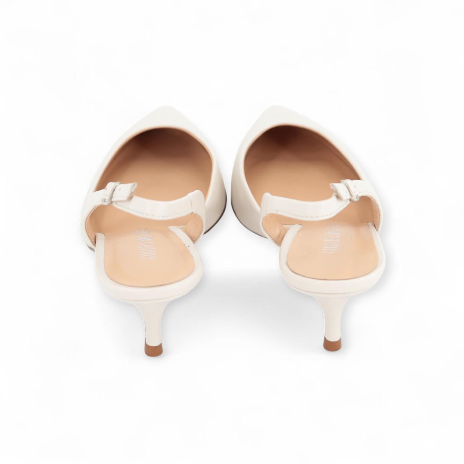 Pump Aily van Guglielmo Rotta. Elegant off wit pump afgewerkt in soepel leder met een scherpe top en een fijn hakje van ongeveer 5cm hoog. Deze slingback heeft een open hiel en is zeer stijlvol en chique aan de voet.