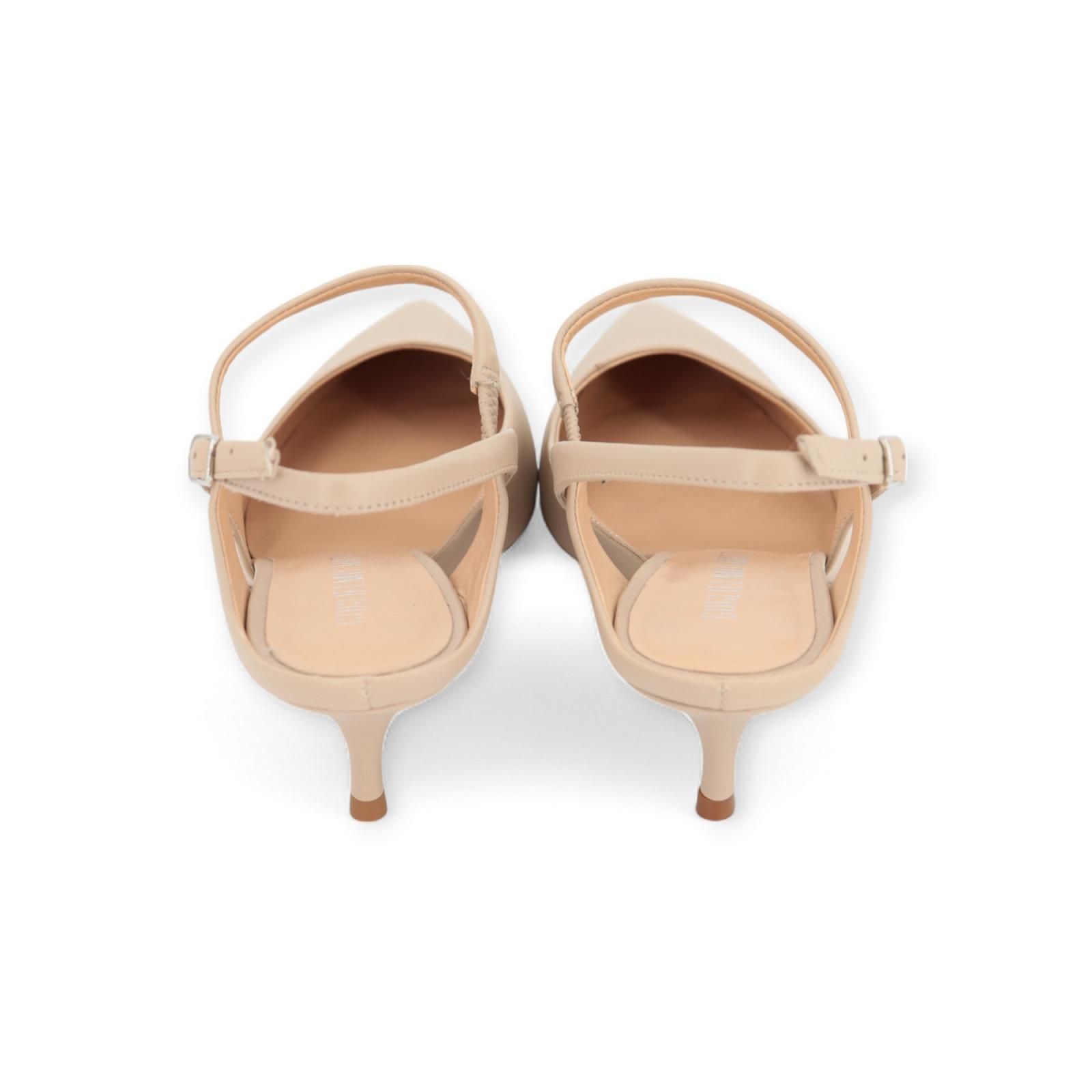 Pump Airi van Guglielmo Rotta. Elegant beige pump afgewerkt in soepel leder met een scherpe top en een fijn hakje van ongeveer 5cm hoog. Deze slingback heeft een open hiel met nog een extra bandje aan de wreef waardoor deze mooi aan de voet blijft zitten.