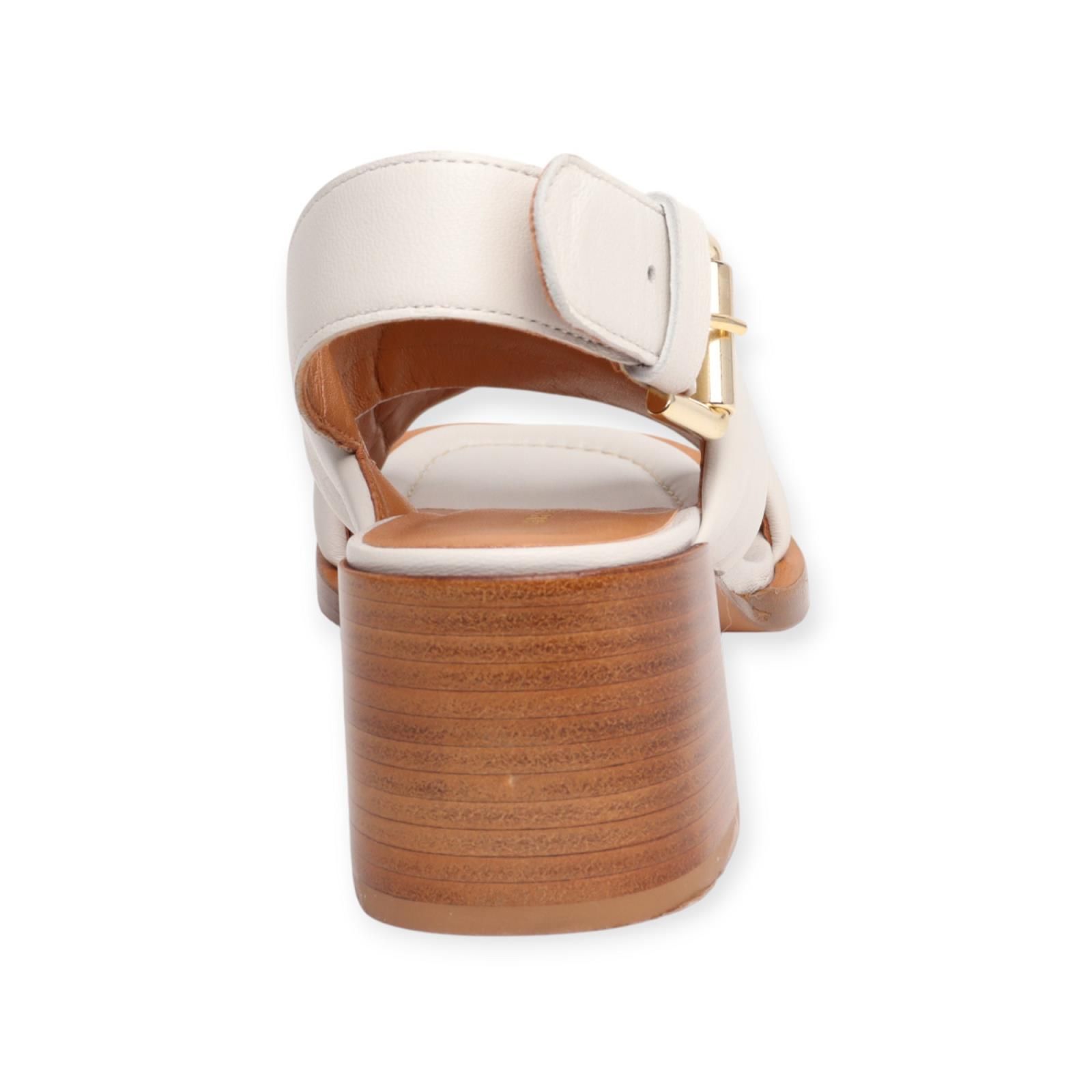 Sandaal Garland van Guglielmo Rotta voor dames. Deze sandaal heeft een gekruiste band in off wit over de wreef. Is met een bandje en gespsluiting rond de hiel. Heeft een carré top en een houten blokhakje van 5-5.5cm hoog.