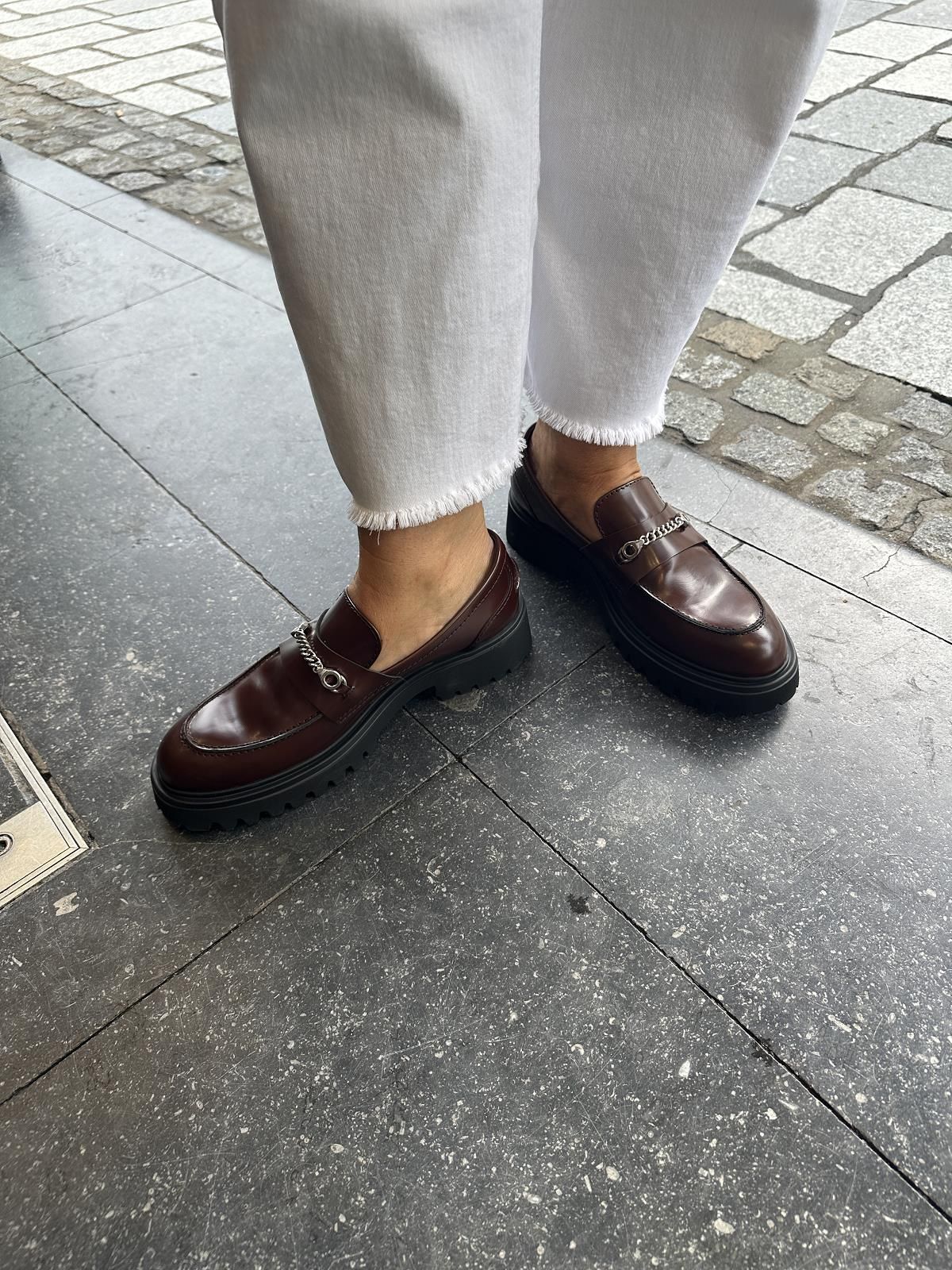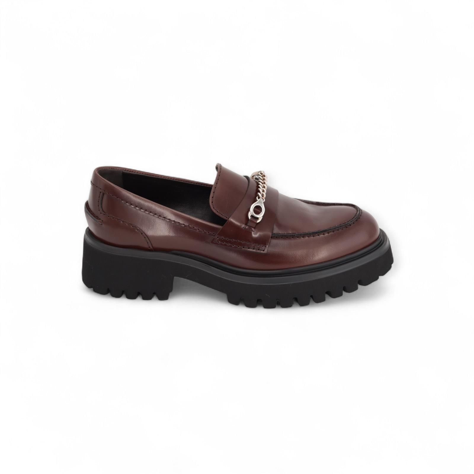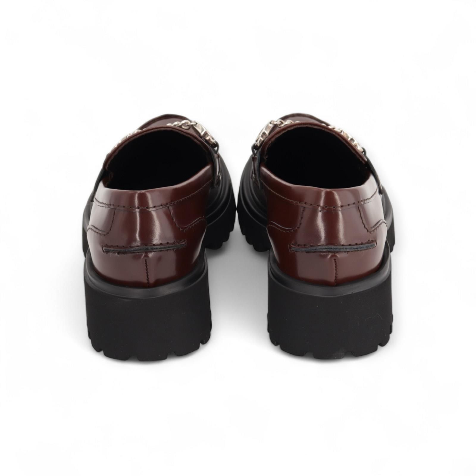Mocassin Win van Guglielmo Rotta voor dames. Deze hippe mocassin is in bruin lakleer. Heeft een band met gouden accesoire over de wreef en een stekking op de voorvoet. Is op een dikke zwarte zool met een blokhak die voor nog meer comfort zorgt.