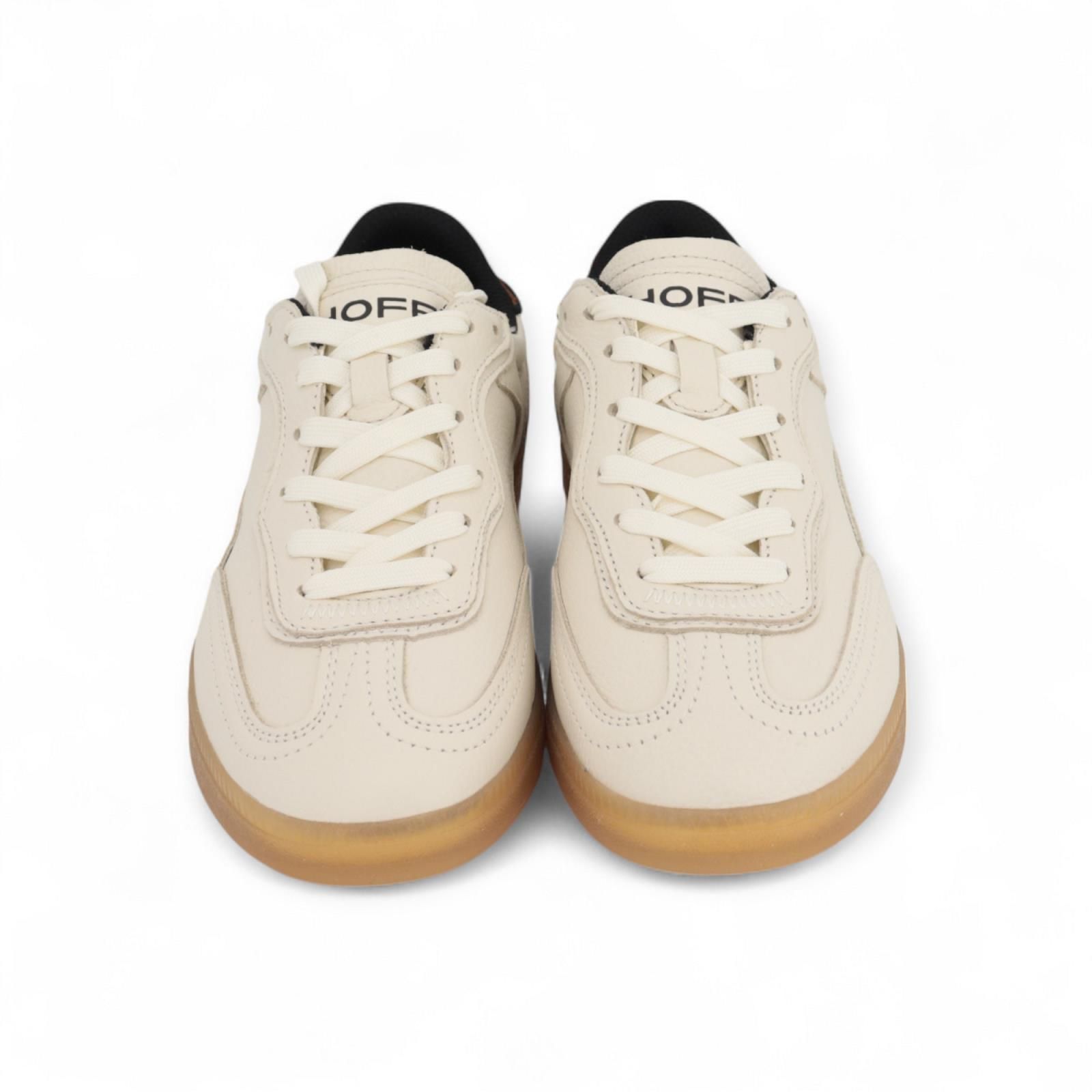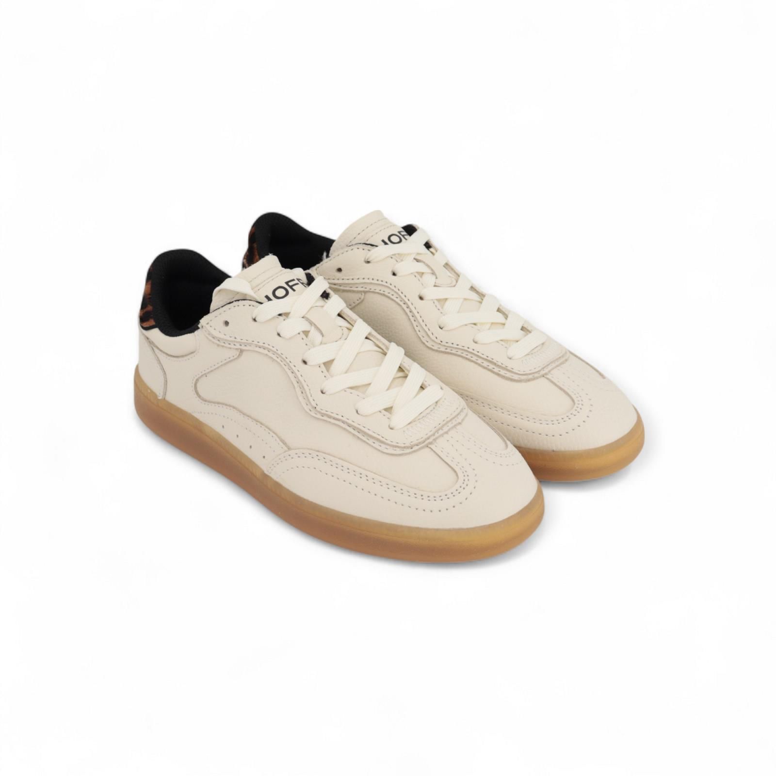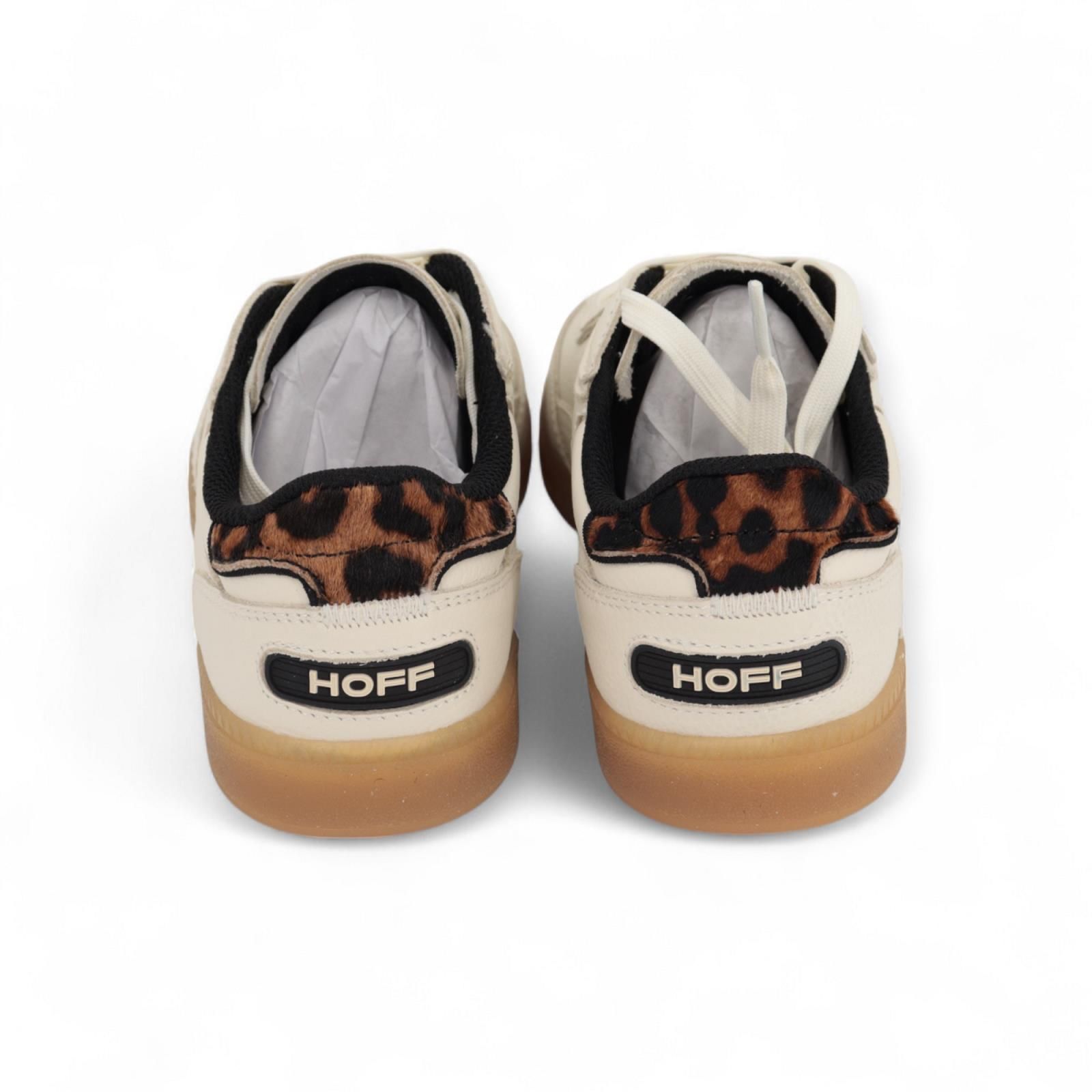 Sneaker Alley van Hoff voor dames. Deze sneaker is in off wit leer met stiksels afgewerkt. Heeft een leopard hielflap met HOFF achteraan een echte eyecatcher. Is op een aangename gummy zool en de binnenzool is uitneembaar.
