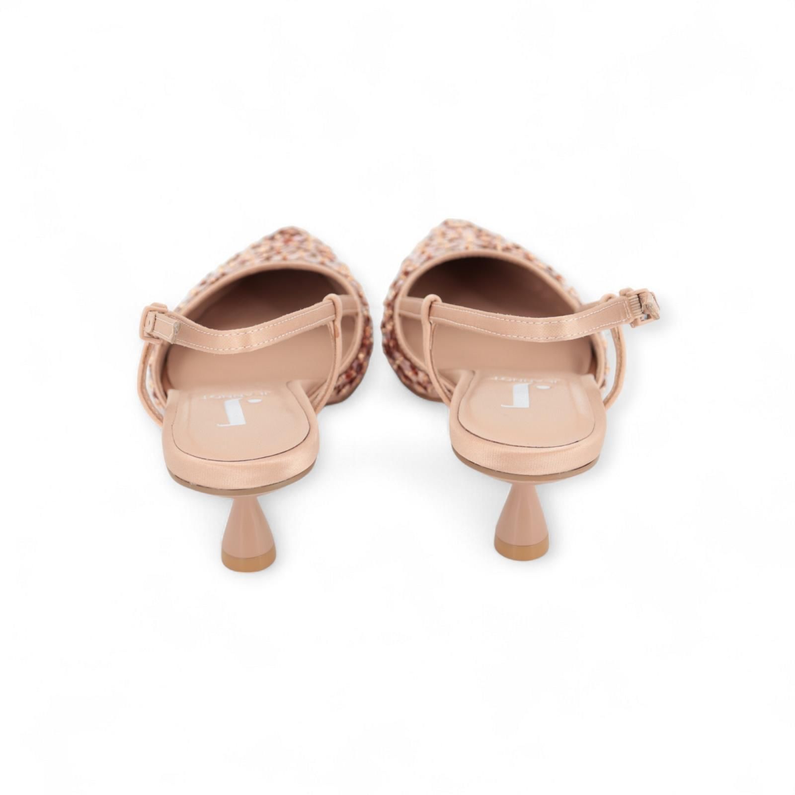 Pump Jeannot voor dames. Deze prachtige slingback in roze-nude is mooi afgewerkt met bloemenversiering op de neus en is met een scherpe top. Blijft mooi aan de voet door het lederen bandje met gespsluiting. Afgewerkt met een roze fijn hakje van 5cm hoog