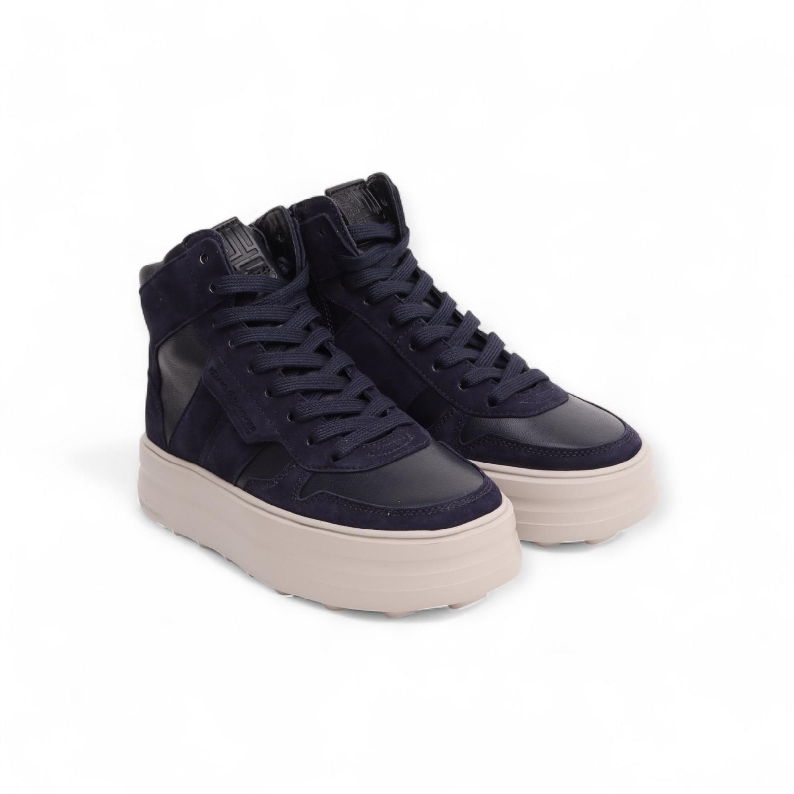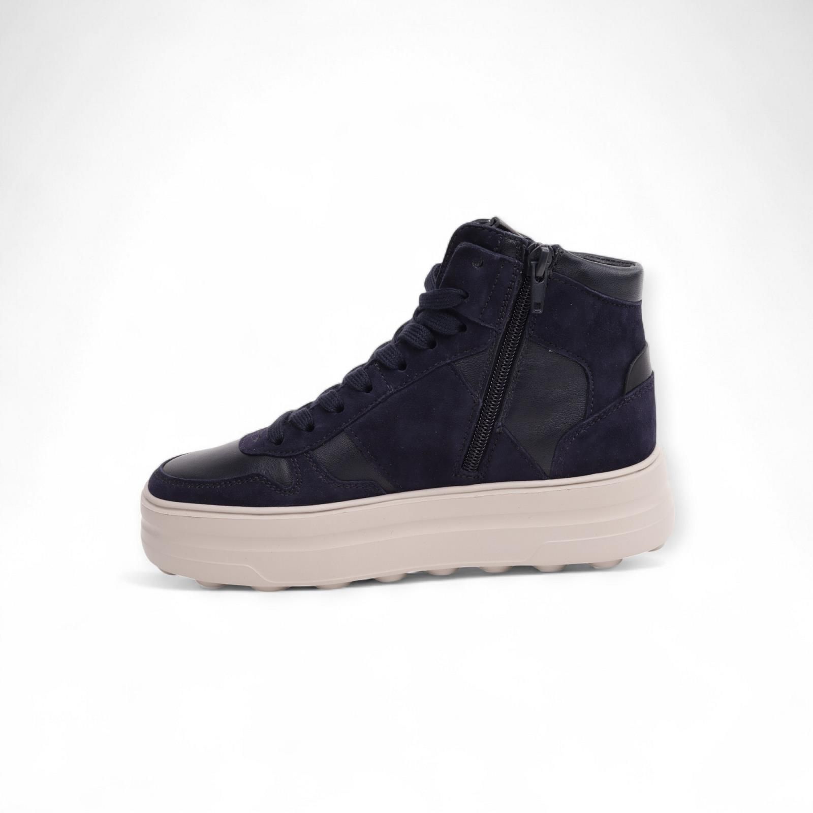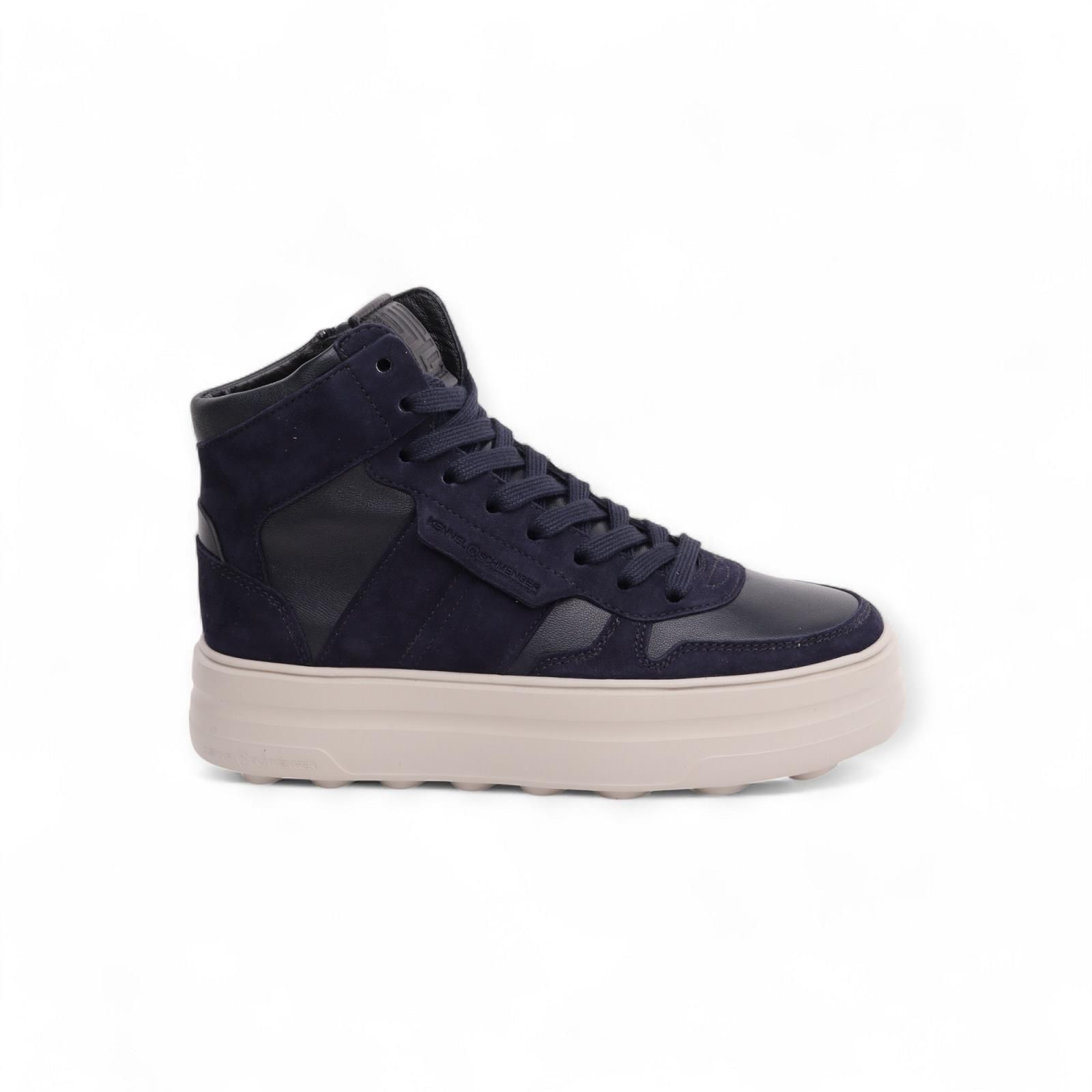 Sneaker Break van Kennel & Schmenger voor dames. Deze sneaker is een hoog enkelmodel. Is in blauw suède leder met veters en een ritssluiting. Heeft een dikke plateauzool en een uitneembare binnenzool