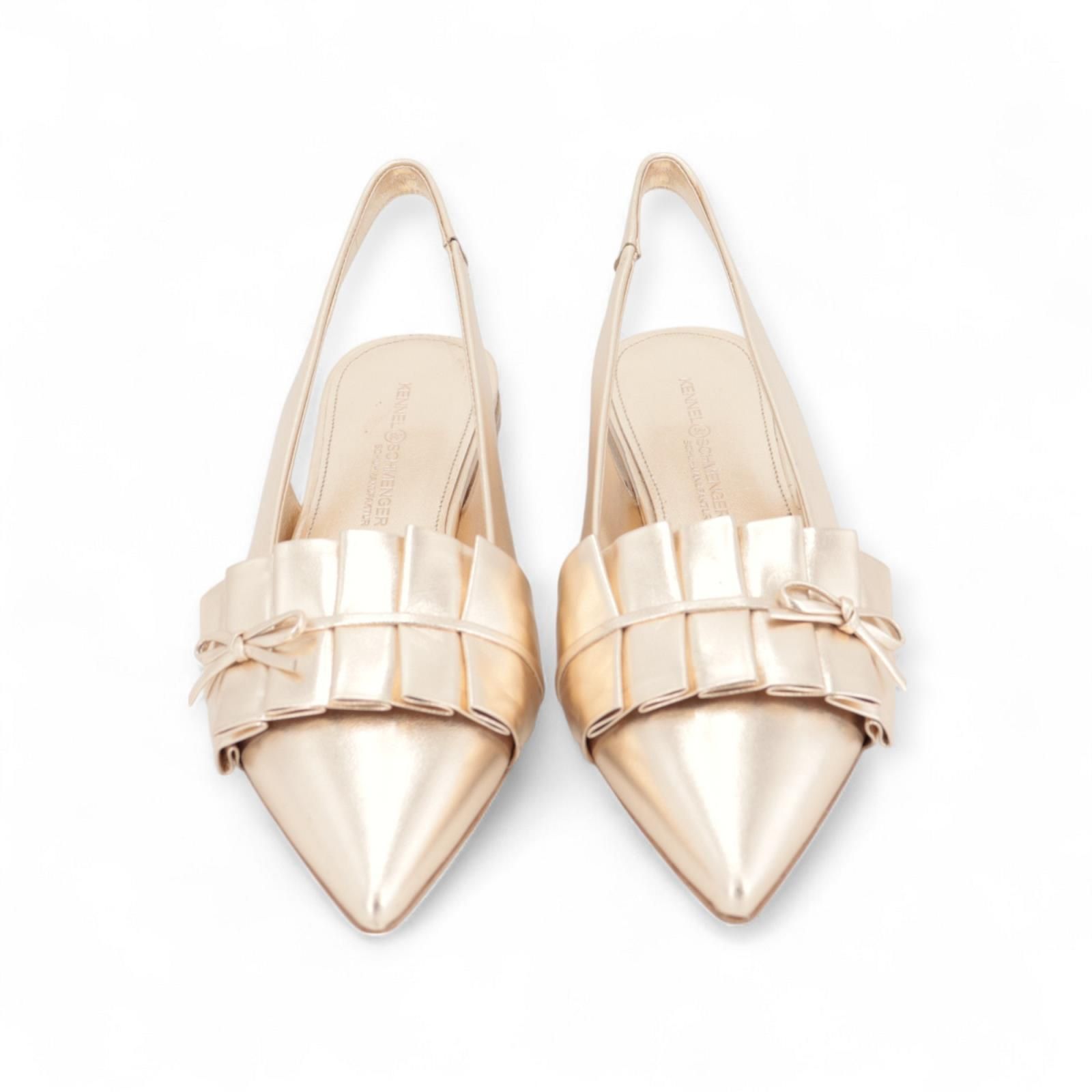 GRETA ballerina van Kennel & Schmenger voor dames. Dit slingback model is een modieuze blikvanger voor het nieuwe seizoen. Het puntige silhouet en het fijne nappaleer in goud zorgen voor een moderne look. De puntige neus en open hieltje creëren een vrouwelijke look.