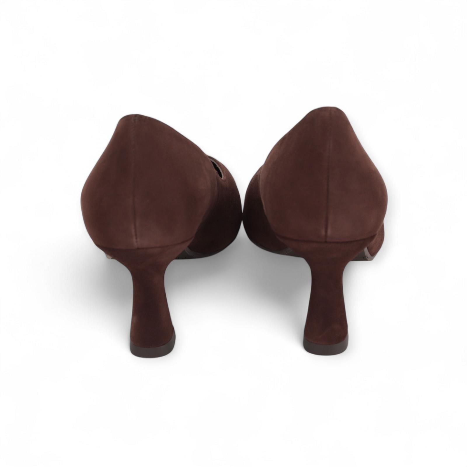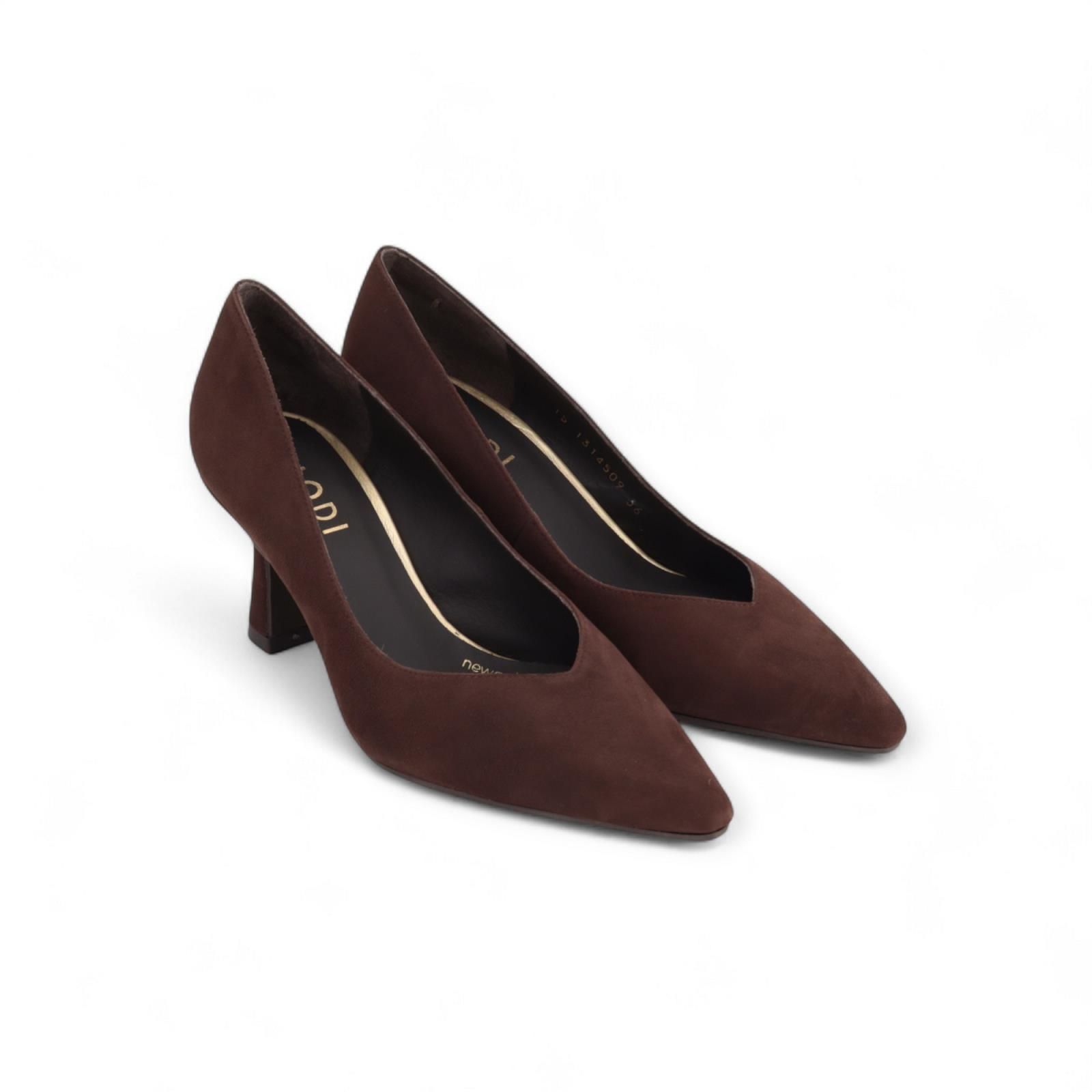 Pump Goberto van LODI voor dames. Deze elegante pump is in bruin suede. Is met een scherpe punt en mooi uitgesneden. Heeft een fijne hak van 7-7.5cm hoog.