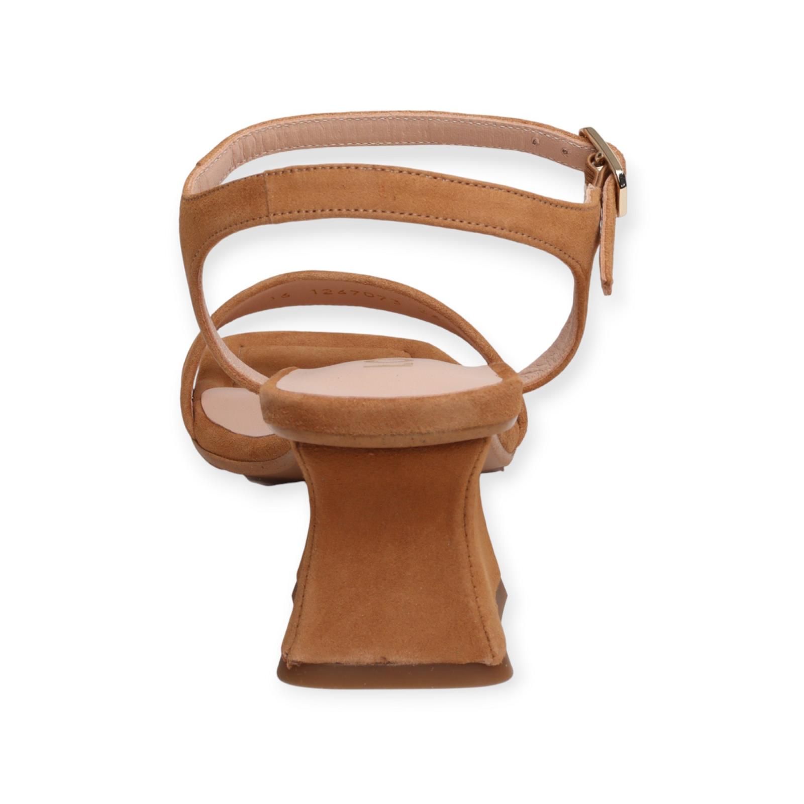 Sandaal Min van Lodi voor dames. Deze sandaal is in cognac suède. Heeft een brede band over de wreef en een bandje rond de hiel en enkel met gespsluiting. Is met een carré top en een blokhakje van 5-5.5cm hoog.