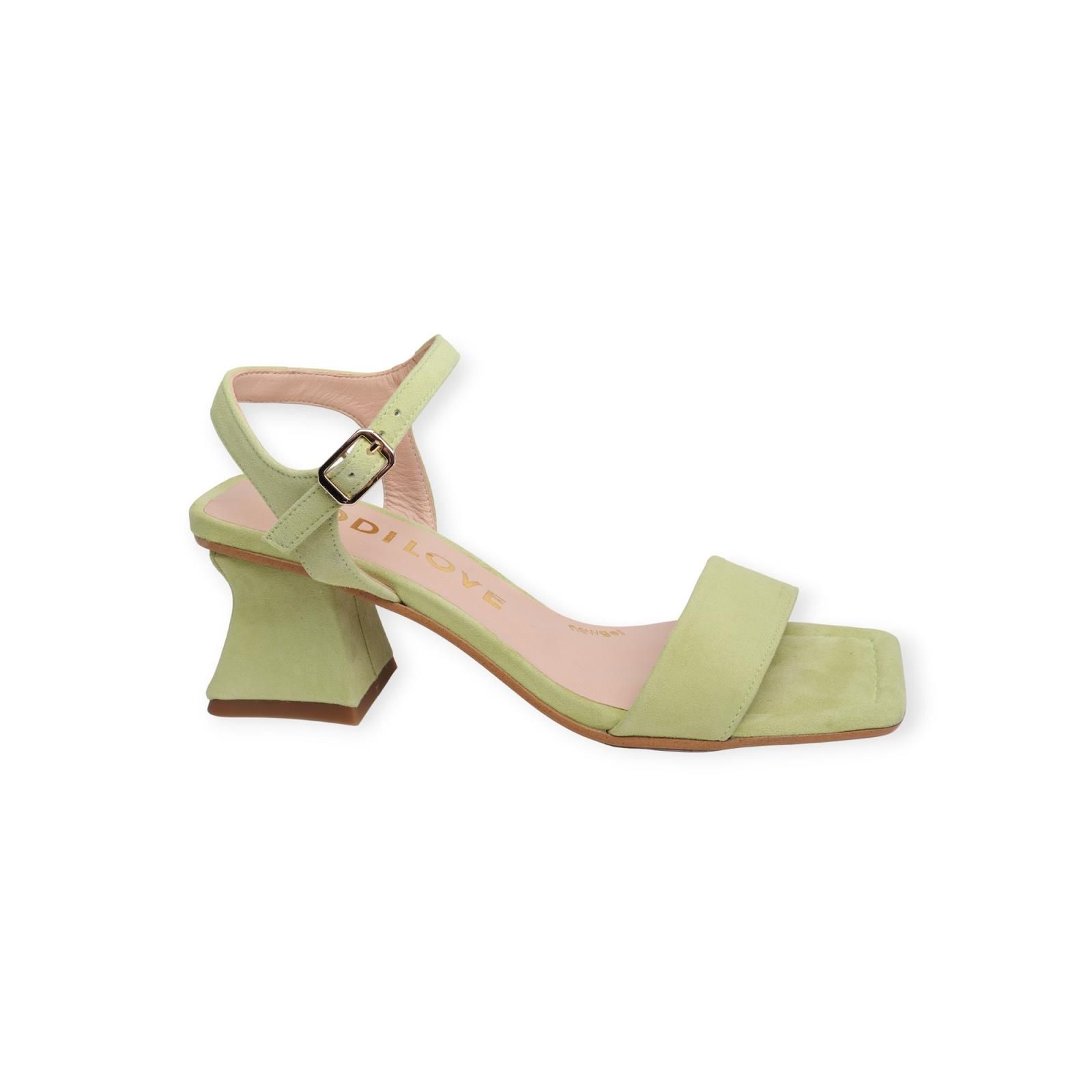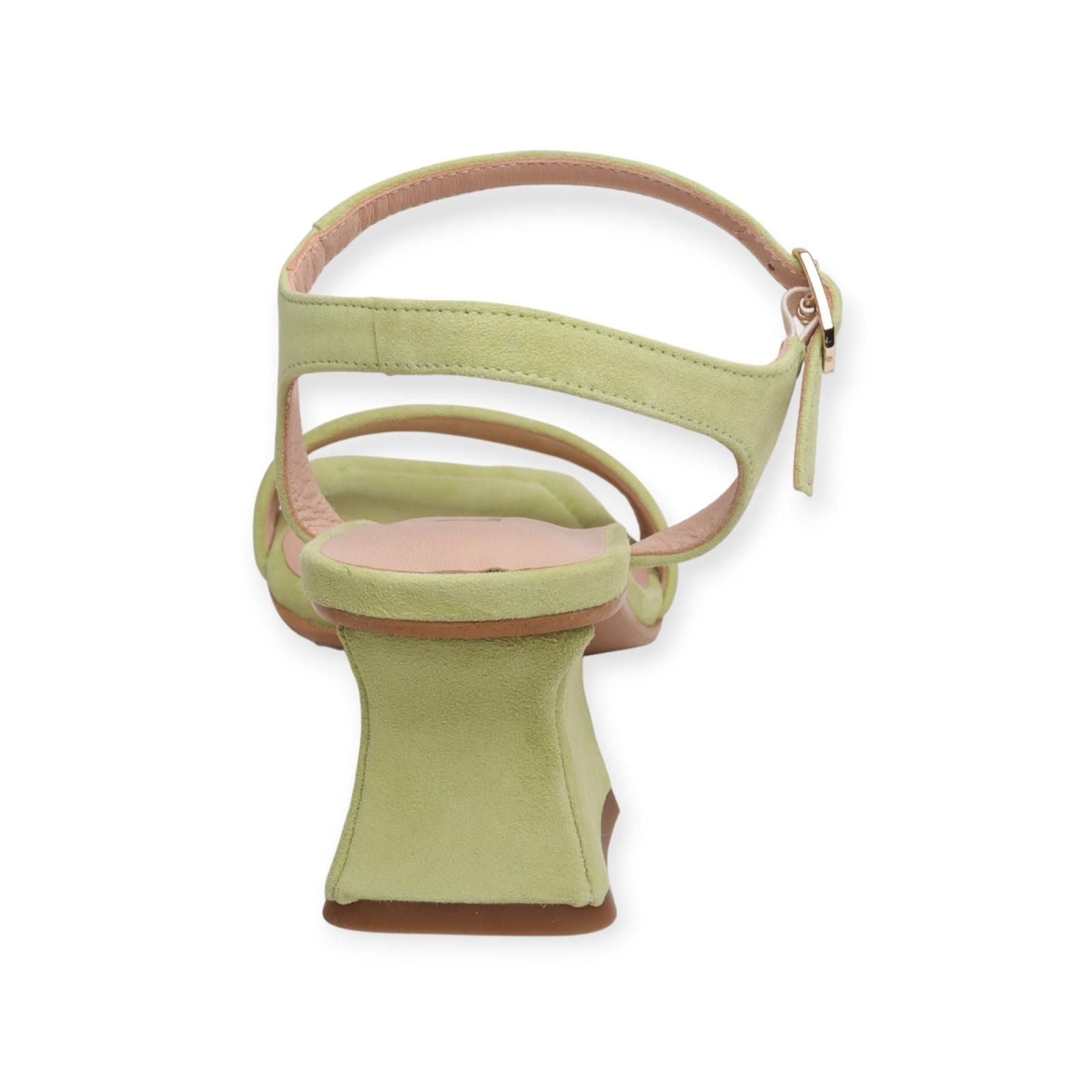 Sandaal Min van Lodi voor dames. Deze sandaal is in licht groen suède. Heeft een brede band over de wreef en een bandje rond de hiel en enkel met gespsluiting. Is met een carré top en een blokhakje van 5-5.5cm hoog.