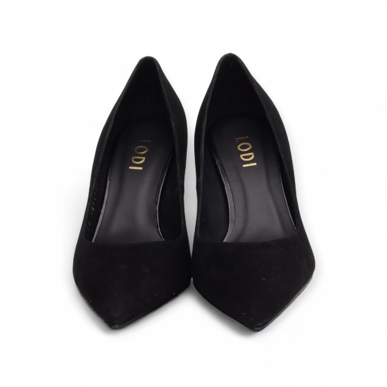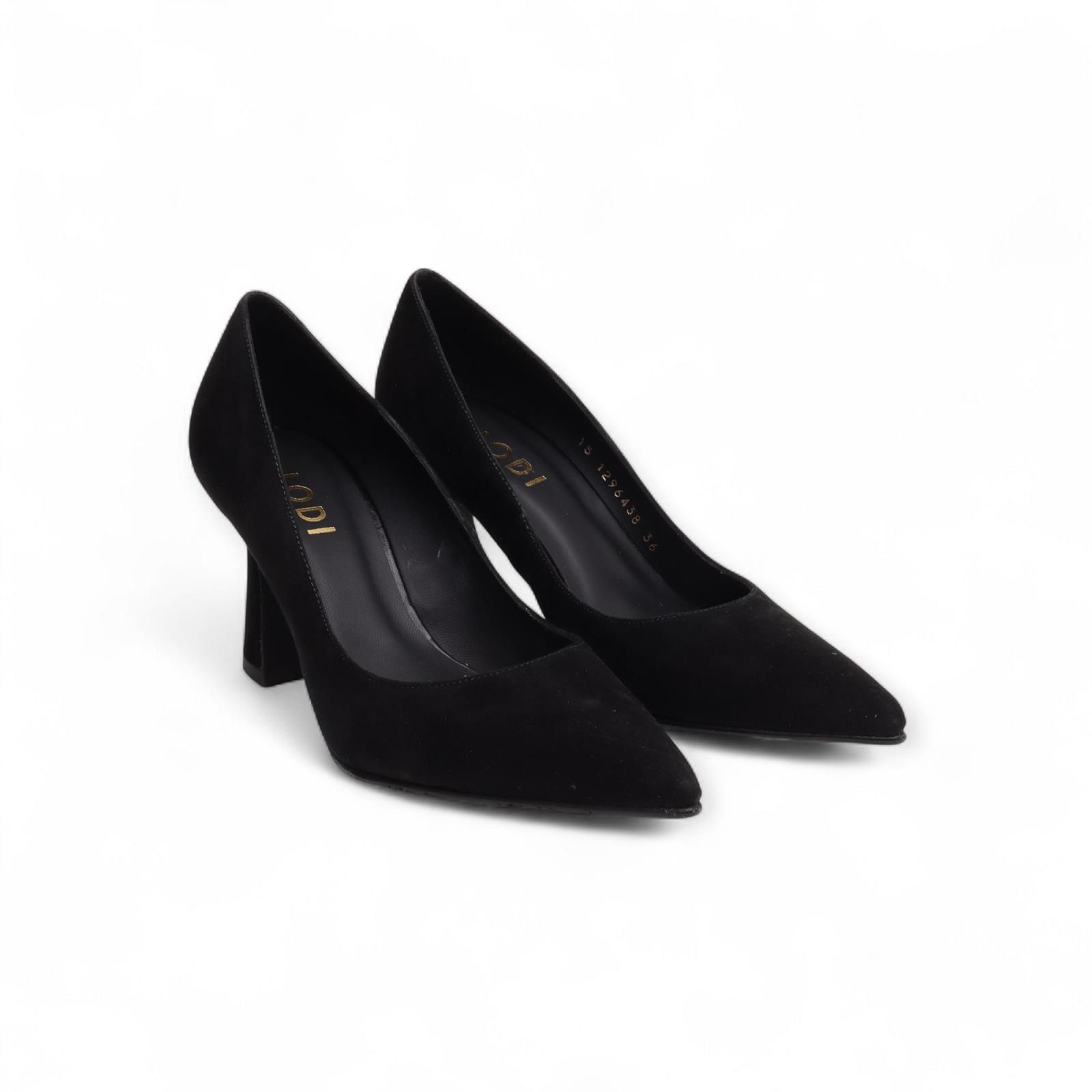 Pump Roa Robin van Lodi in zwart. Deze suede pump heeft een fijne top en een ronde halslijn. Is zeer elegant en heeft een geometrische hak van 7,5cm hoog. Met leer gevoerde binnenkant en een gelbinnenzool voor meer comfort bij elke stap.