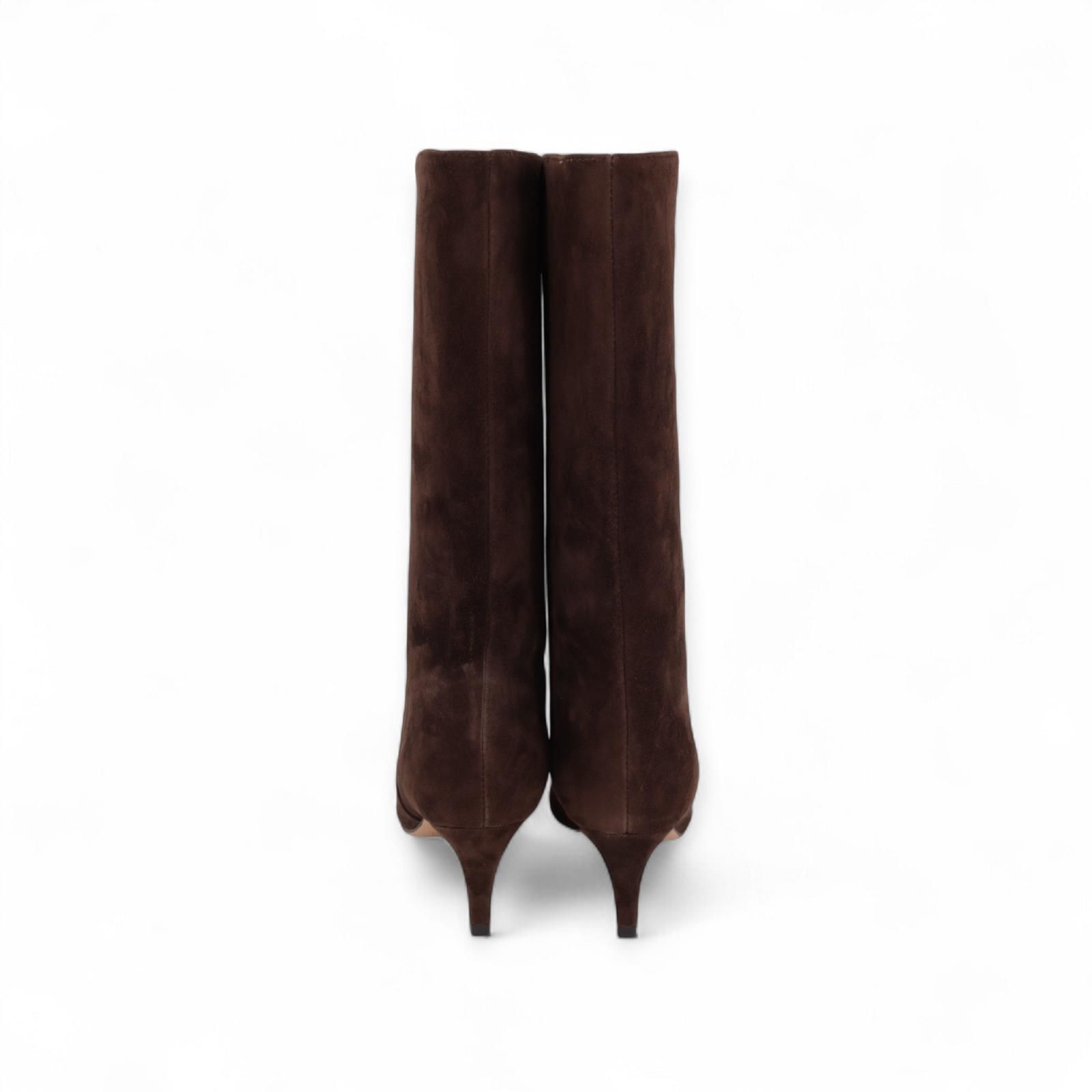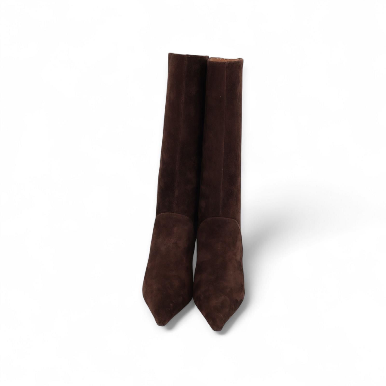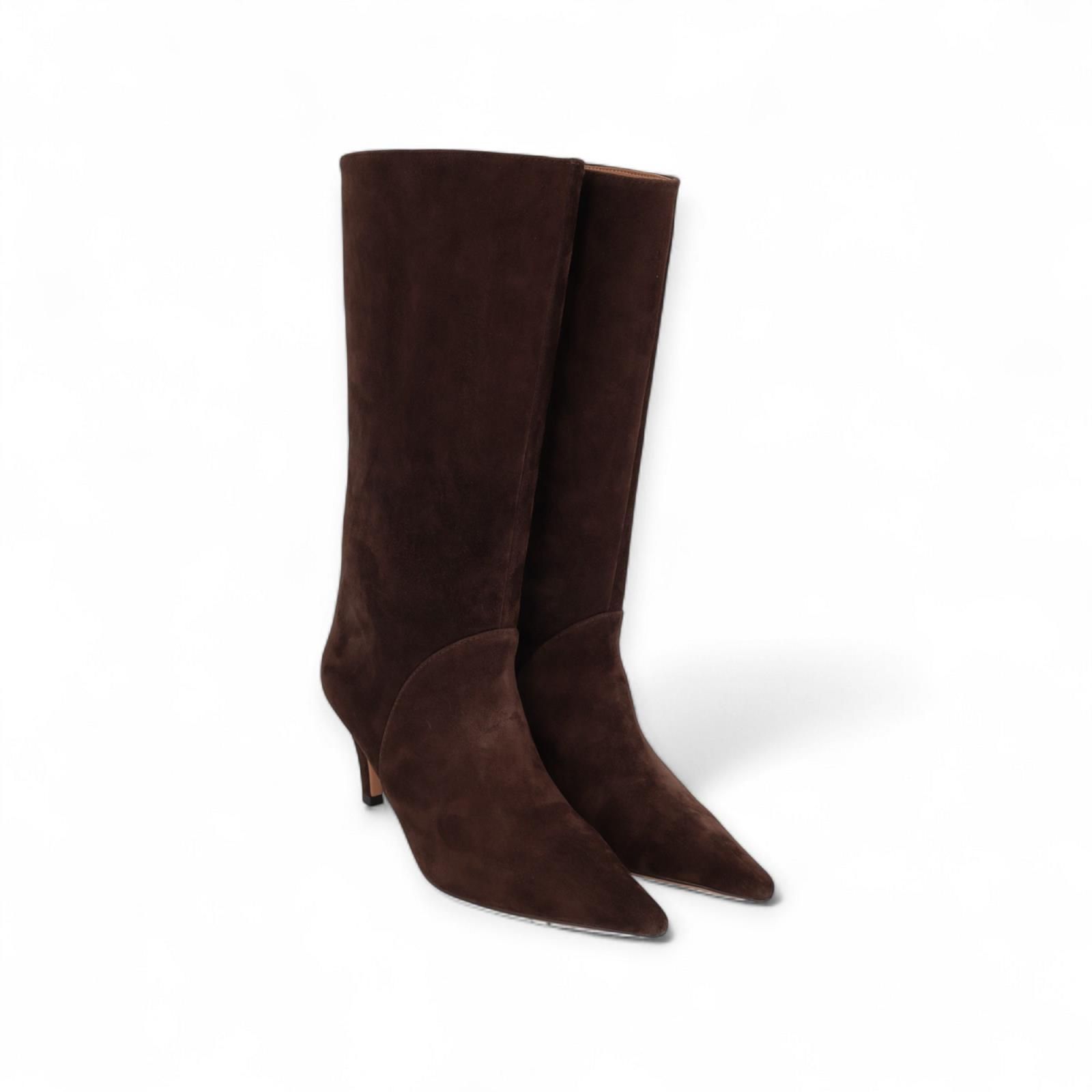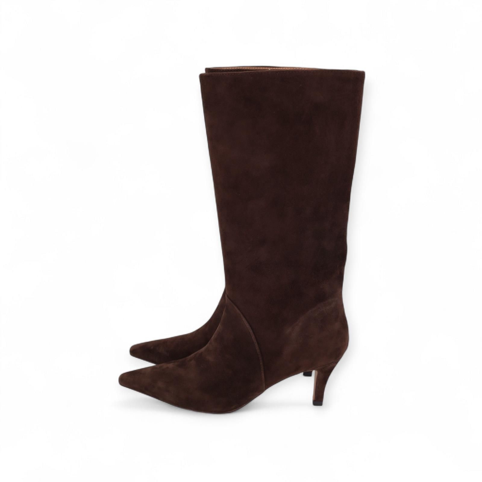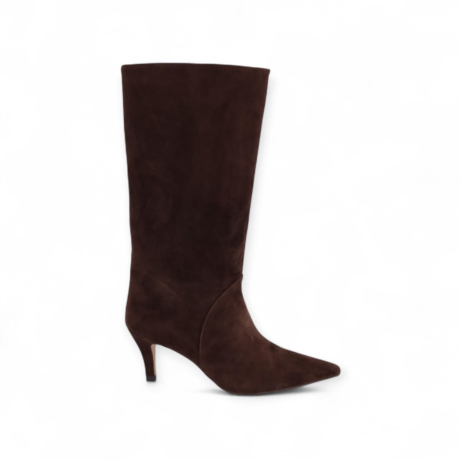 Laars van Lola Cruz voor dames. Deze elegante laars is in bruin suède met een stiksel aan de schacht. Heeft een scherpe top en een geometrische hak van 5-5.5cm hoog.
