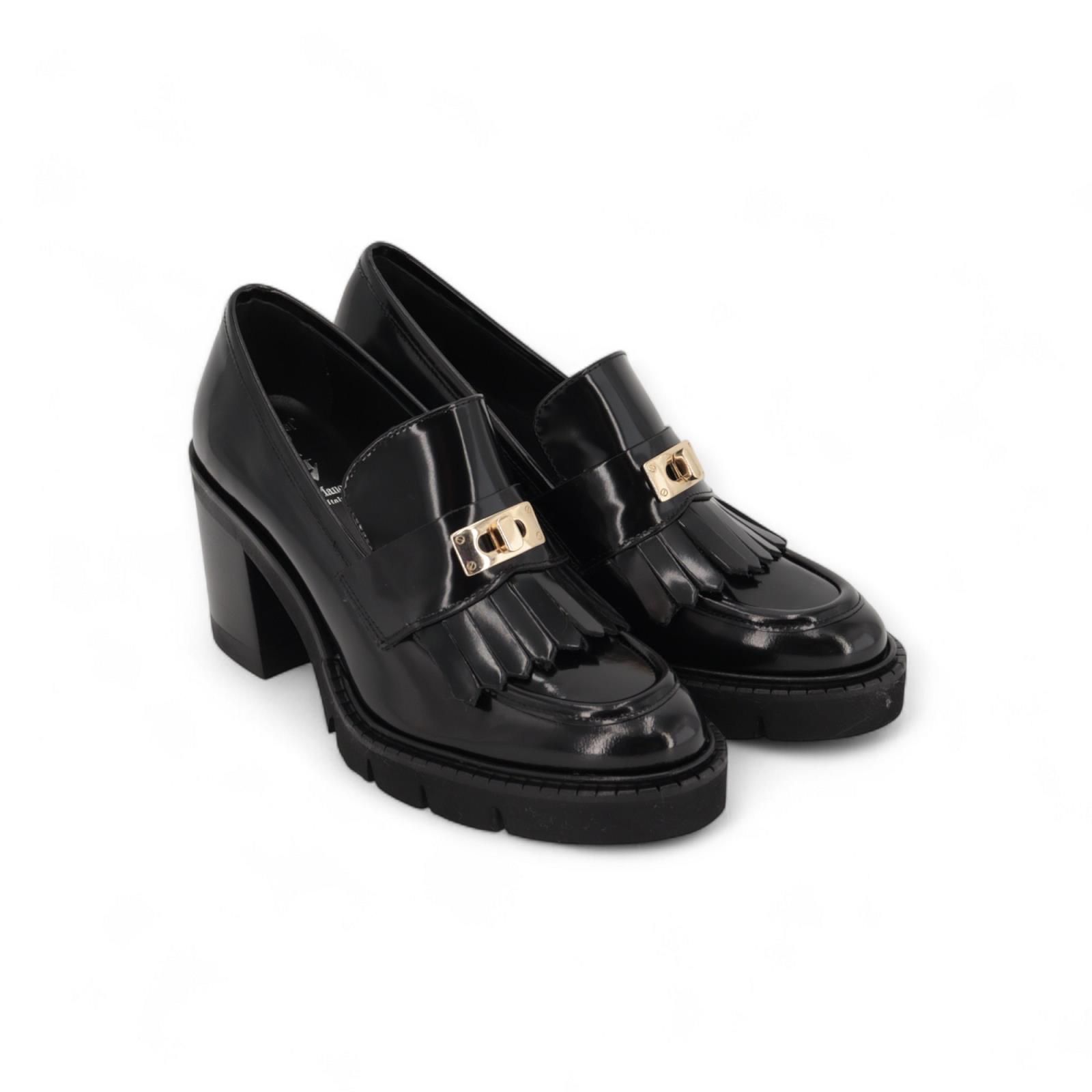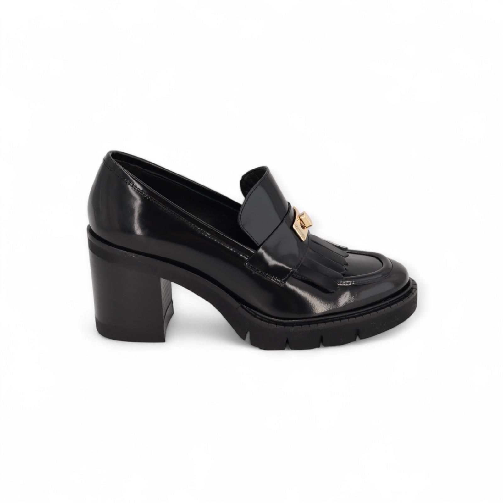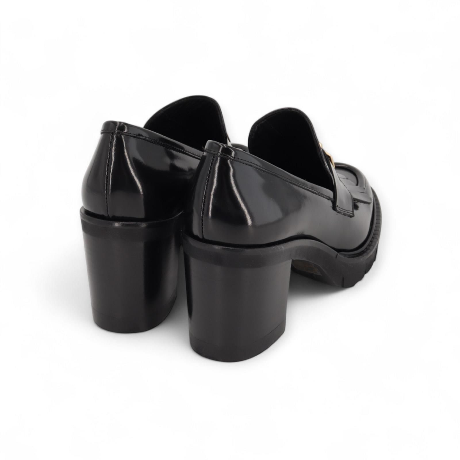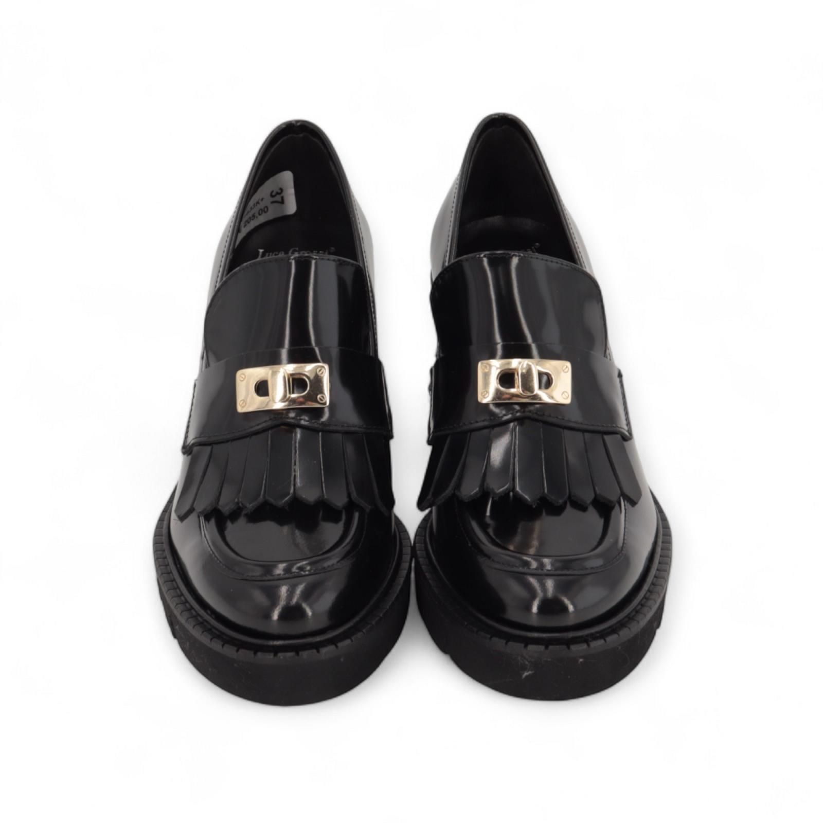Mocassin L559M van Luca Grossi voor dames. Deze mocassin is in zwart leer. Is mooi afgewerkt met een boekel en flap over de wreef met een gouden sluitingdetail. Is op een dikke antislipzool met een blokhak van 6cm hoog.