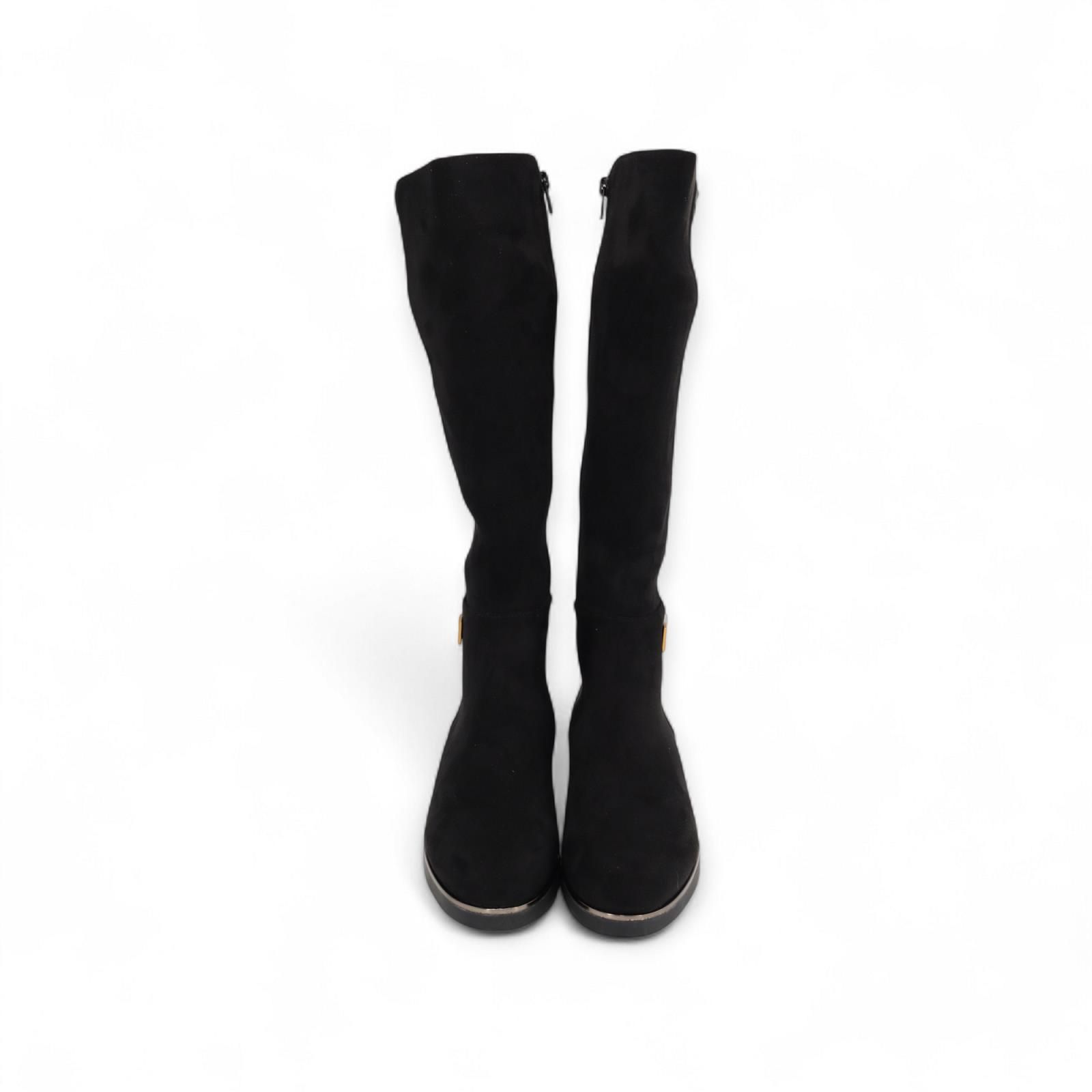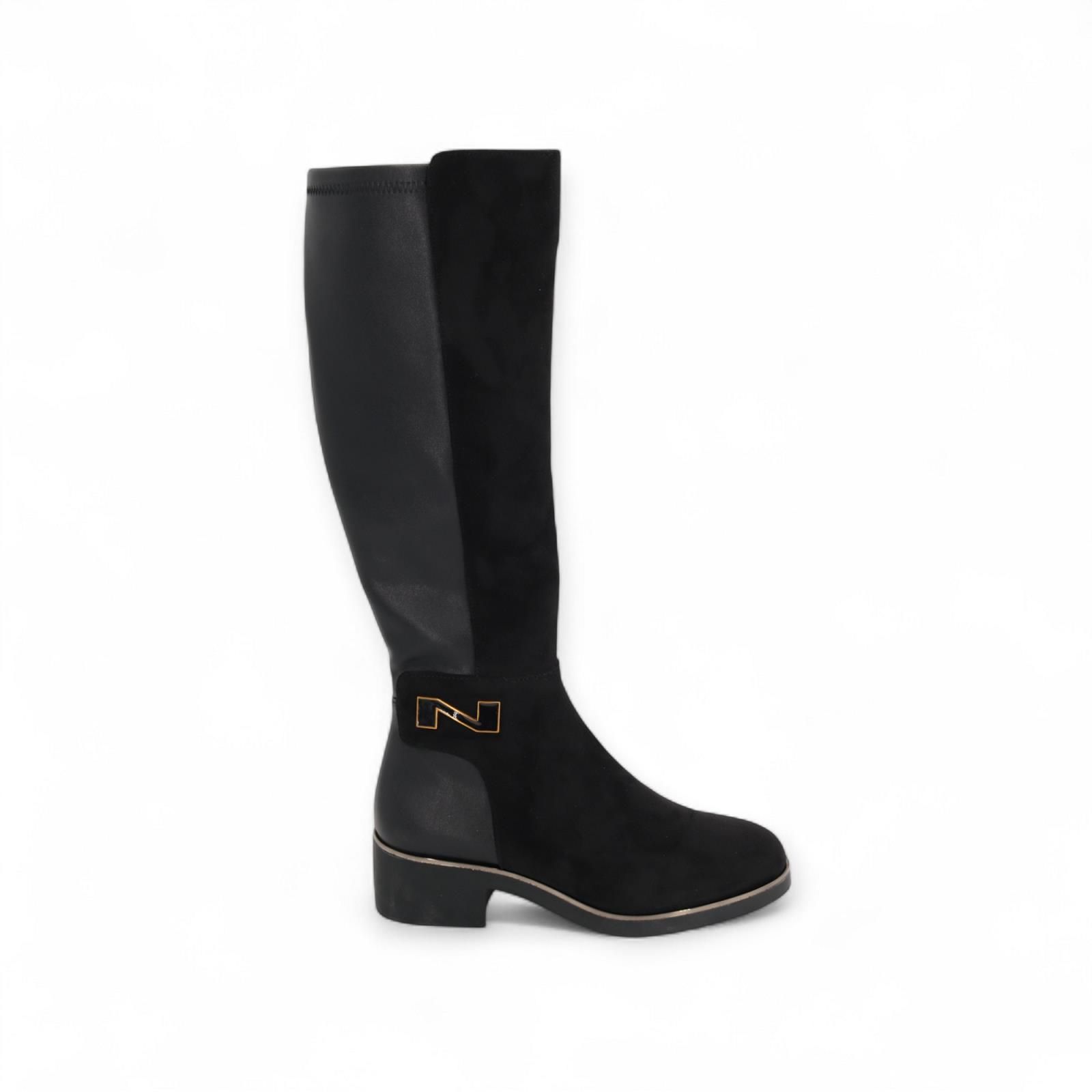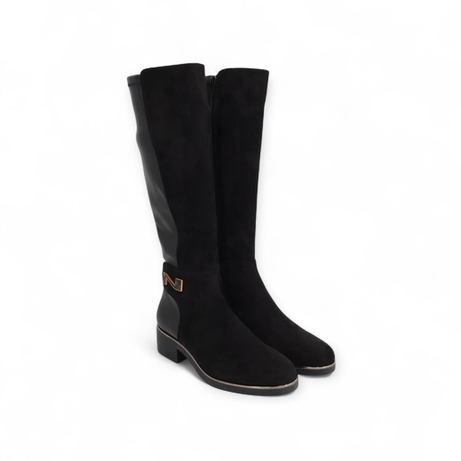 Laars van Nathan-Baume voor dames. Deze laar is in zwart suède en leer. Heeft een volledige ritssluiting aan de zijkant. Is mooi afgewerkt met onderaan het N logo in goud. Is op een dikke zwarte antislipzool met gouden rand en een blokhakje van 2-2.5cm hoog.