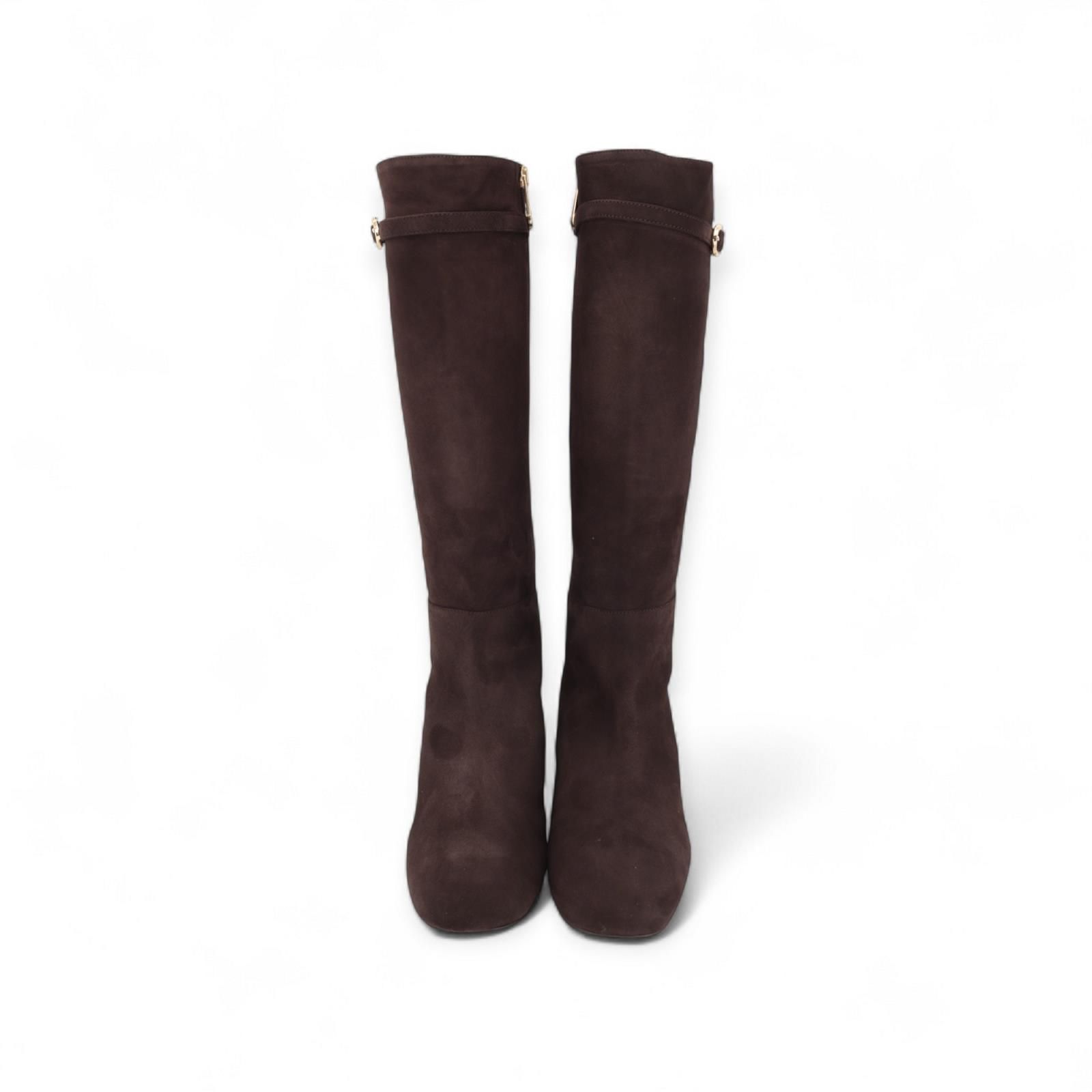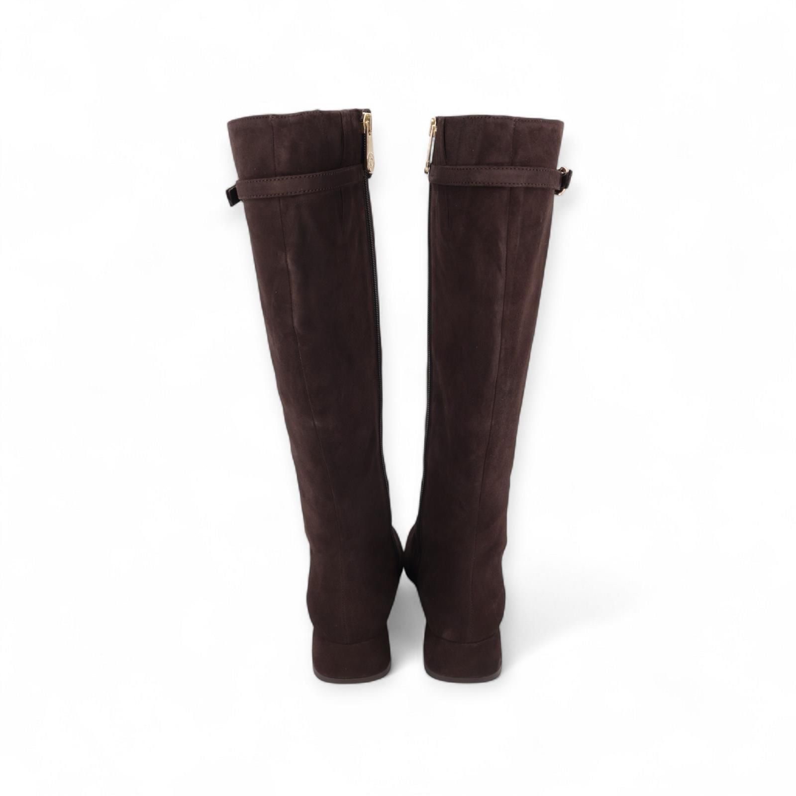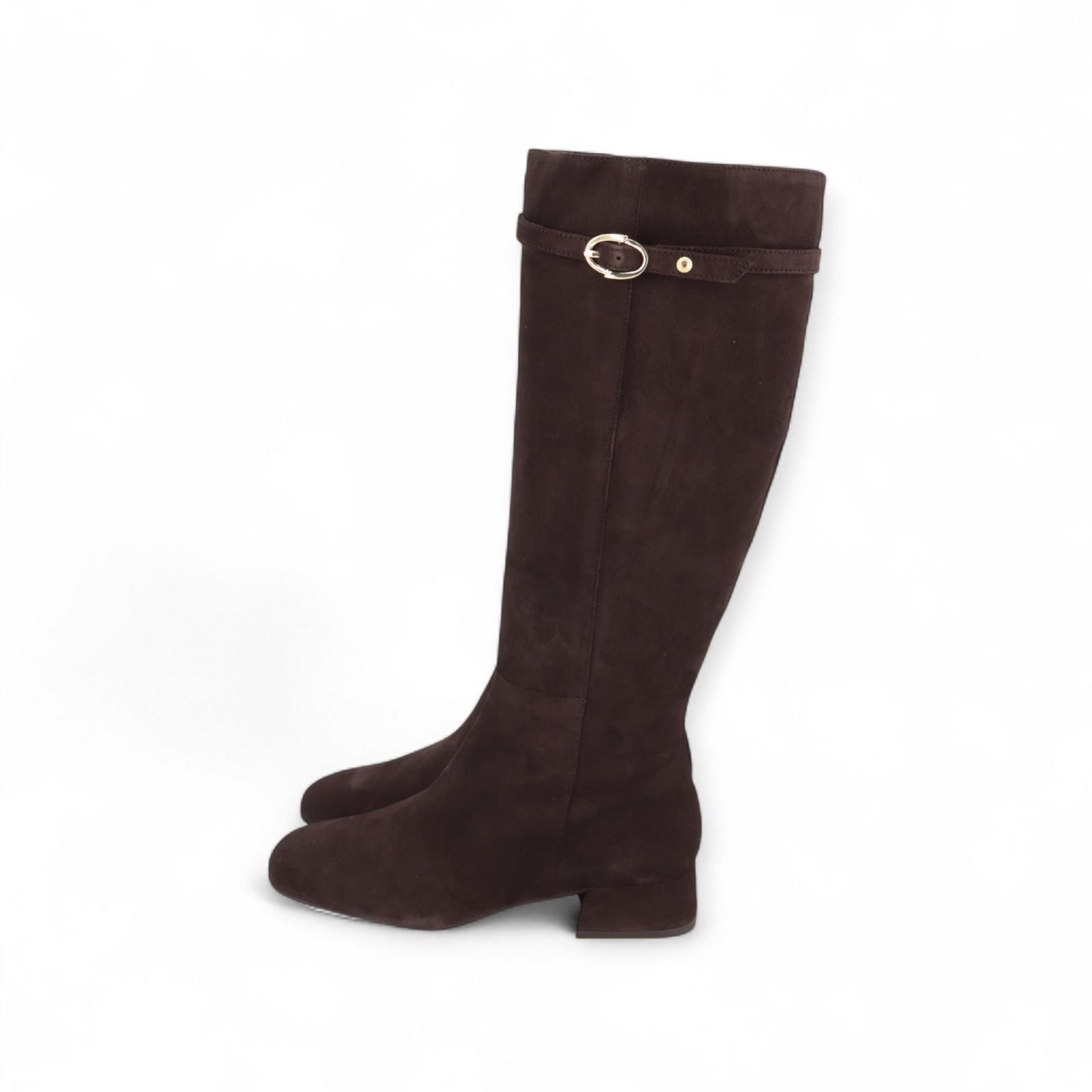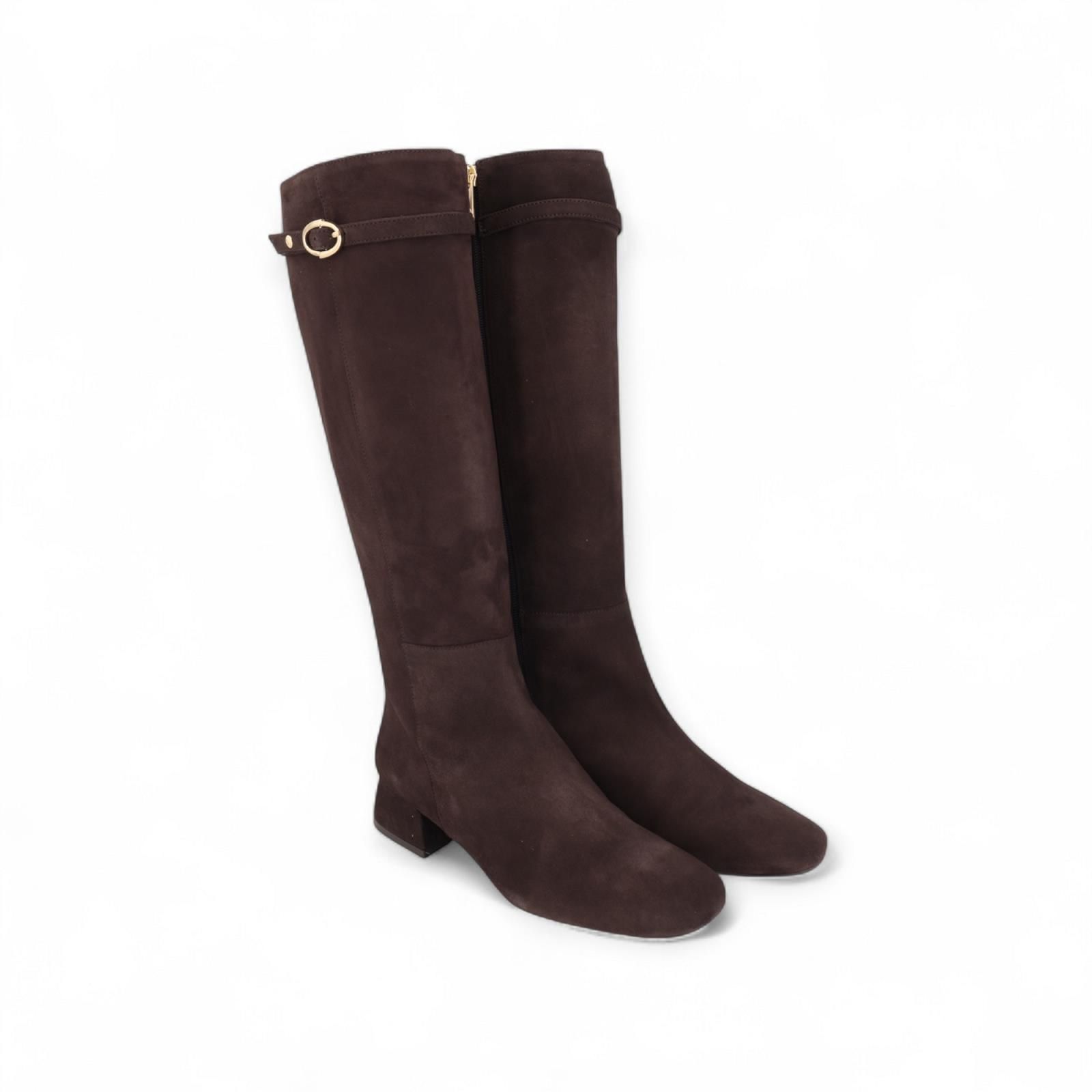 Laars van Pedro Miralles voor dames. Deze laars is in bruin suède. Heeft als extra detail een bandje rond de enkel met gouden gespsluiting. Is met een carré top en een blokhakje van 3-3.5cm hoog. Heeft een antislipzool en een ritssluiting aan de zijkant.
