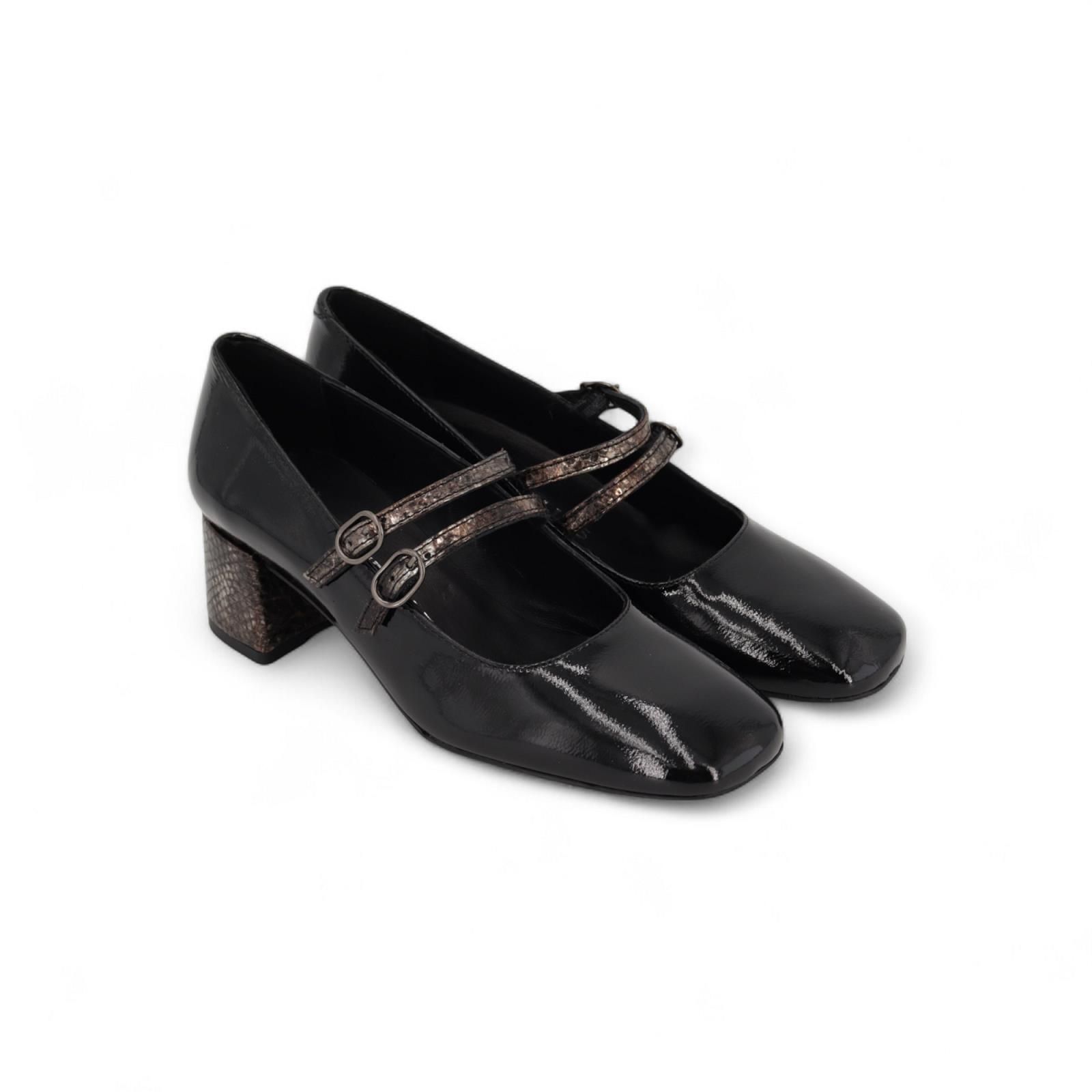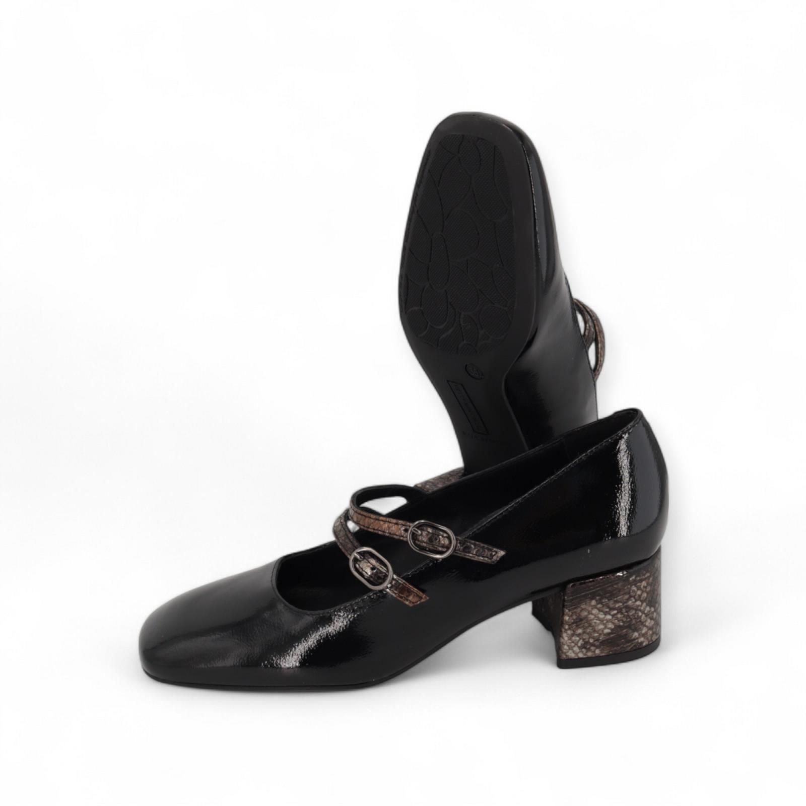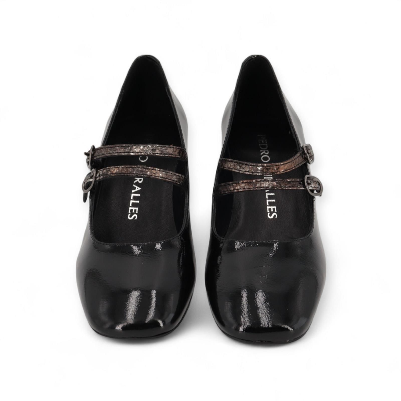 Pump van Pedro Miralles voor dames. Deze pump is in zwart lak met bronzen details . Heeft een carré top en een blokhak mooi afgewerkt in geschubt brons lakleer van 5 cm hoog. Is afgewerkt met 2 bandjes over de wreef in geschut brons lakleer.