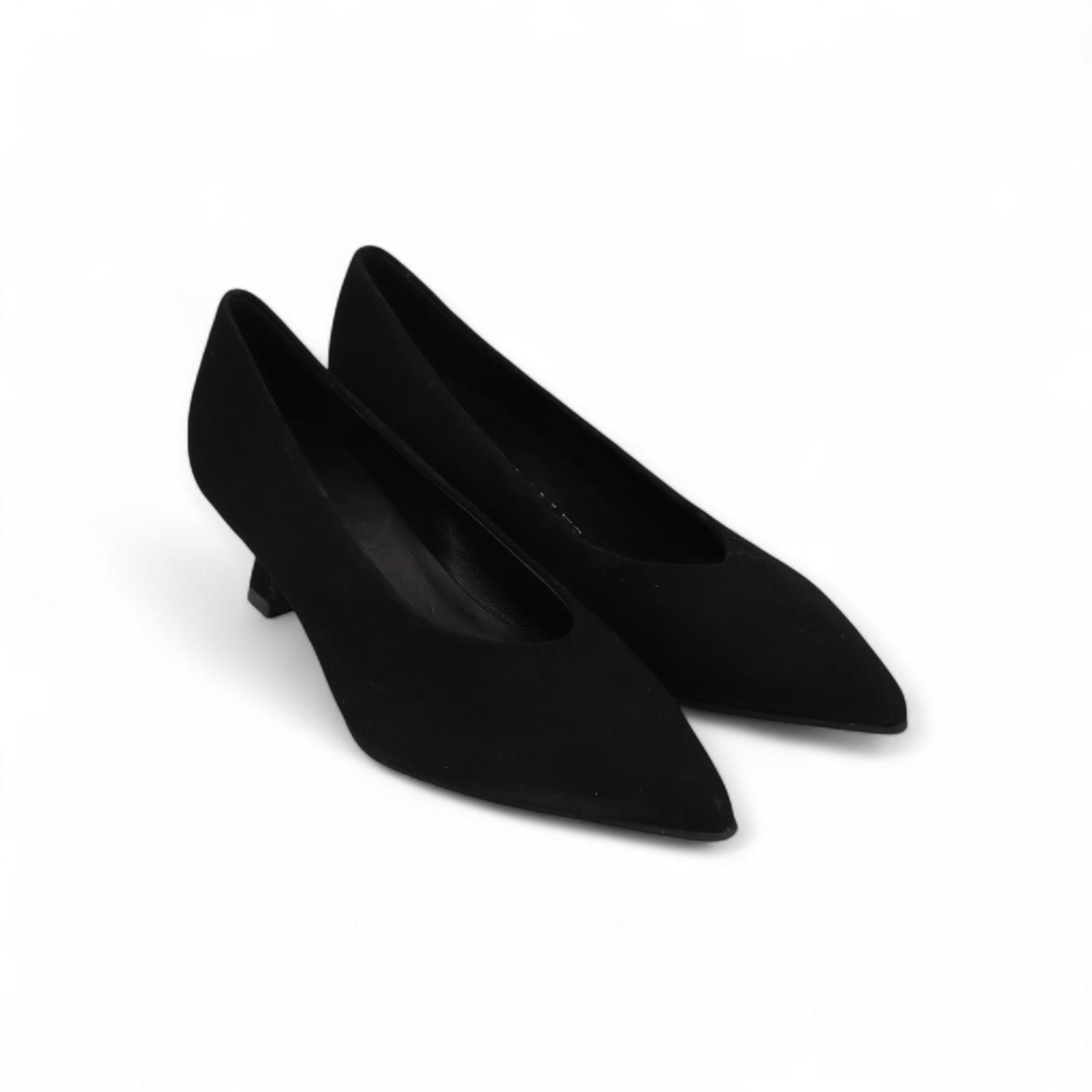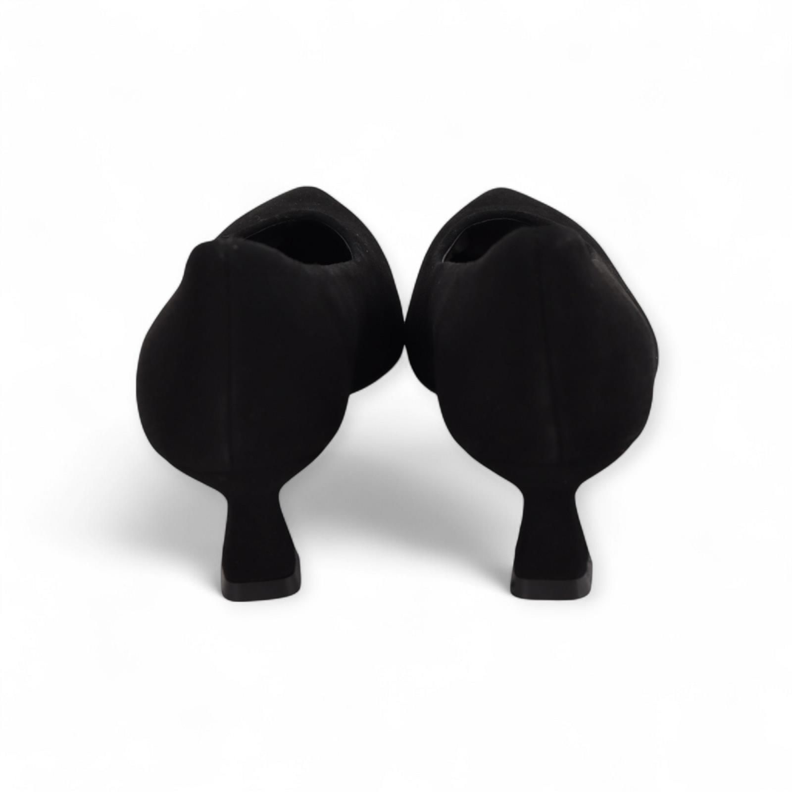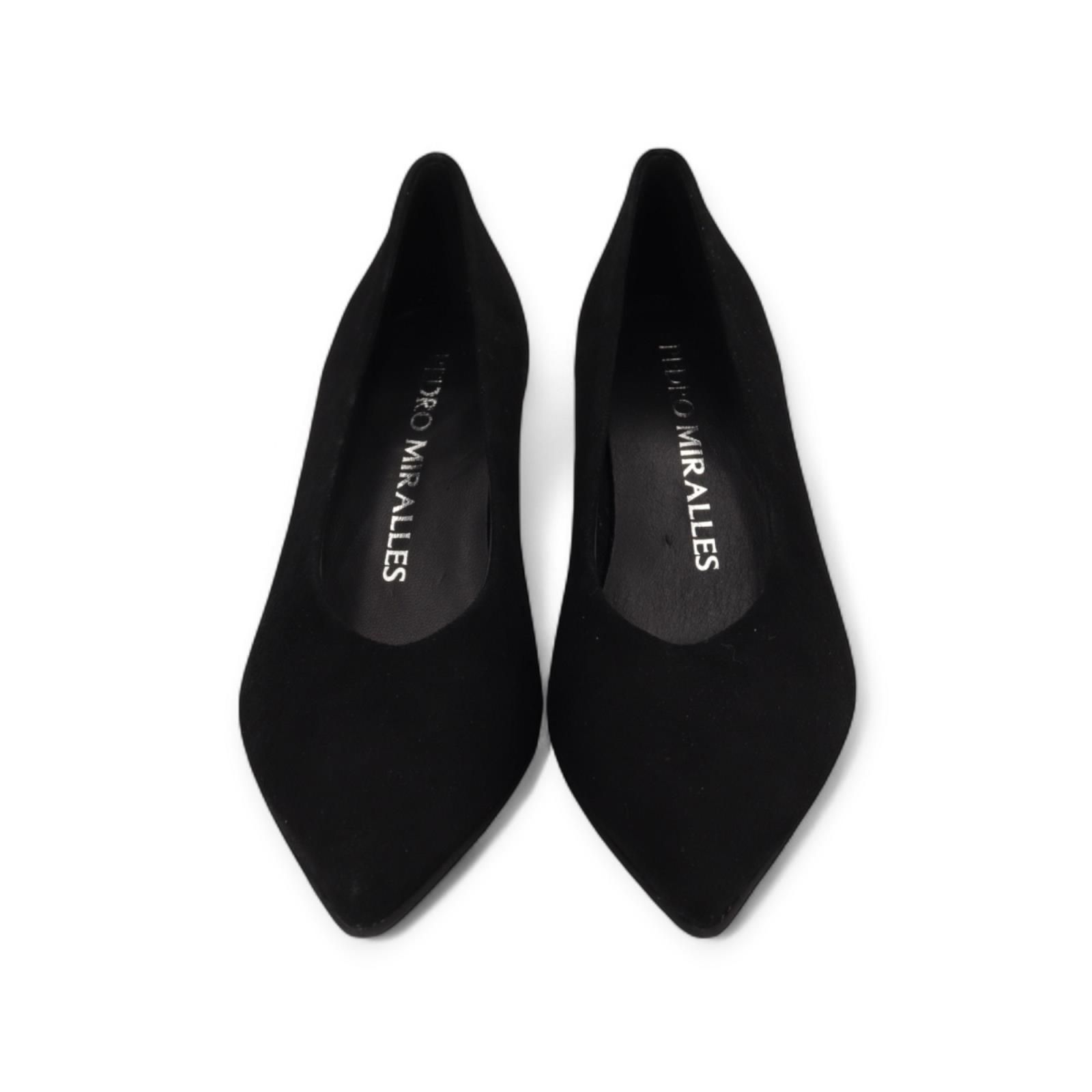 Pump van Pedro Miralles voor dames. Deze elegante pump is in zwart suède met een scherpe punt. Heeft een fijn houten hakje van 5cm hoog. De binnenkant is in leer en is op een antislip zool.