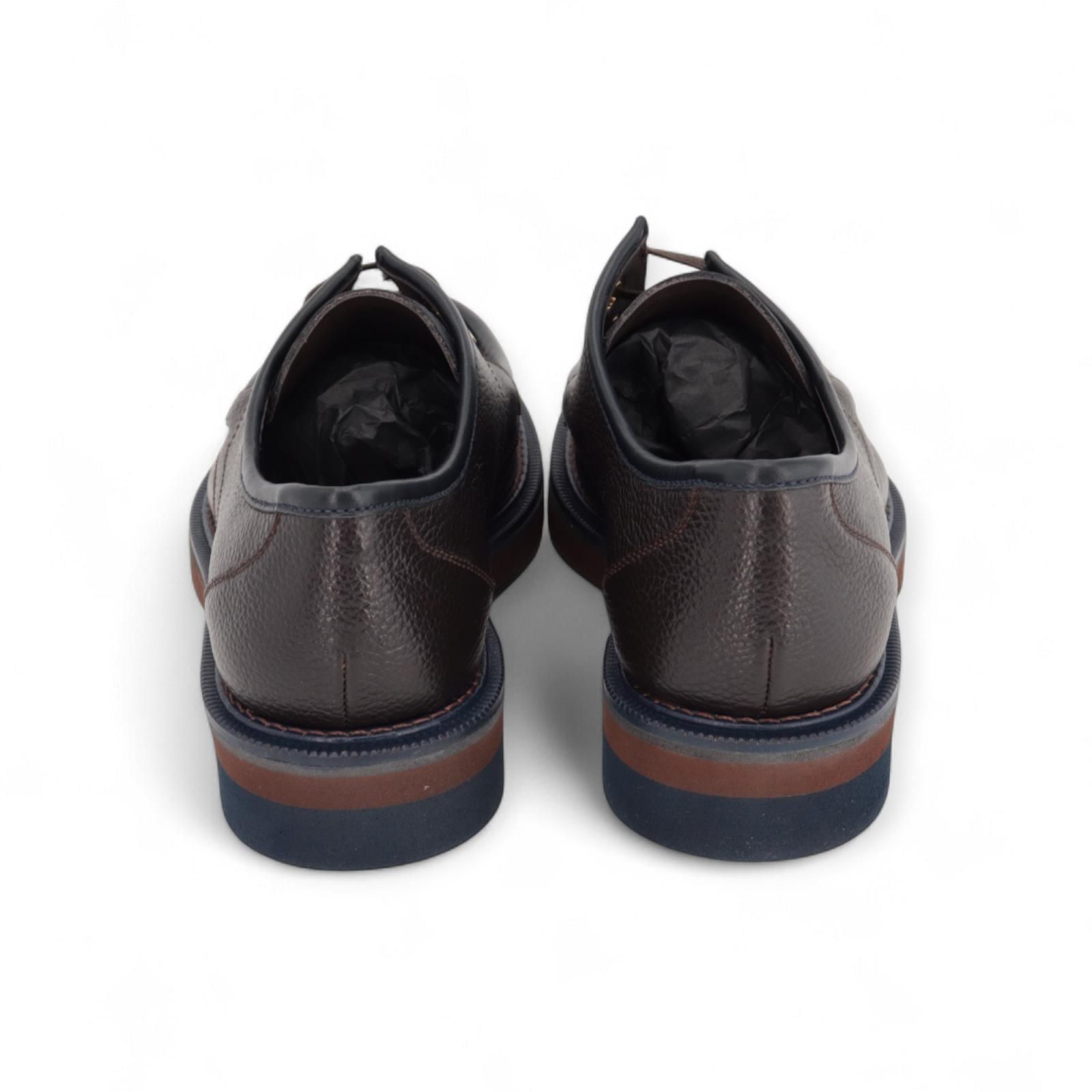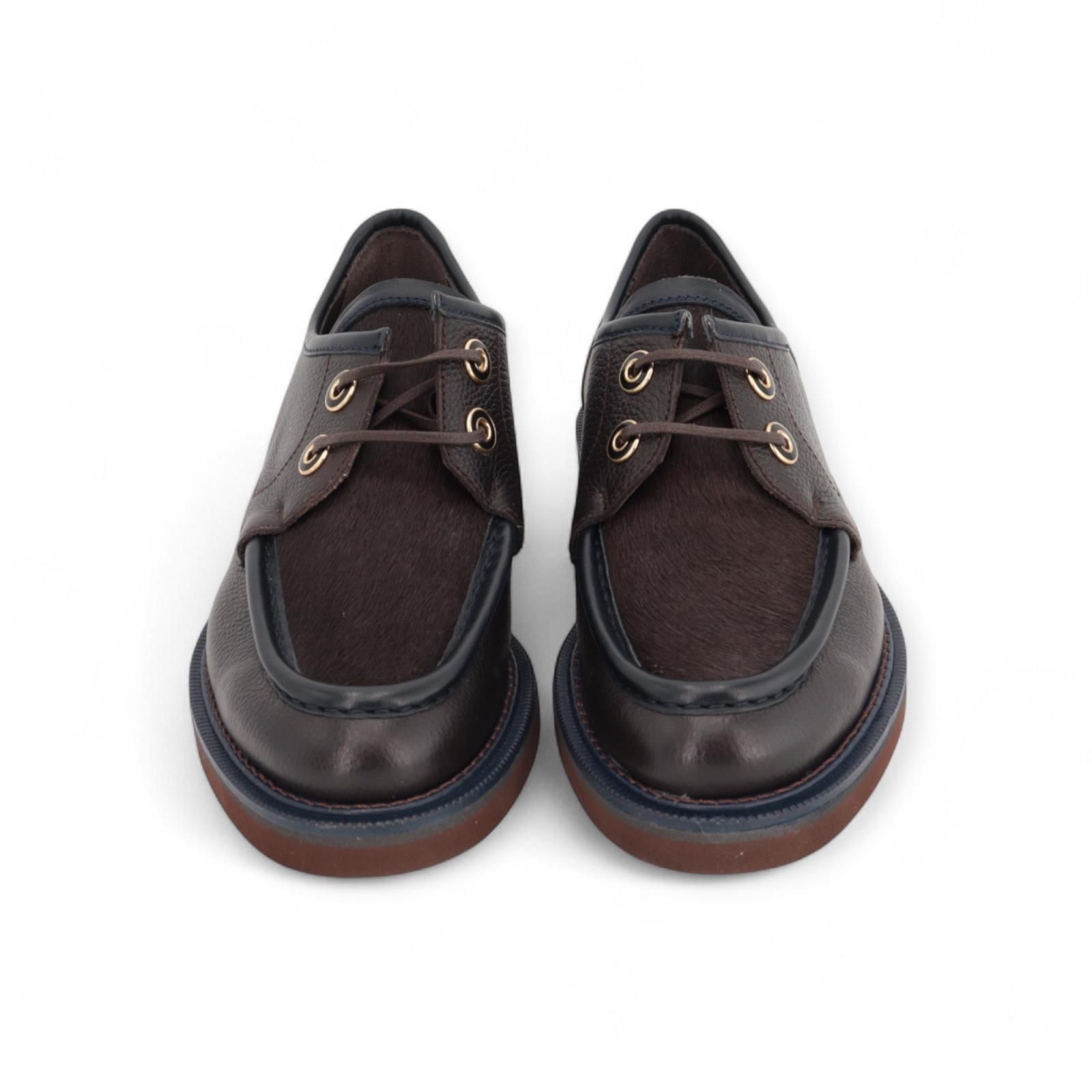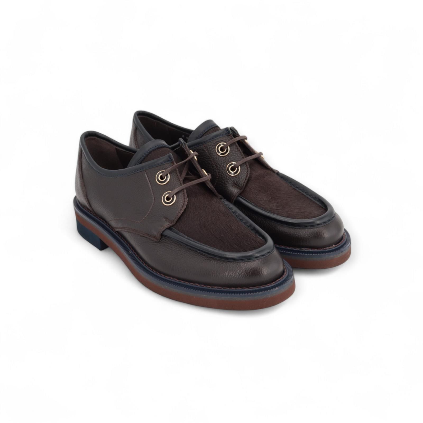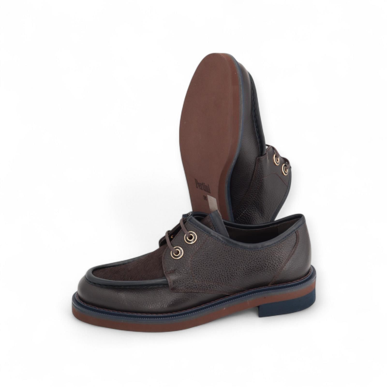 Veterschoen van Pertini voor dames. Deze veterschoen is in bruin gekorreld leer met pels bovenaan. Heeft een dikke blauwe stekking op de voorvoet en rond de schoen. Is afgewerkt met opvallende gouden vetergaten die het model nog eleganter maken. De antislipzool is met een blauwe en cognac band.