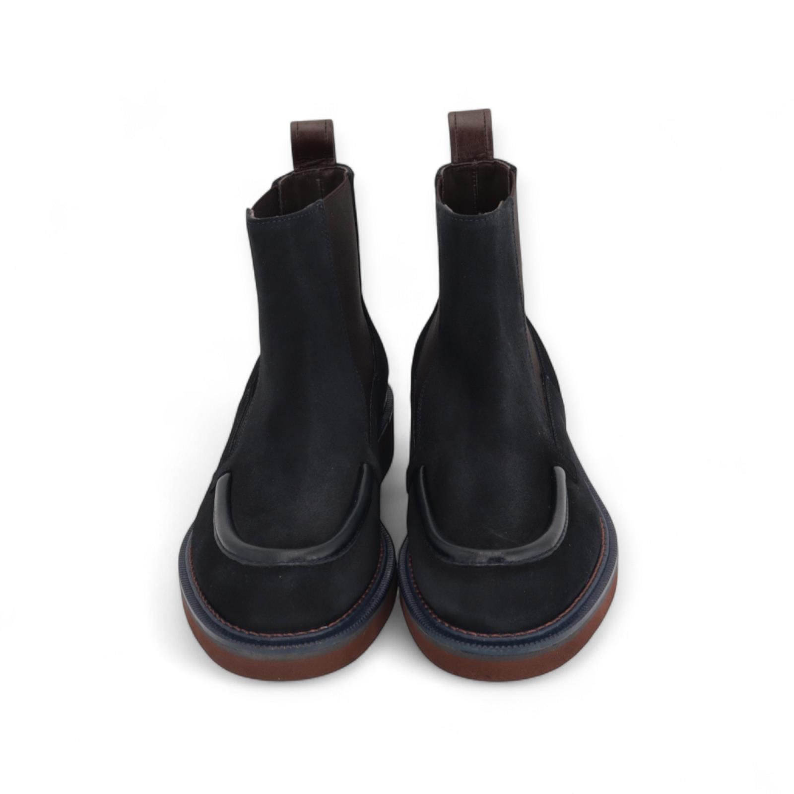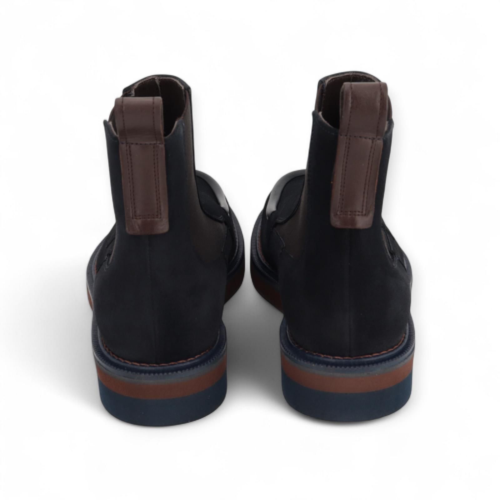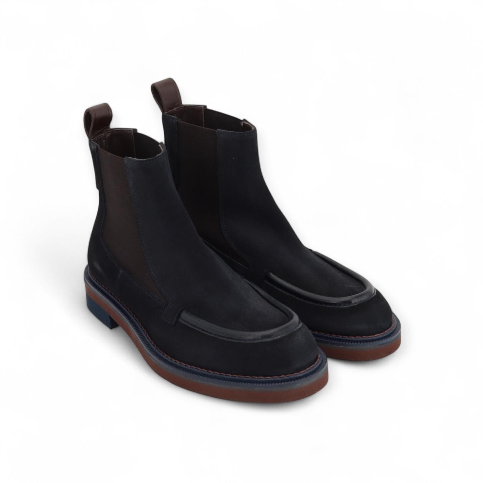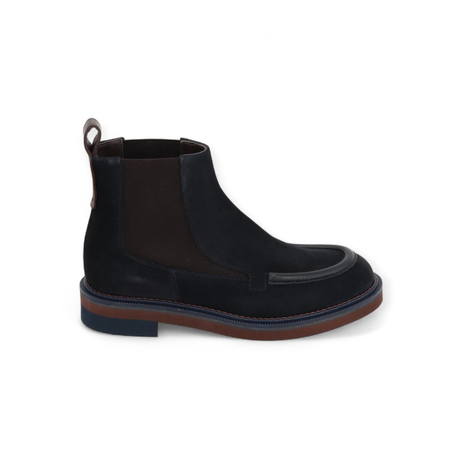 Enkellaars van Pertini voor dames. Deze enkellaars is in blauw suède met een dikke stekking op de voorvoet. Is met zwarte rekkers aan de zijkant met een cognac brede hiellip voor het model makkelijk aan te trekken. Is op een mooi afgewerkte antislipzool met blauwe en cognac band.