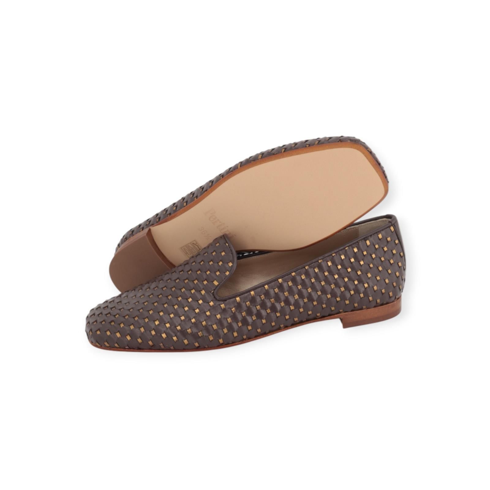 Mocassin van Pertini voor dames in bruin leer. Deze elegante mocassin is in geweven bruin leer met brons metallic. Is op de wreef mooi uitgesneden aan de zijkant zodat hij makkelijk aantrekbaar is. Heeft een carré top met een fijn hieltje en een leren buitenzool.