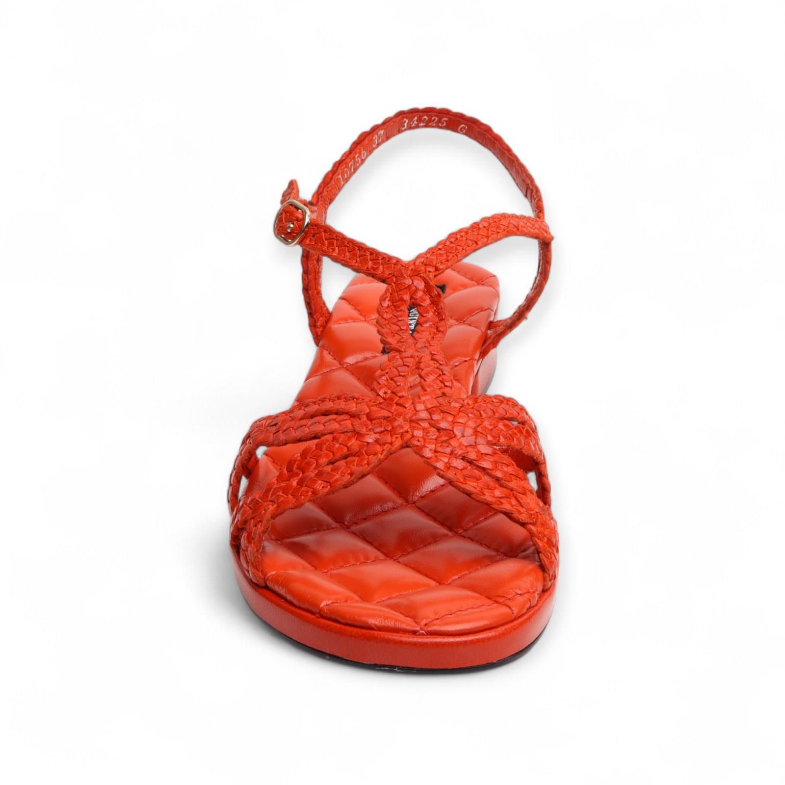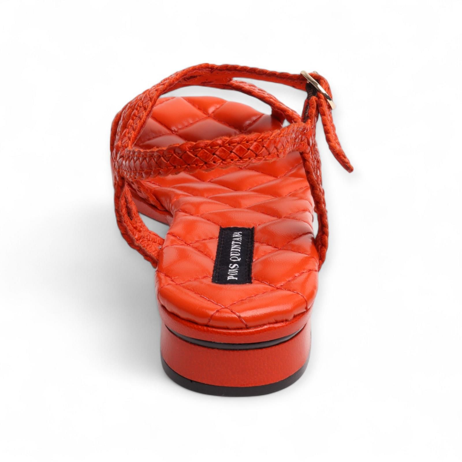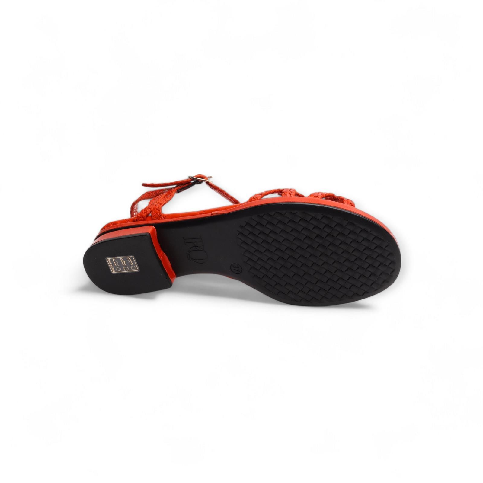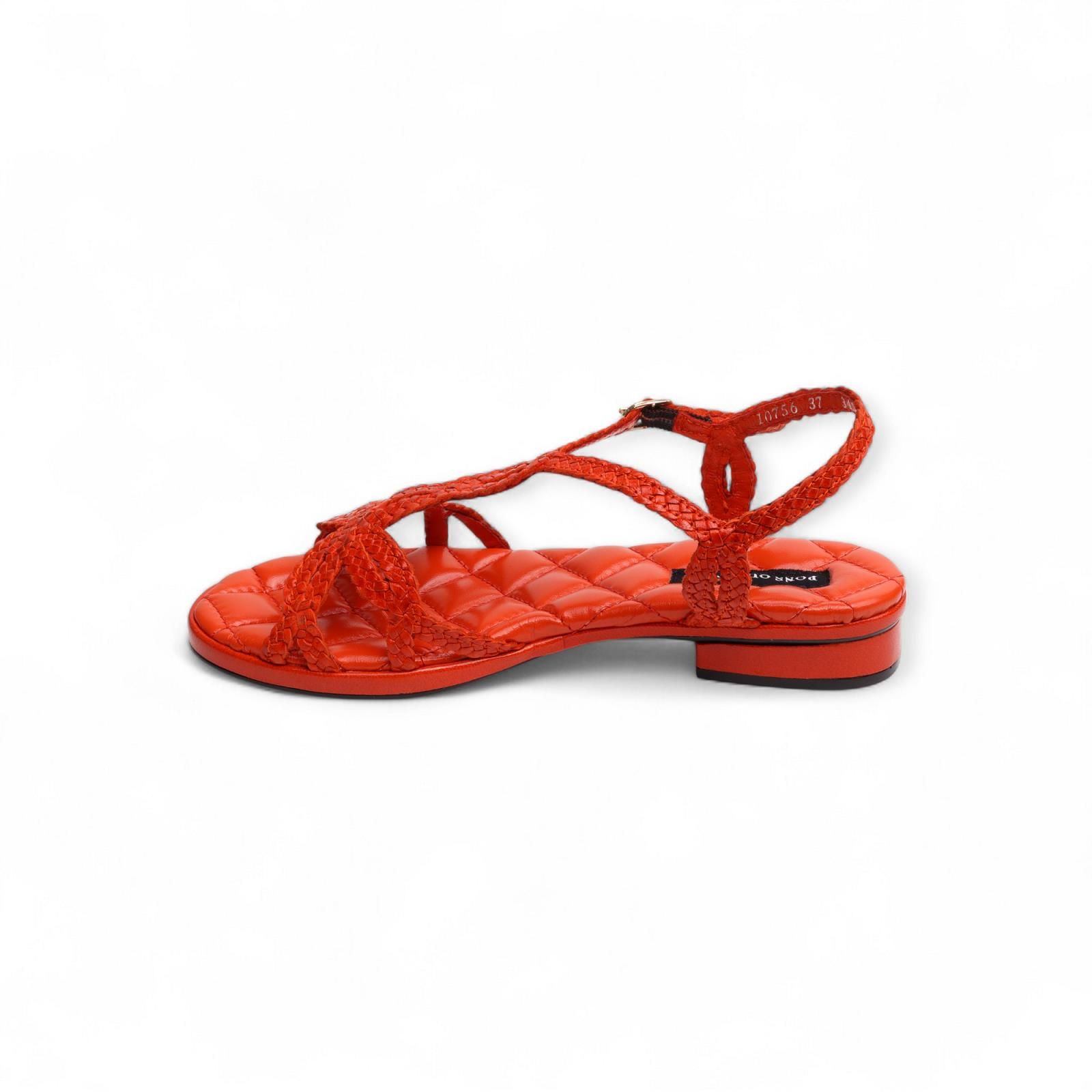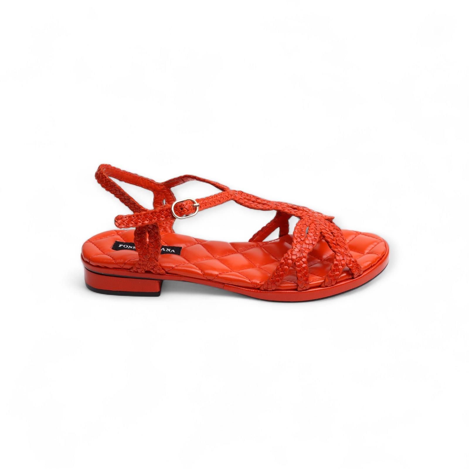 Sandaal Diana van Pons Quintana voor dames. Dit elegant sandaaltje is in oranje met de hand gevlochten leer. Heeft een halfronde neus en diverse bandjes rond de voet. Blijft mooi aan de enkel door de gespsluiting. Heeft een antislip buitenzool en een gewatterde binnenzool.