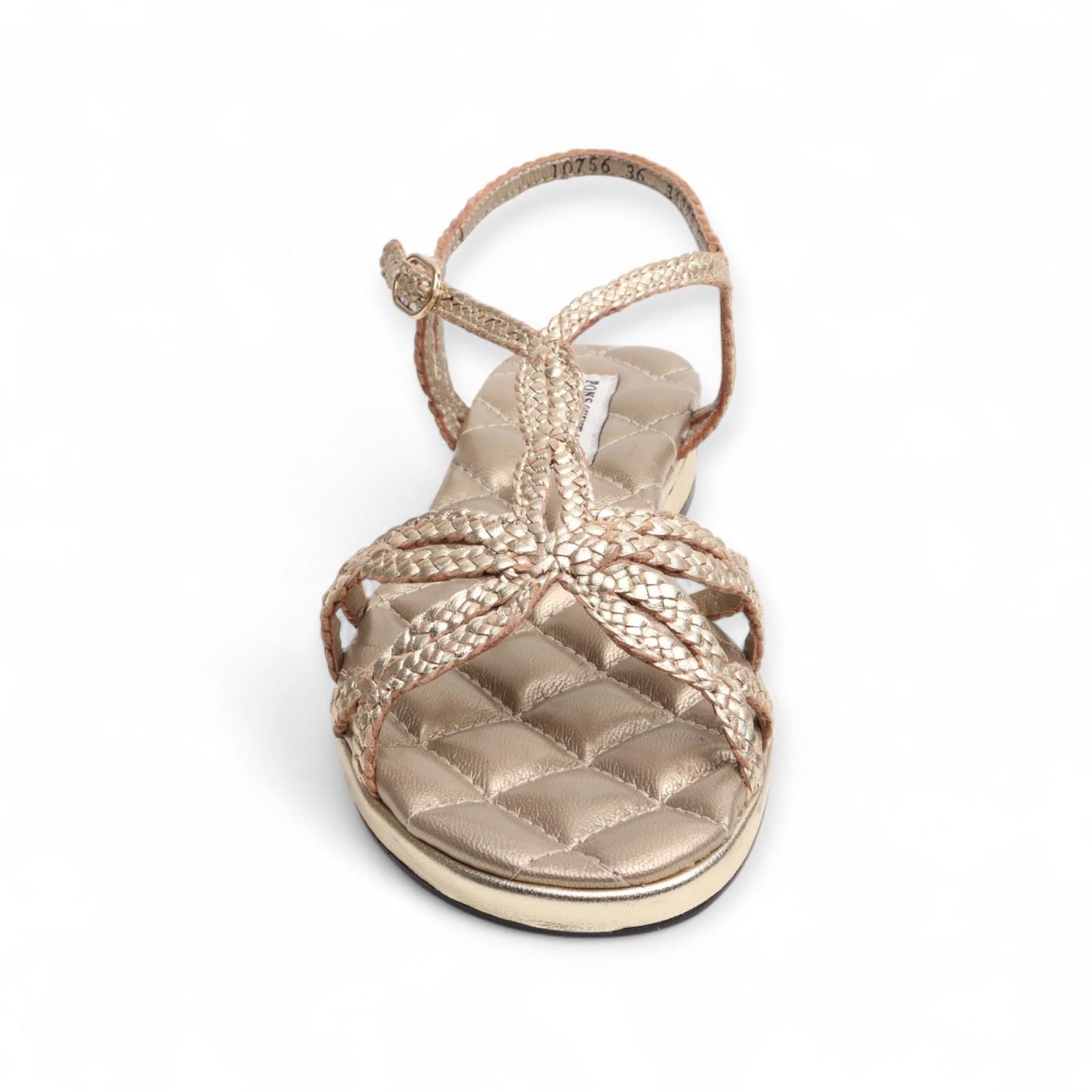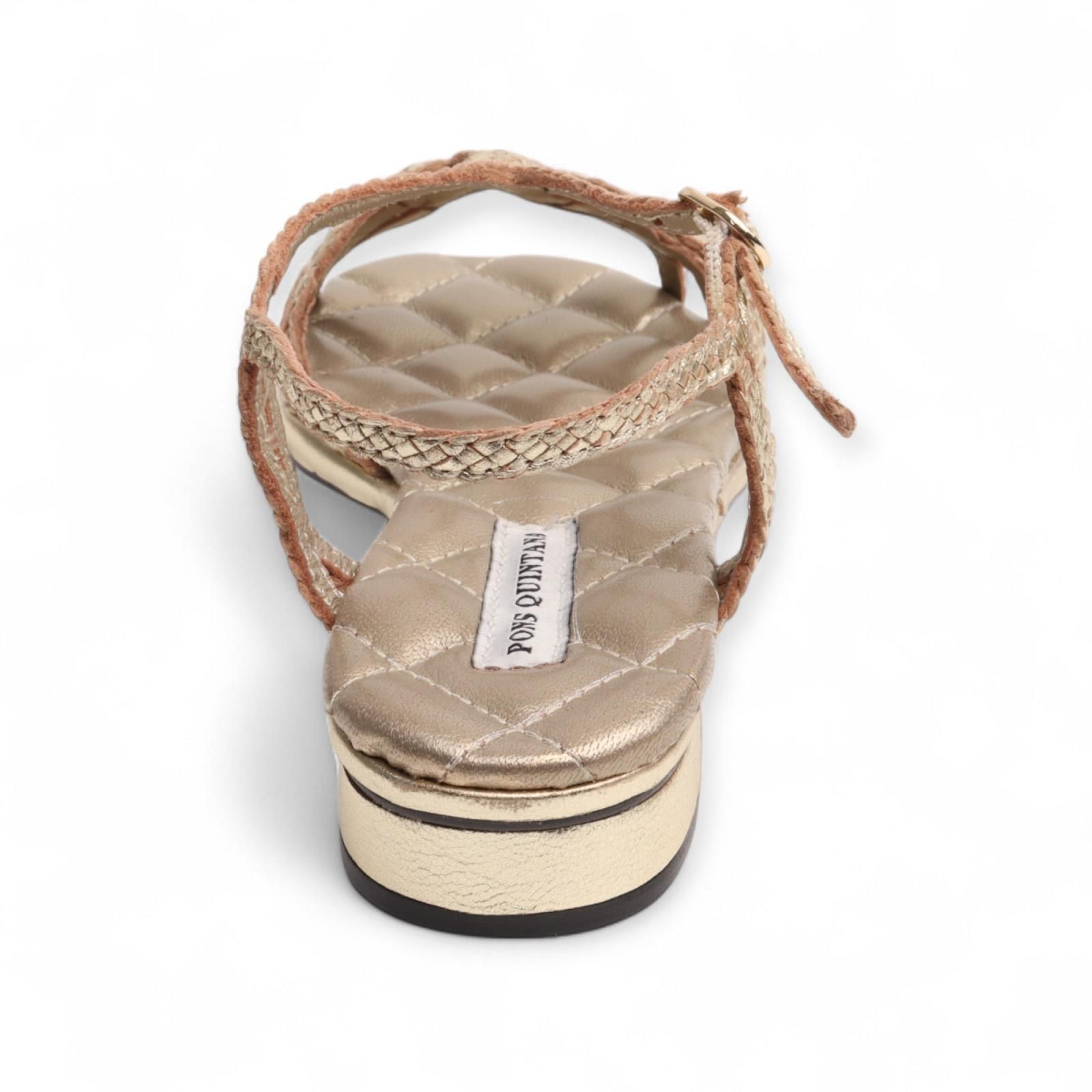 Sandaal Diana van Pons Quintana voor dames. Dit elegant sandaaltje is in platino met de hand gevlochten leer. Heeft een halfronde neus en diverse bandjes rond de voet. Blijft mooi aan de enkel door de gespsluiting. Heeft een antislip buitenzool en een gewatterde binnenzool.