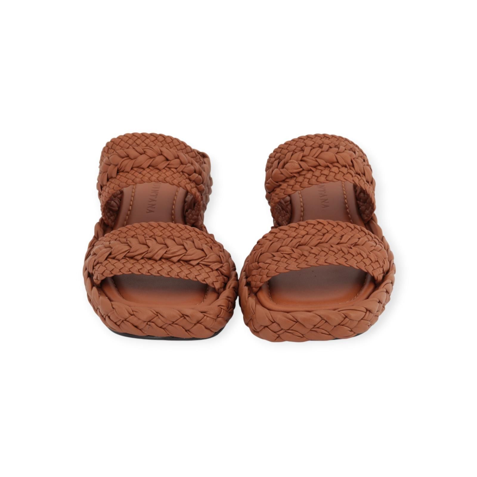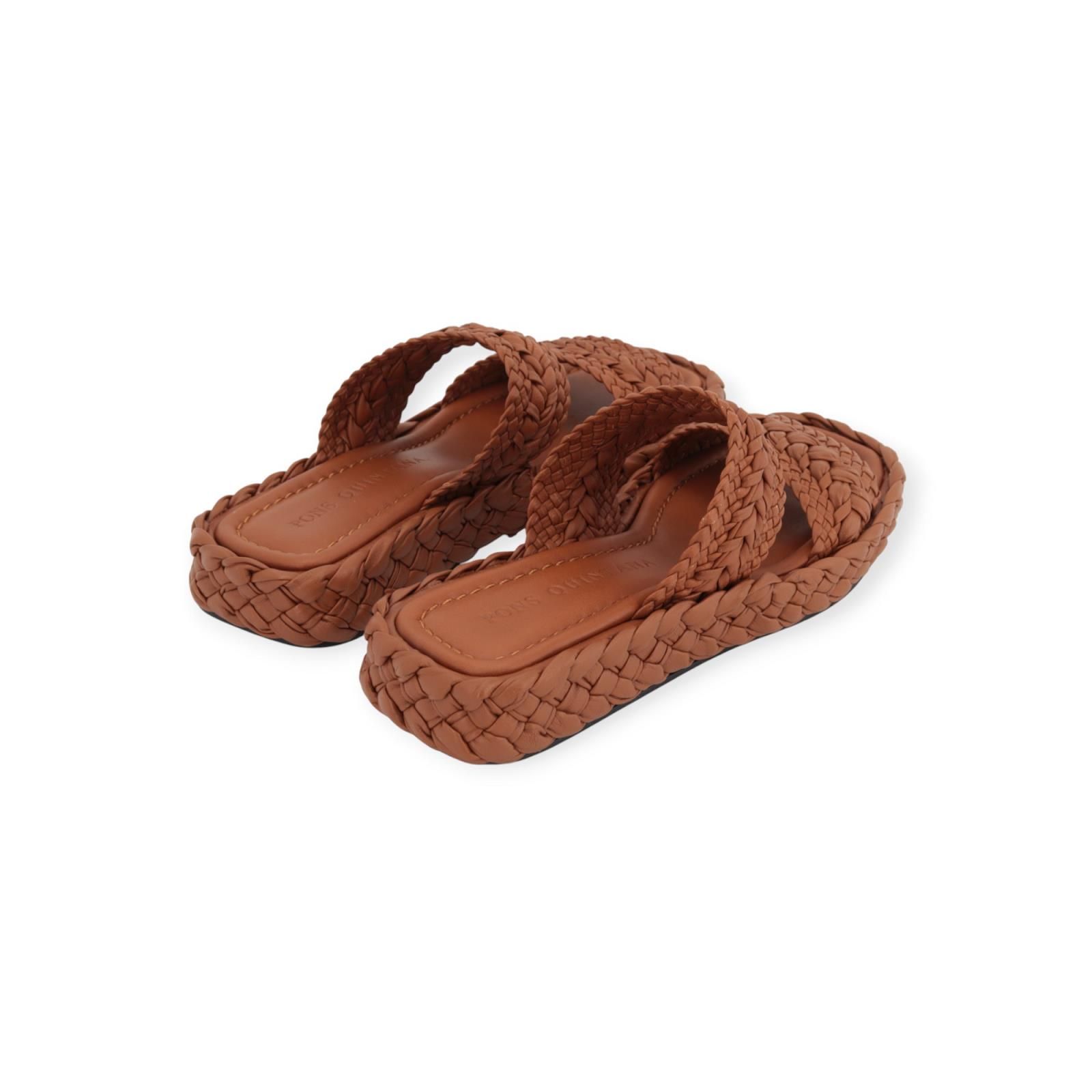 Slipper Malta van Pons Quintana voor dames. Dit muiltje is in cognac tressée leer. Heeft 2 banden over de wreef met structuren tressée. Is op een plateauzool volledig in dik gevlochten techniek. Pons Quintana is hét merk dat bekend staat voor hun subliem comfort en tressée stijl.