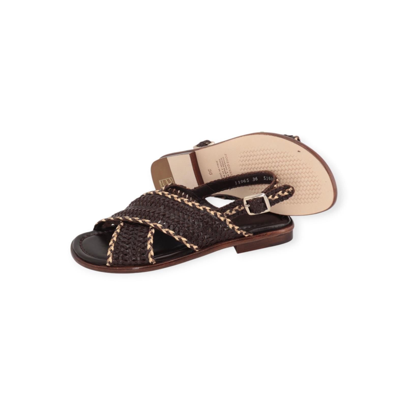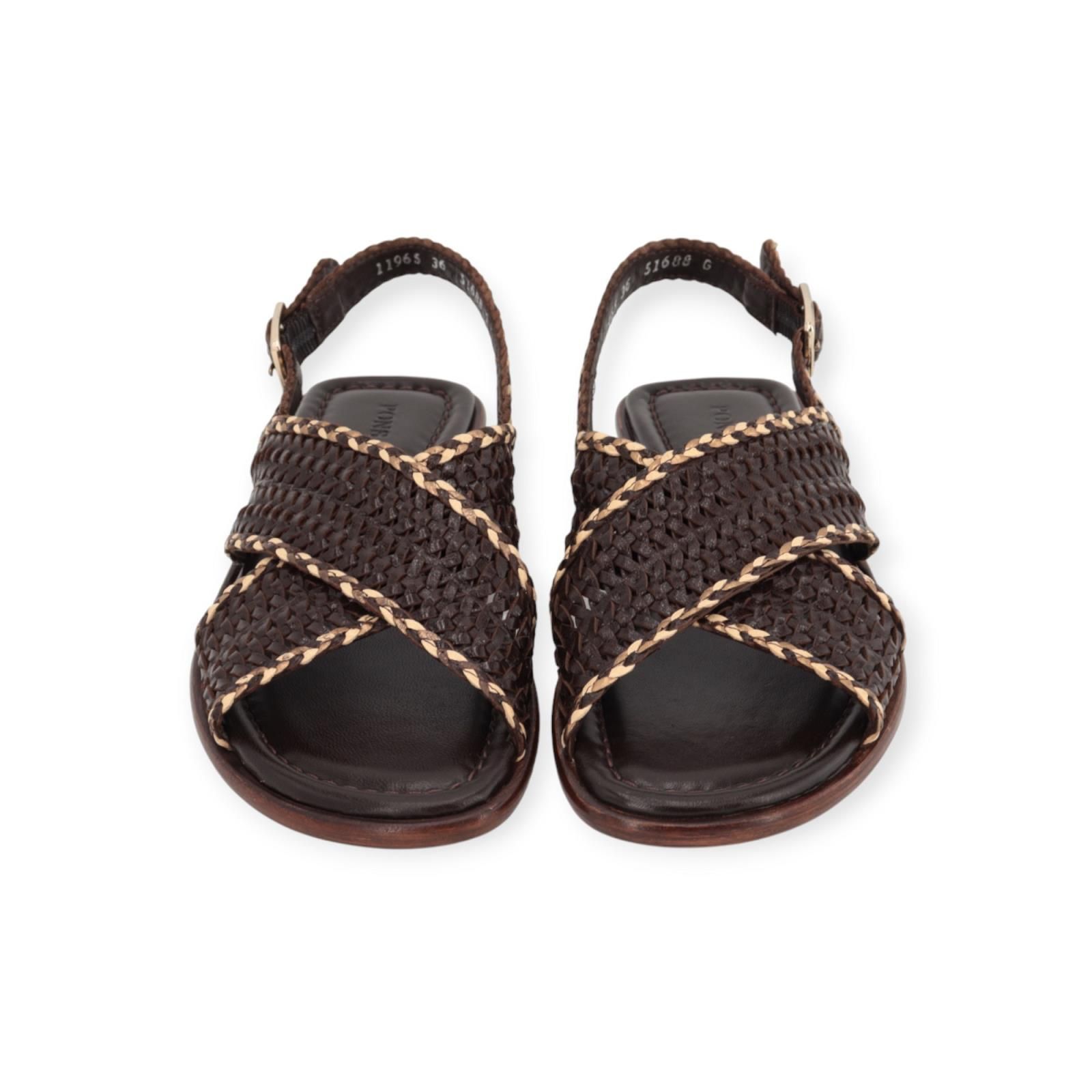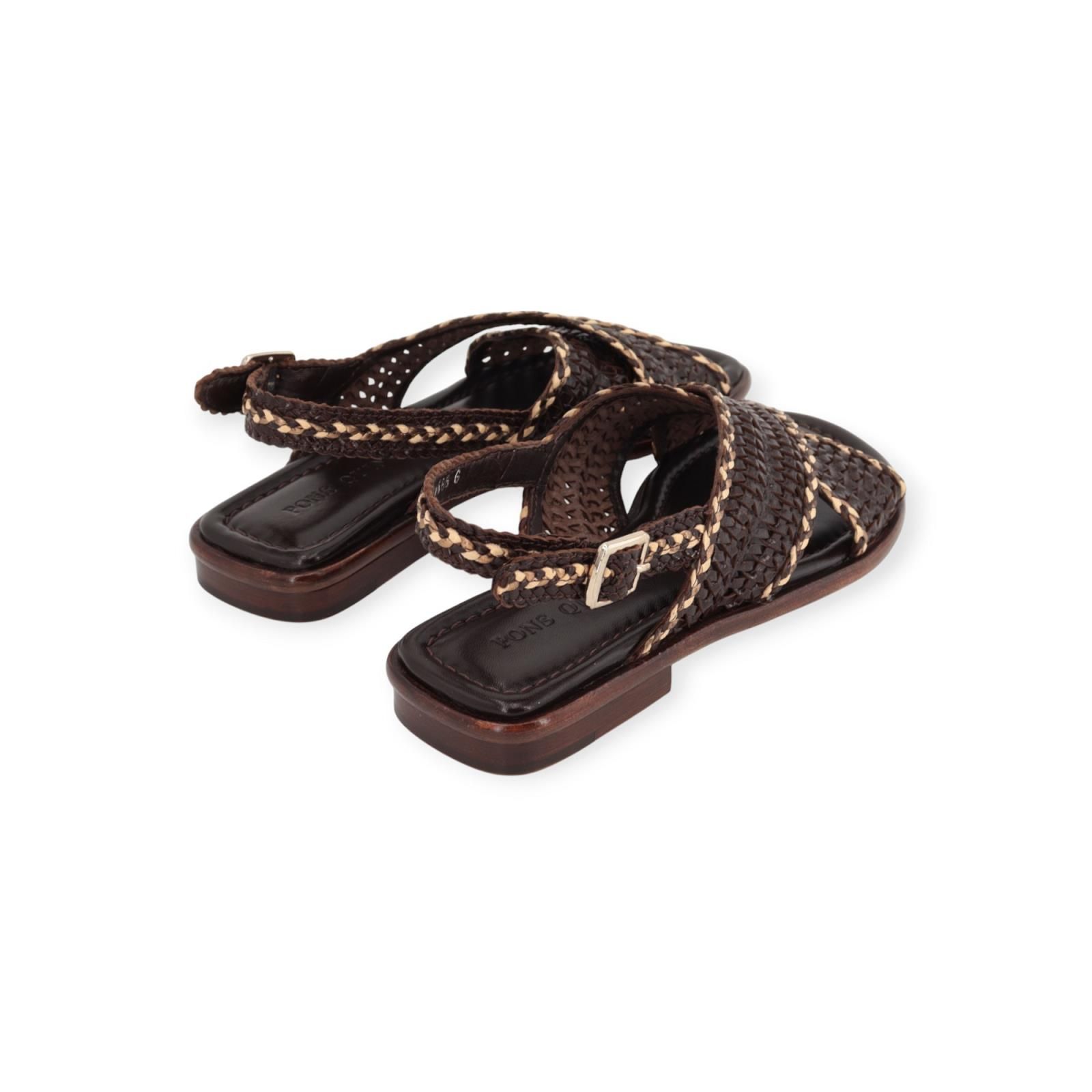 Sandaal Tina van Pons Quintana voor dames. Deze elegante sandaal is in bruin gevlochten tressée leer afgewerkt met beige langs de rand. Heeft een gekruiste band over de wreef en een bandje rond de hiel met gespsluiting. Is op een plat elegant leren buitenzool met een klein hieltje aan om het model nog eleganter af te werken. Pons Quintana is hét merk dat bekend staat voor hun subliem comfort en tressée stijl.