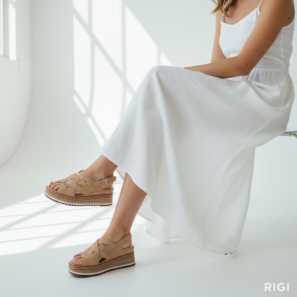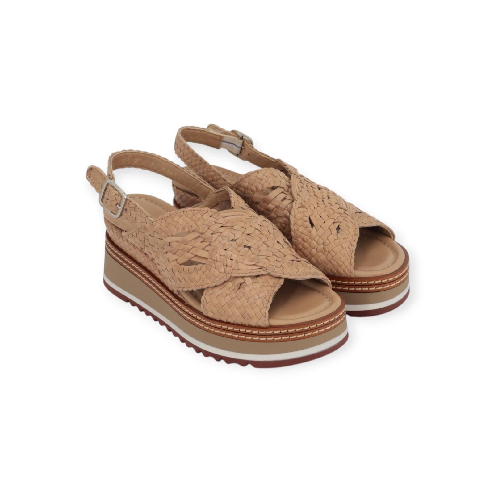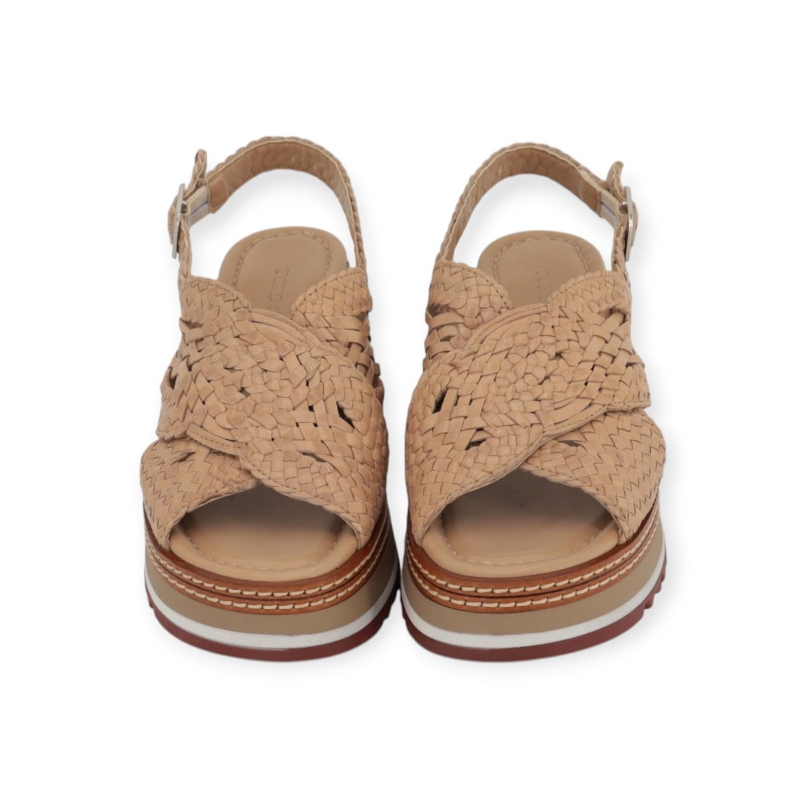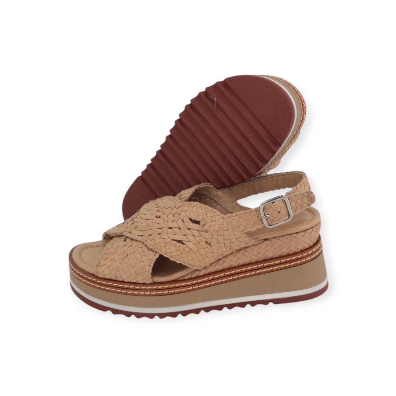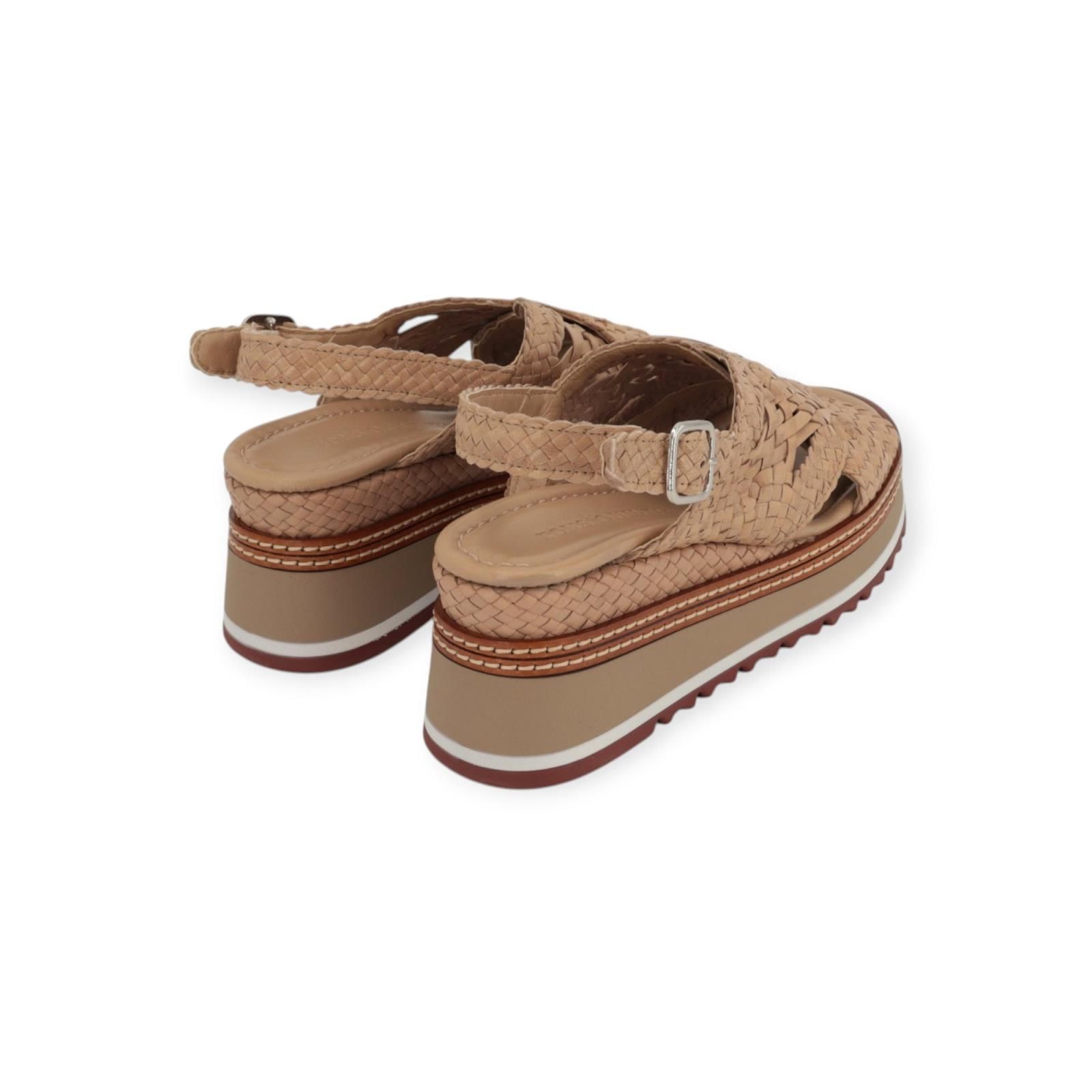 Sandaal Valeri van Pons Quintana voor dames. Deze sandaal is in taupe geweven tressée. Is met fijne bandjes over de wreef met een gespsluiting rond de hiel. Heeft een aangename sleehak van 5cm hoog, die afgewerkt is in cognac tressé met een plateauzool in bruin, rood en wit. Pons Quintana is hét merk dat bekend staat voor hun subliem comfort en tressée stijl.