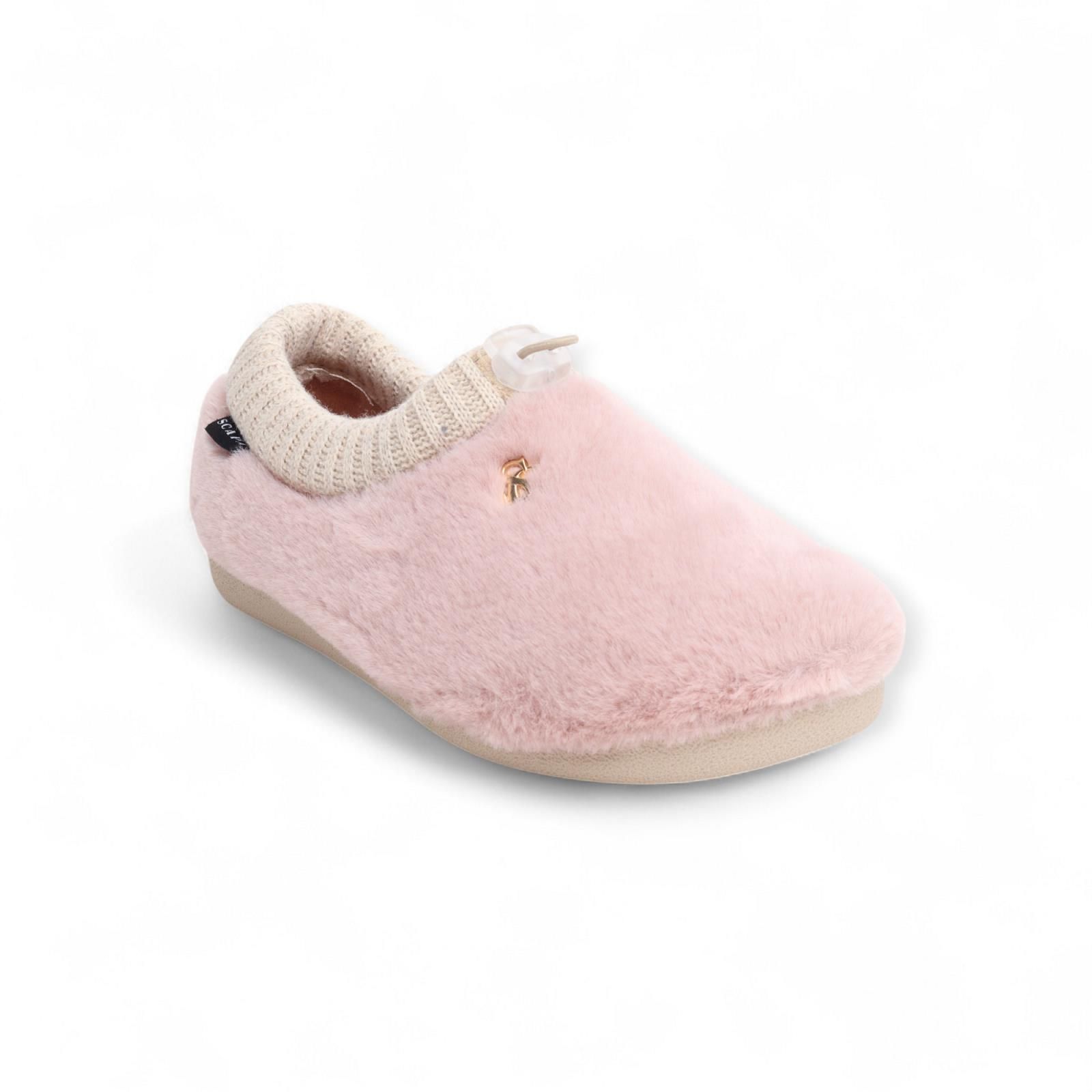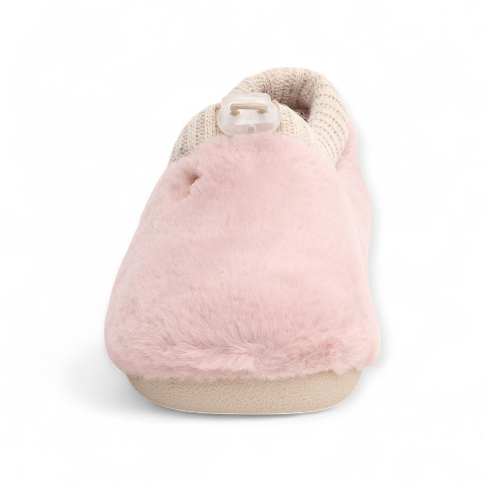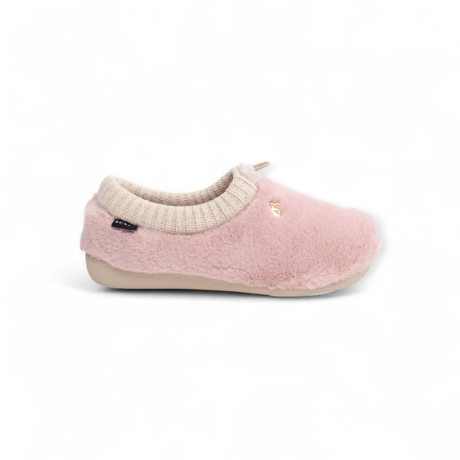 Pantoffel van Scapa voor dames. Deze pantoffel is in roze stof. Is volledig toe en de breedte kan je aanpassen door de beige rekkerstof rond de enkel. Is op een dikke antislipzool.