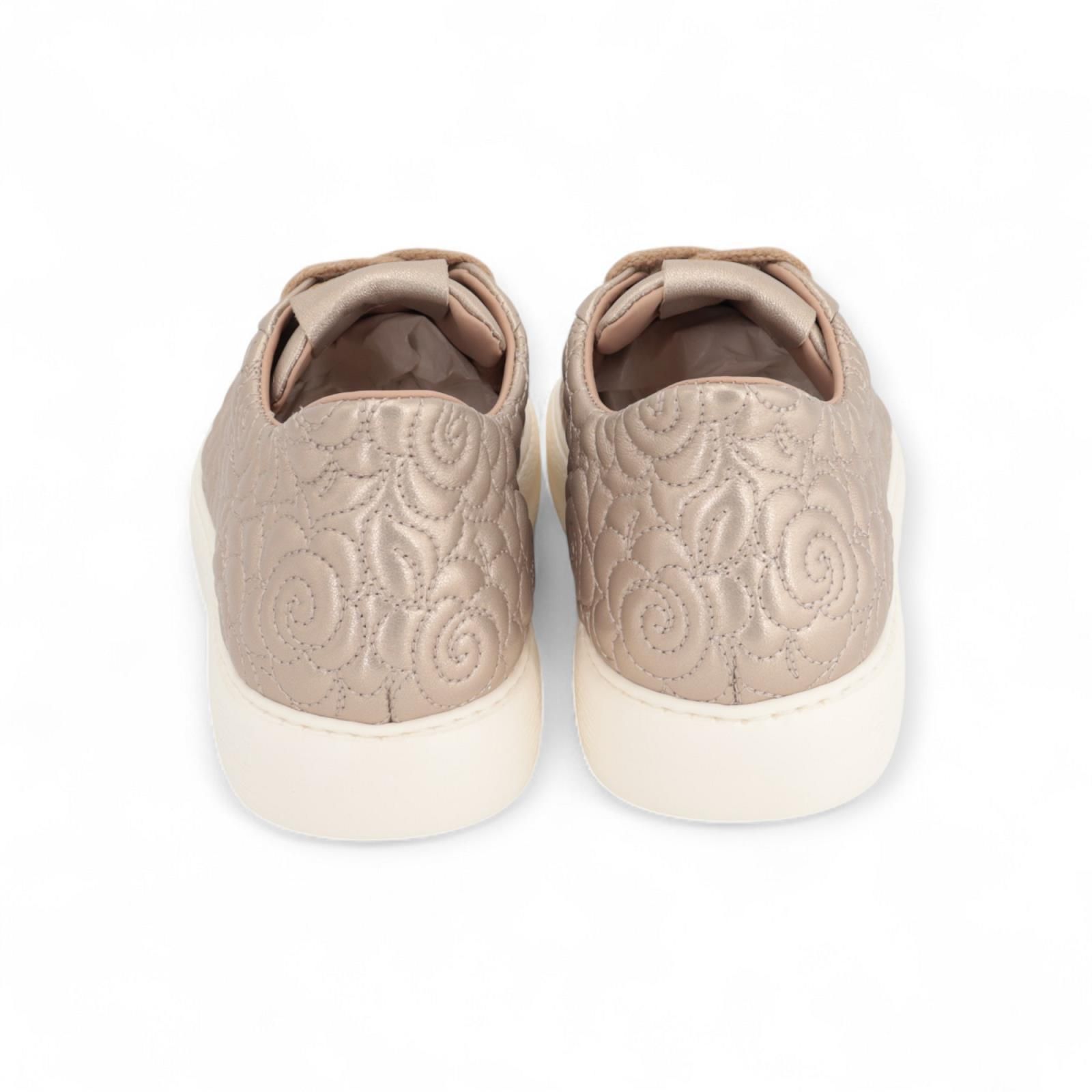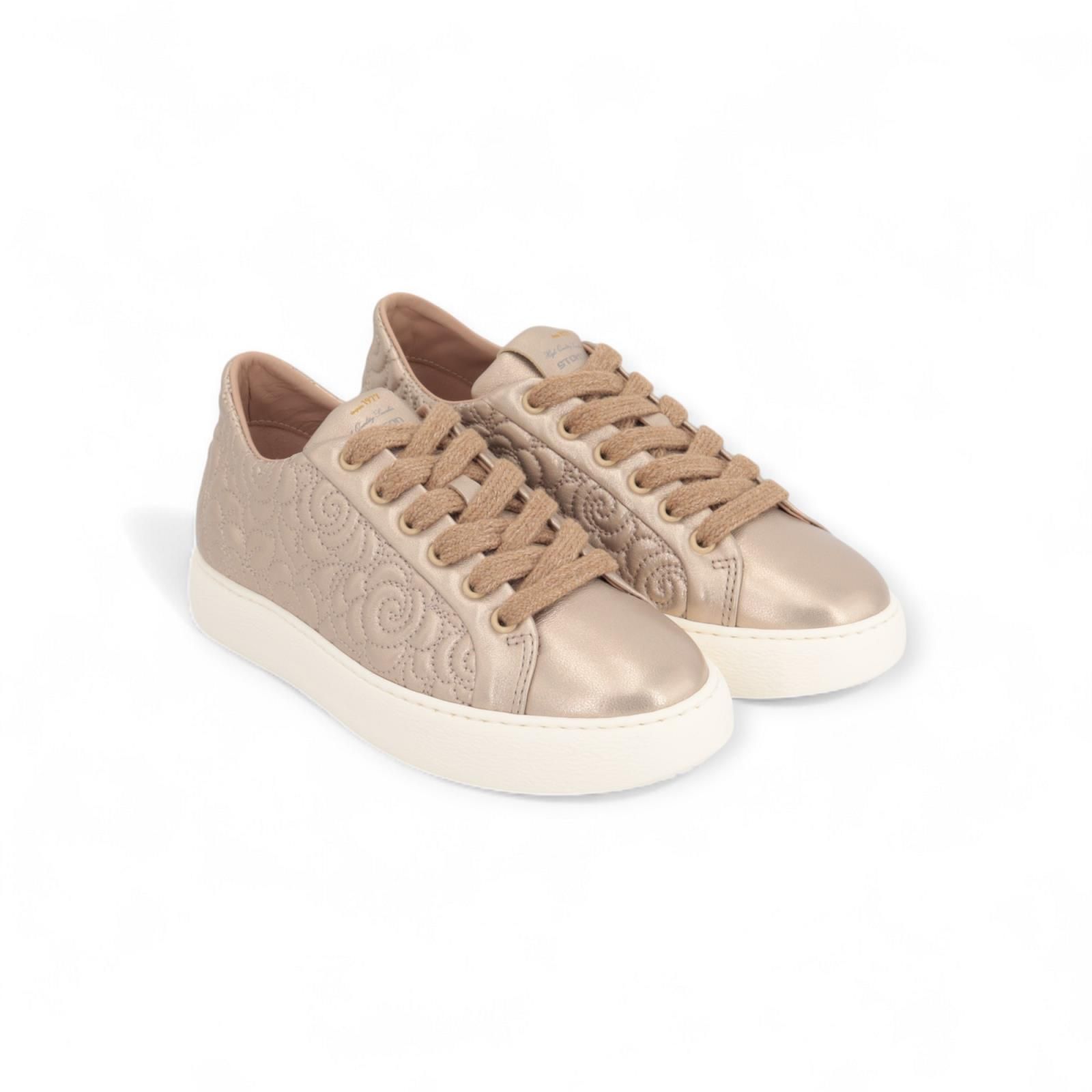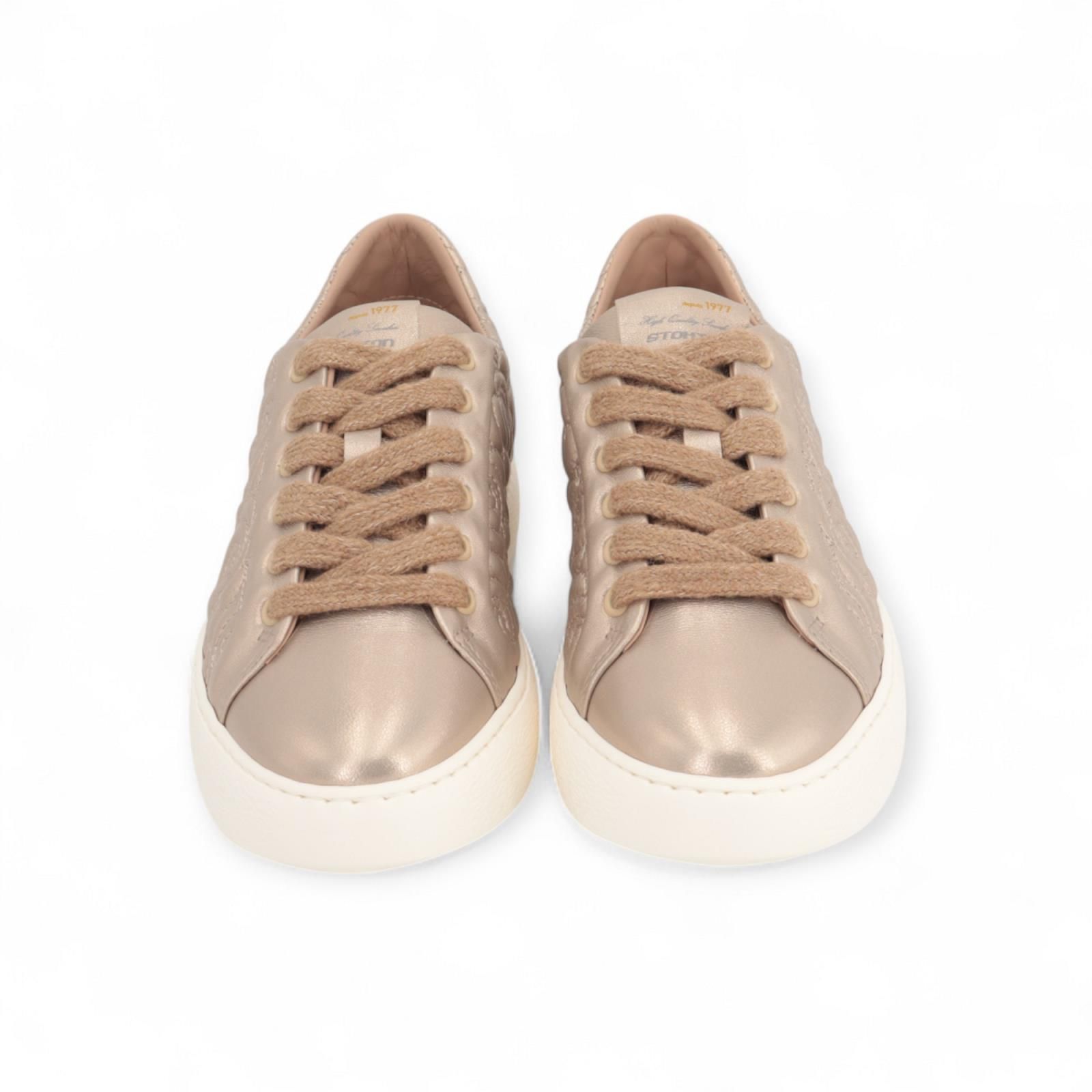 Sneaker Embroderey 214D van Stokton voor dames. Deze prachtige sneaker is in goud shining leer. Heeft aan de zijkant een mooi embrodery stiksel met camelkleurige veters. Is op een sportieve witte zool met een uitneembare binnenzool.