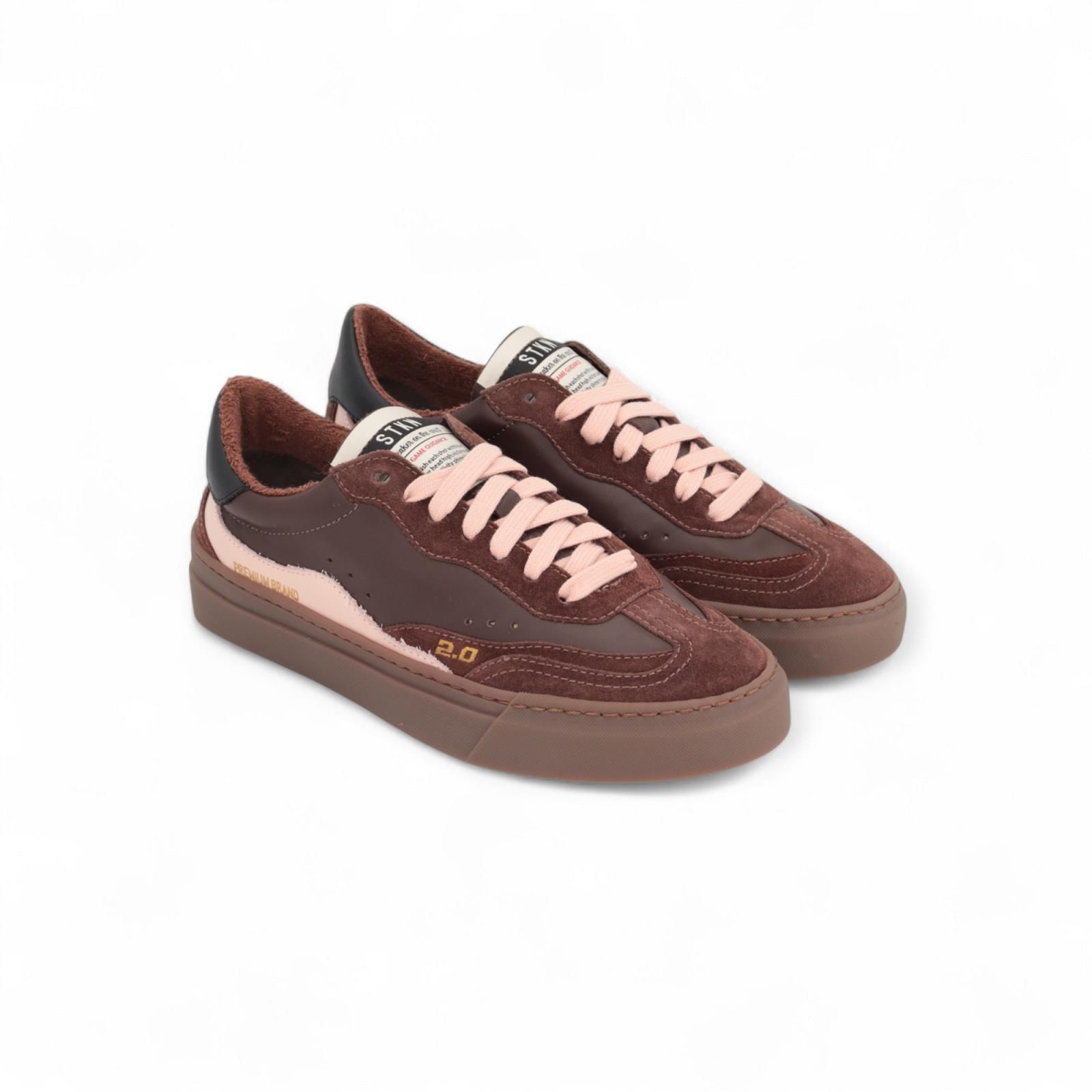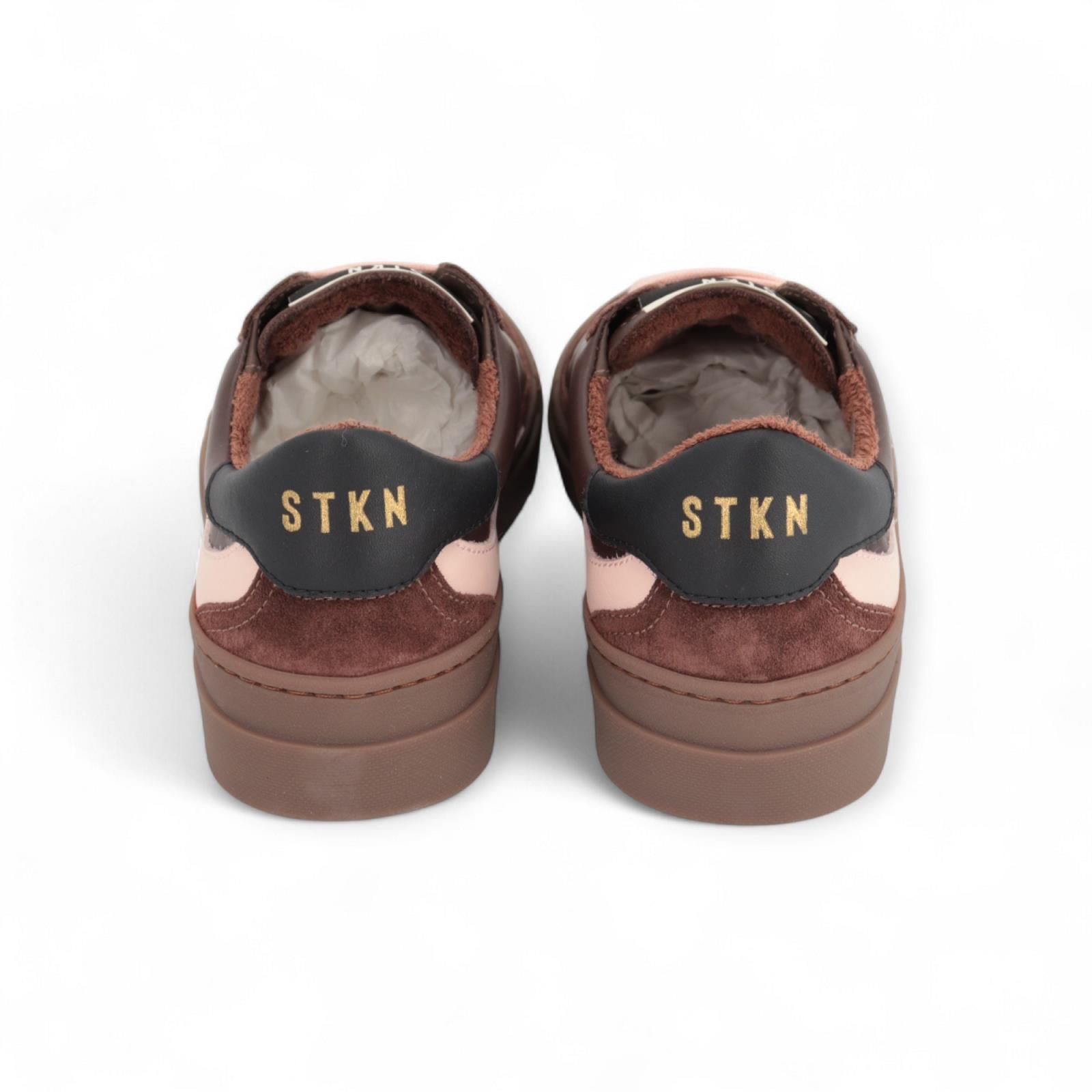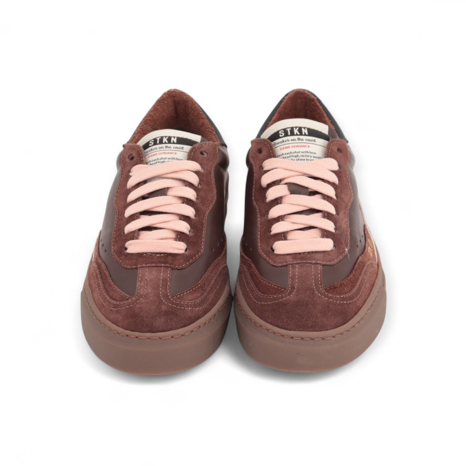 Sneaker Venus-D Flat van Stokton voor dames. Deze sneaker is in bordeaux leer met suède. Is mooi afgewerkt met stukken roze leer aan de zijkant en roze veters. De hielflap is in zwart met het logo STKN in goud. Is op een soepele bruine gummyzool en de binnenzool is uitneembaar.
