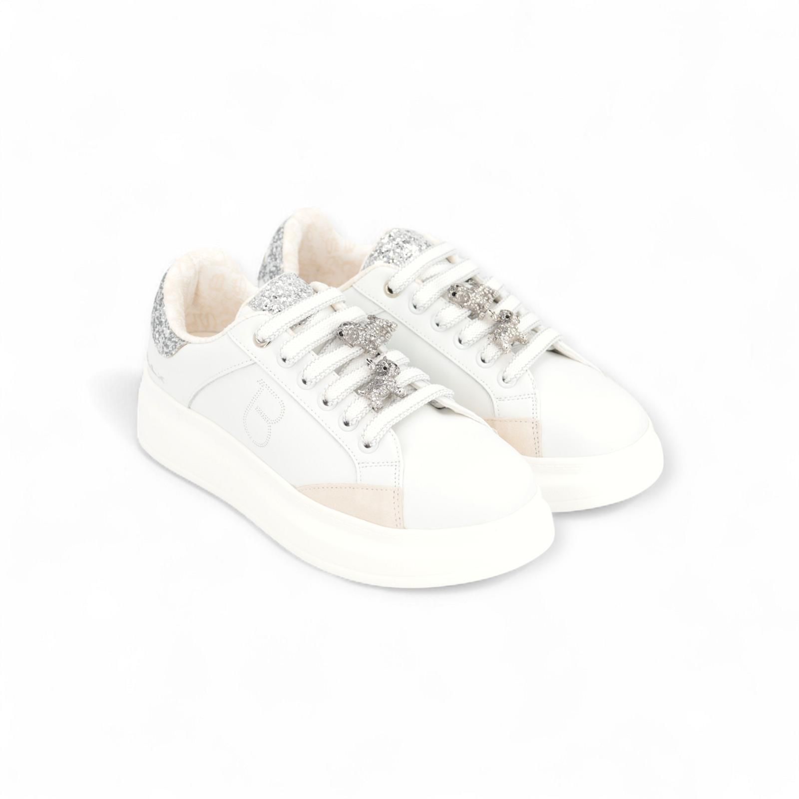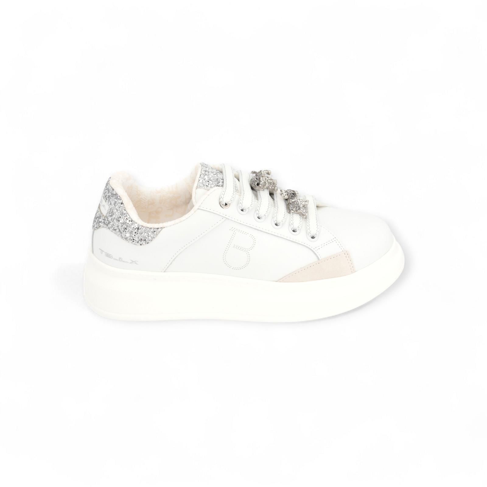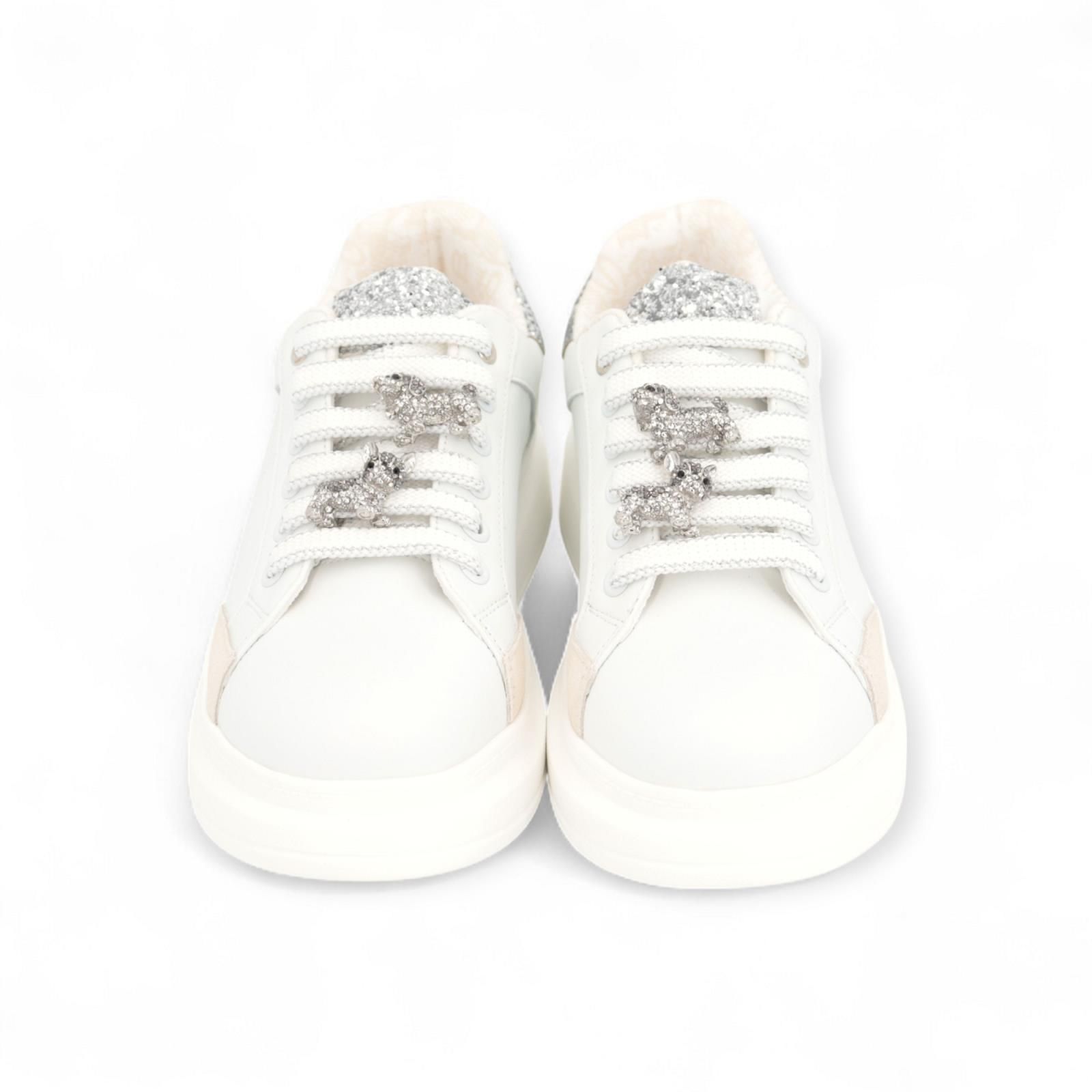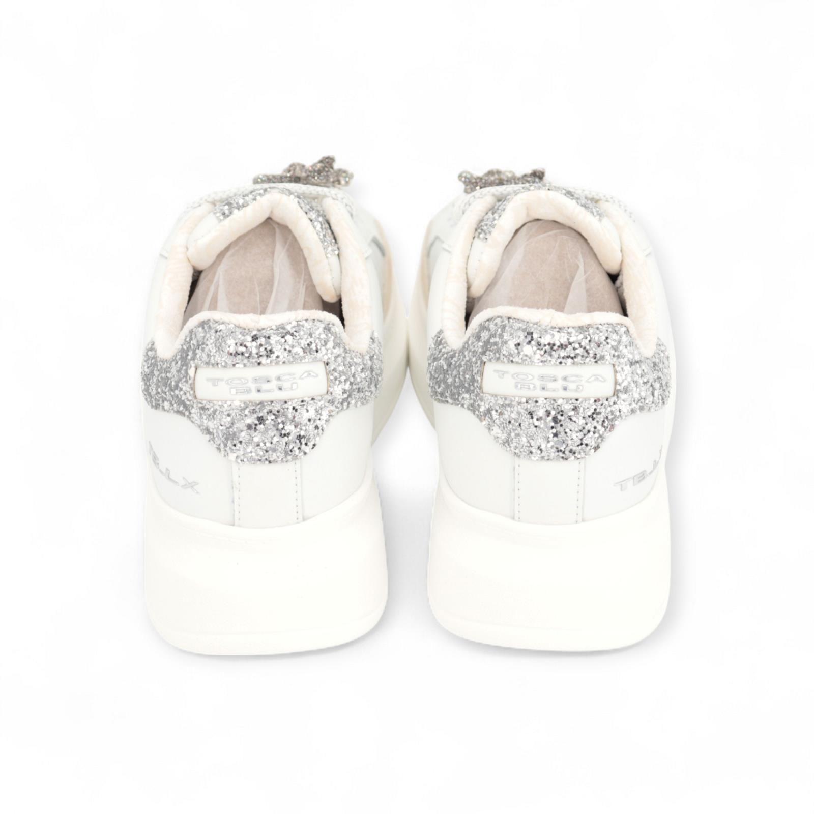 Deze witte sneaker Bellatrix van Tosca Blu is de perfecte casual chique sneaker. Wit met een zilverpalet op een plateauzool. Het heeft een geperforeerd monogram aan 1 kant en het logo in de glitterende hiellip. De veters zijn versierd met speelse charmes. De binnenzool is uitneembaar.