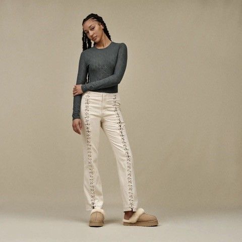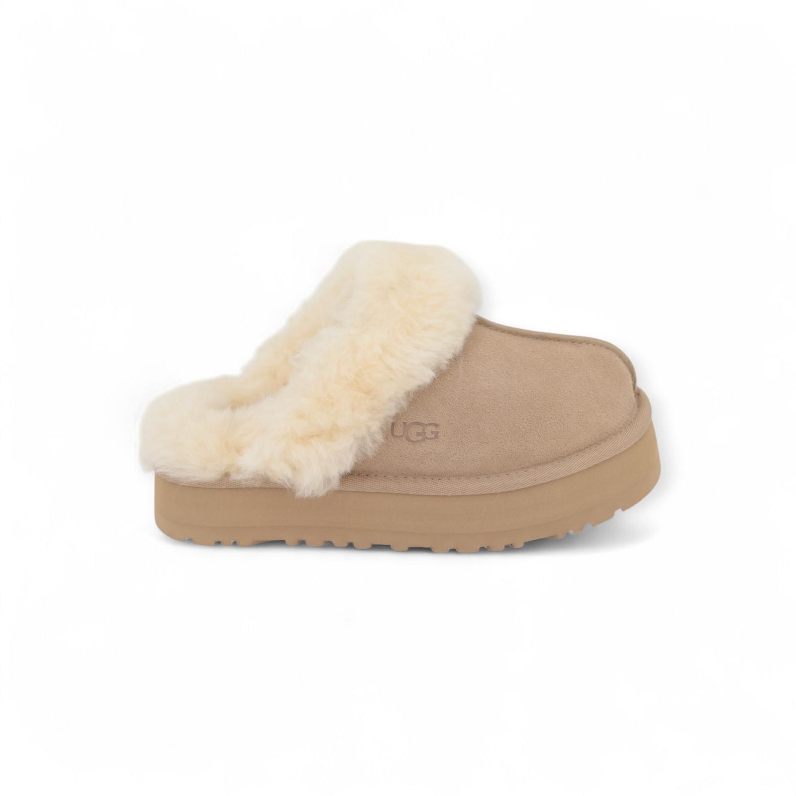 Pantoffel Diquette van UGG voor dames. Deze pantoffel is in zand suède met een wollen rand en wollen binnenkant. Is op een dikke plateauzool die zorgt voor demping en antislip.