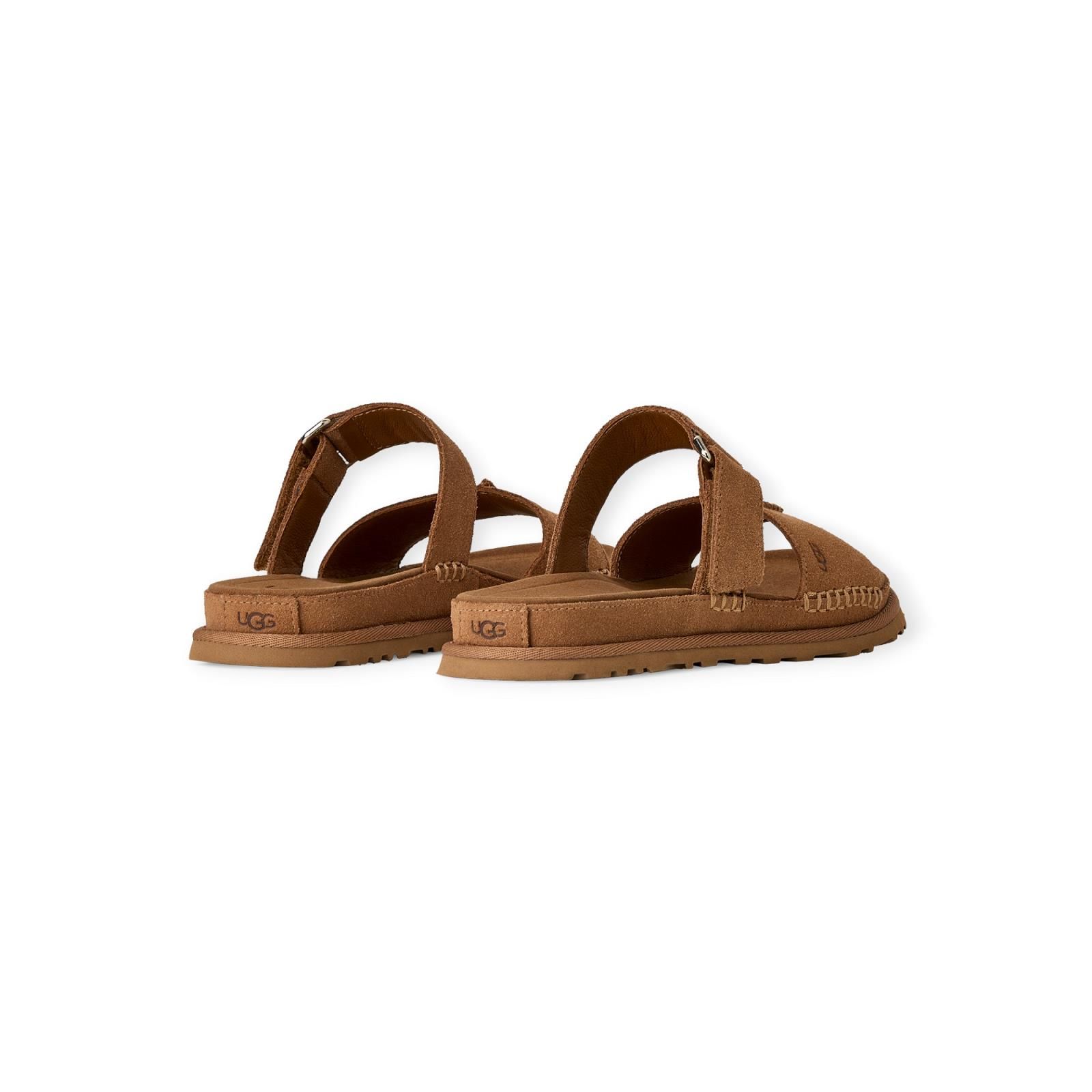 Slipper Goldengaze Slide van Ugg voor dames. Deze slipper is in cognac ‘chestnut’ suède. Heeft een laag profiel met een mooi gestroomlijnd, verfijnd silhouet. Voelt zeer aangenaam door de lichtgewicht buitenzool en het ultrazacht suède voetbed. Door het verstelbare bandje bovenaan heb je de perfecte pasvorm. Dit model is dé ultieme comfortabele zomerslipper.