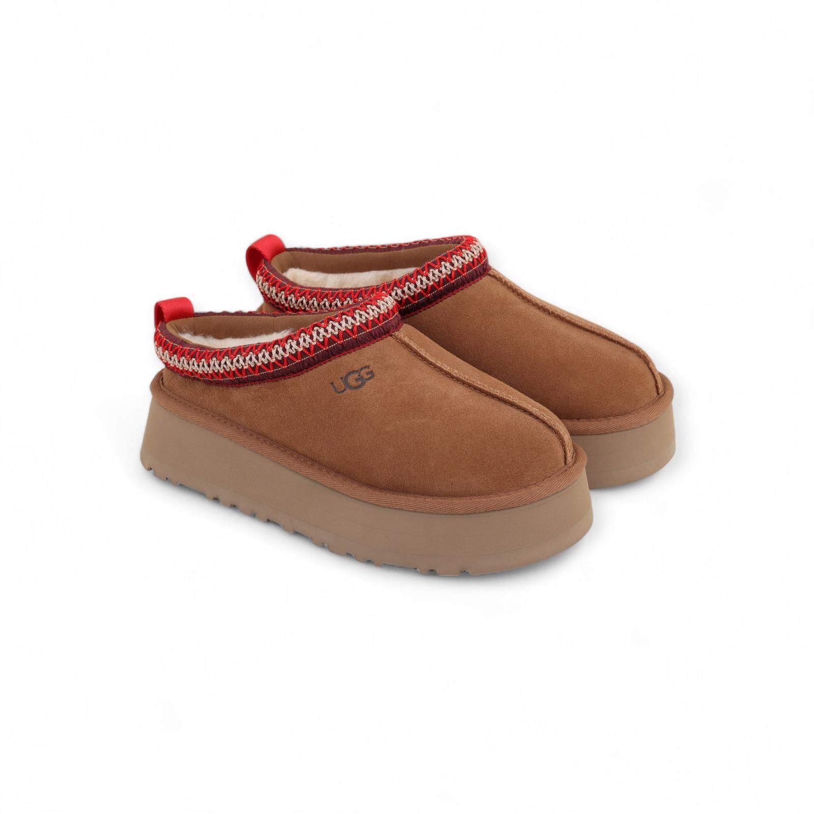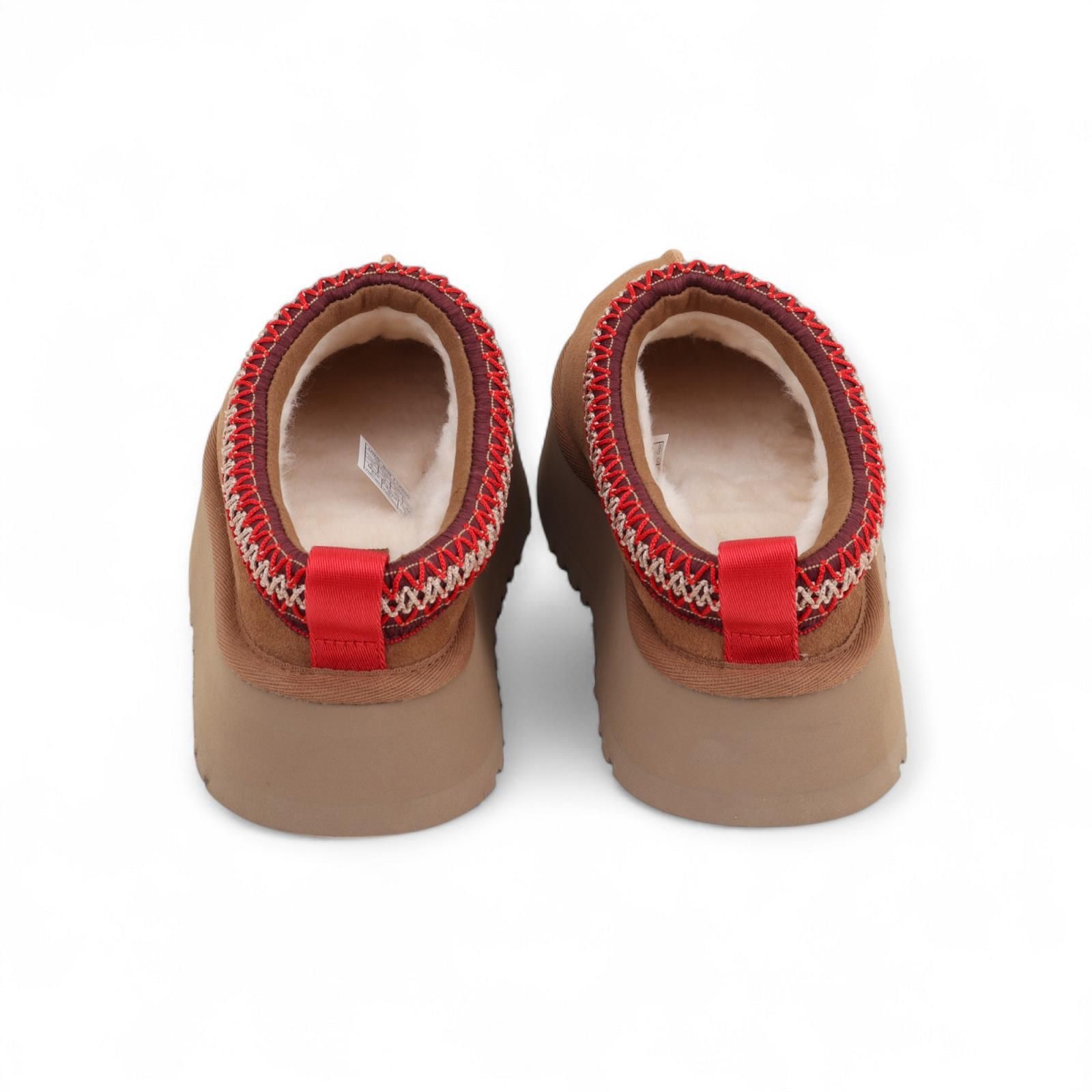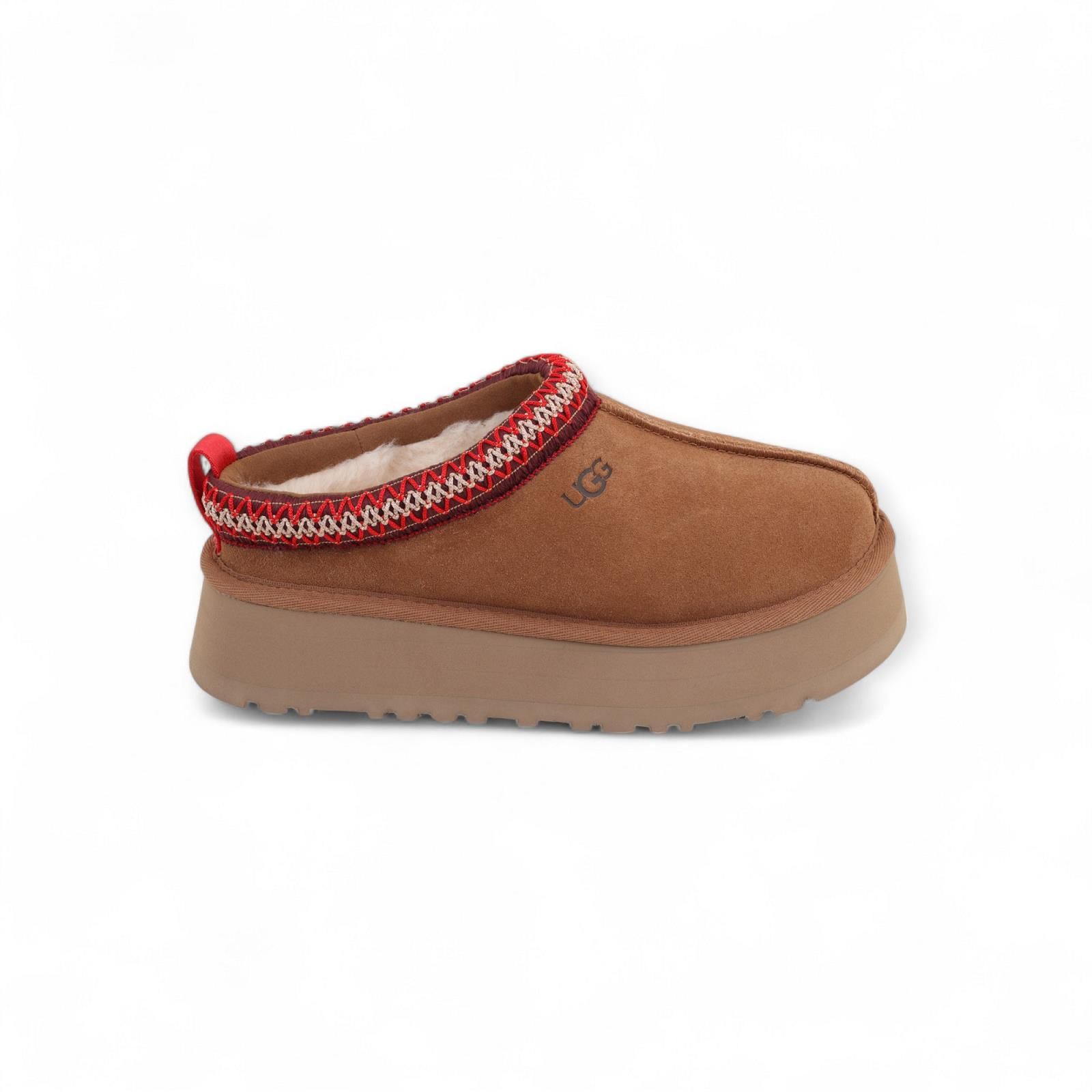 Ugg Tazz pantoffel voor dames. Deze in cognac suède instapper is met wol binnenin en afgewerkt met het typische UGG stiksel en naad als accent. Is op een plateauzool die gemaakt is van suikerriet.